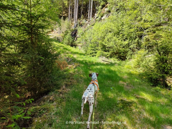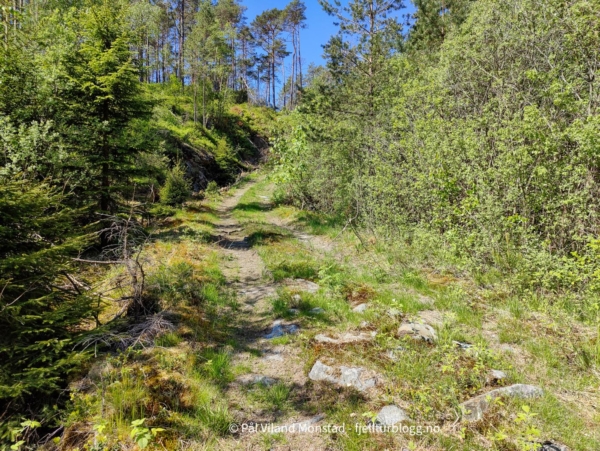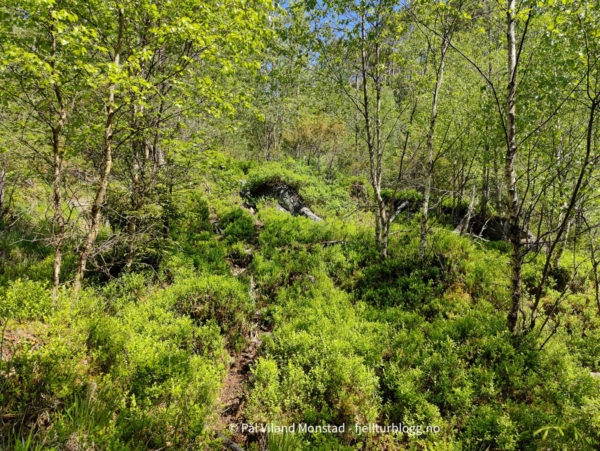 Om det var en sti eller et dyretråkk er ikke godt å si, men ved å følge tråkket tok vi stadig høydemeter i retning toppen. Noe uryddig terreng rett før toppen, men likevel ikke store utfordringer med å finne fram.