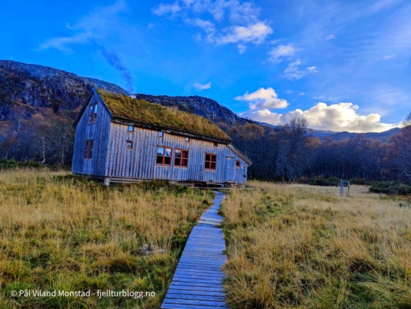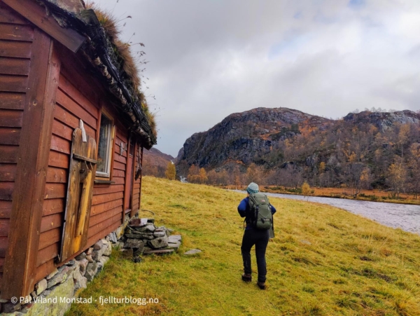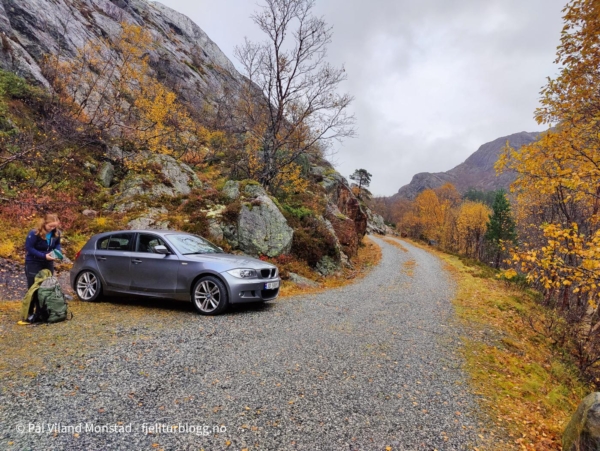 Bilen ble parkert i enden av veien innenfor Mostøl. Mostøl kommer du til fra Nesflaten og veien mot Bråtveit/Vetrhus. Herfra går det merket DNT-rute til Bleskestadmoen. Med på denne todagersturen var Silje.