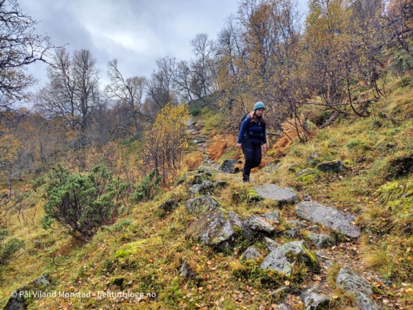 Stien var lettgått der den gikk i relativt flatt terrent langs sørsiden av Moltenuten og fram til kanten av Valajuv. Stien fortsatte ned i det som etter hvert ble bjørkeskog med svære trær. Bleskestadmoen dukket ganske brått fram mellom trærne, i det hytta lå tett inntil skogskanten. Videre var det mo, altså grasmark uten trær, og flere gamle stølshus i tillegg til de to turisthyttene.