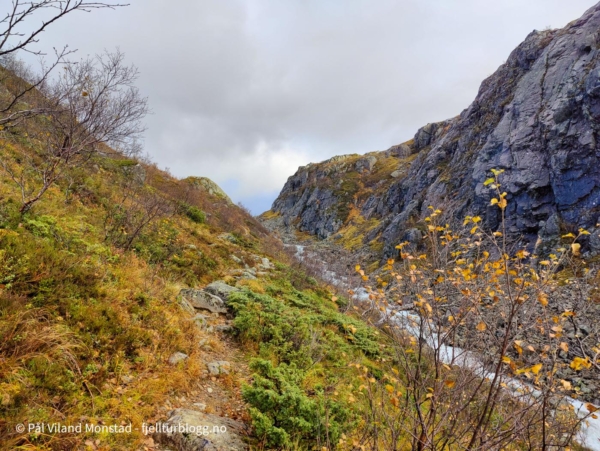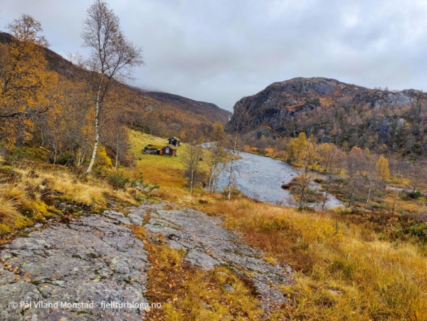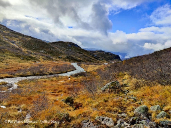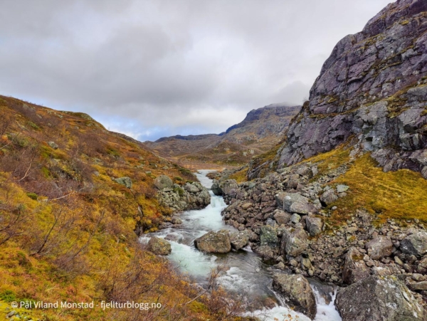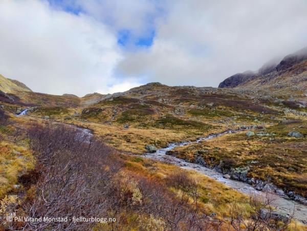 Fram til Skitstølen gikk det i jevn stigning. Fra Skitstøl til Krokvatnet var det noe mer stigning. Stien gikk høyt over elva som gikk flomstor i juvet nedenfor. Oppe ved Krokvatnet flatet det ut. Et utrolig vakkert område med Krokvatnet på motsatt side av elva. En mindre elv bukta seg videre innover dalføret. Jeg hadde planer om tur inn langs Krokvatnet til Brudlenutane og Urvatnet i sommer. Det rakk jeg ikke, så det blir forhåpentligvis til sommeren.
