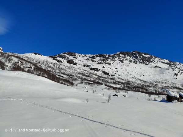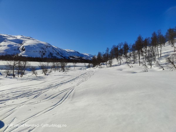 Deretter ble det sikksakk-kjøring ned bjørkelia, før vi igjen fant løypetraseen nede på flatene ved stølene. Herfra gikk det radig tilbake til bilene, med et fint vinddrag i ryggen.