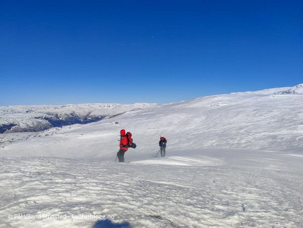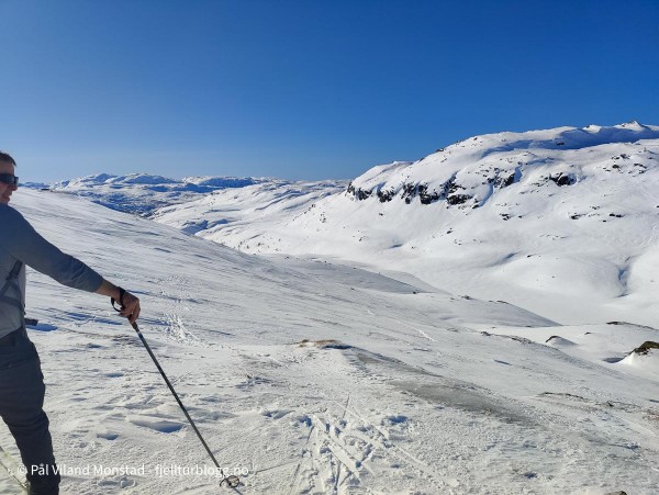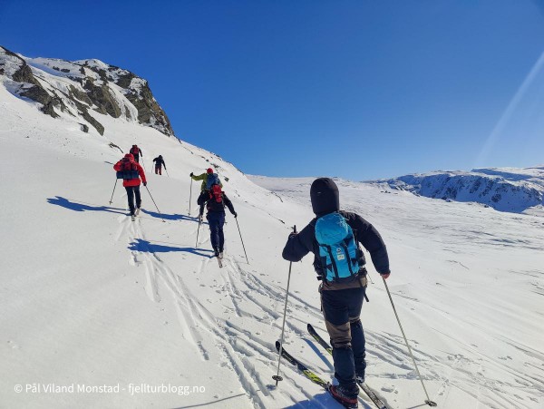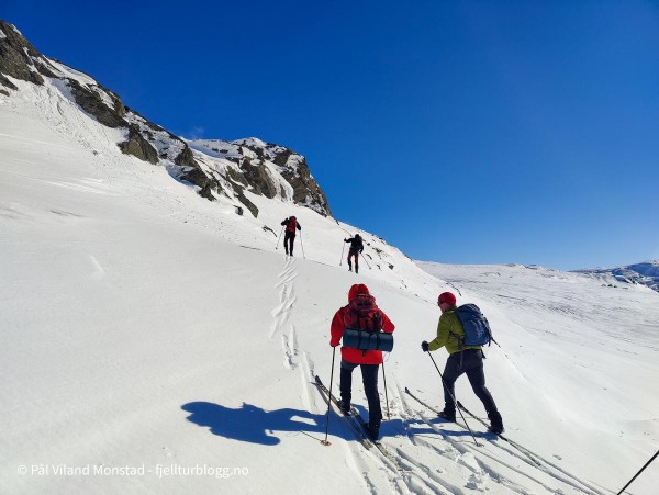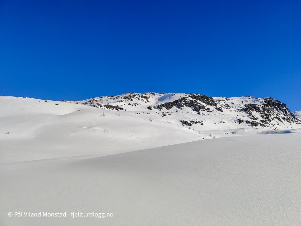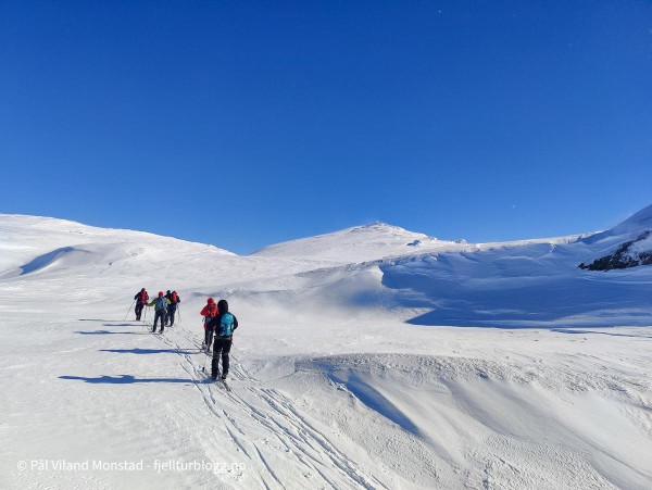 Innover mot Dyrskar flatet det ut, før vi tok østlig retning bratt opp mot toppen. Sola hadde jobbet mindre med snøen her i høyden, og det var mye tørr snø. Etter hvert som vi tok høydemeter, økte vinden i styrke, og underlaget ble mer hardpakket.