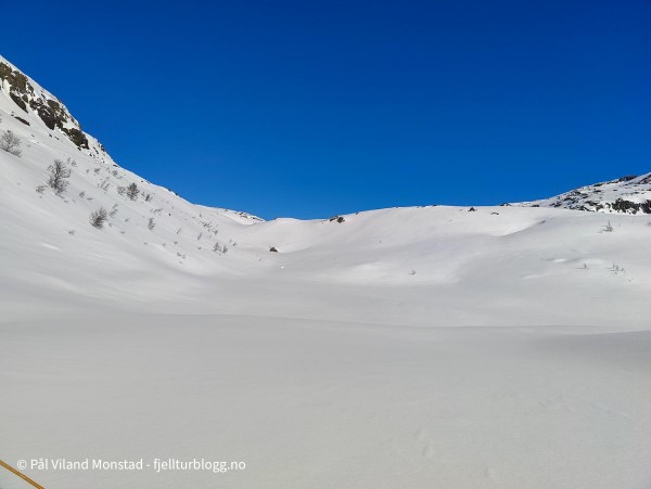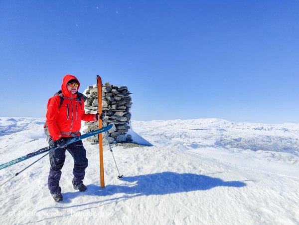 Et stykke under toppen måtte vi ta av skiene, for å komme opp ei smal renne. Deretter fulgte et ganske flatt parti, før vi kunne ta de siste hundremetrene mot toppen, i svært sterk motvind. Snøråket pisket imot, og det var bare å snøre igjen og dekke ansiktet til. Besøket på toppen/varden ble svært kortvarig. Ingen grunn til å risikere å blåse over ende. Vi kom oss etter hvert nedover igjen. Litt lugging med feller over vekselvis løssnø og hardpakket skare/is, men vi kom helskinnet ned i inngangen til Dyrskar, hvor vinden løyet og matpause nummer to ble gjennomført i fantastisk flott vinterlandskap.