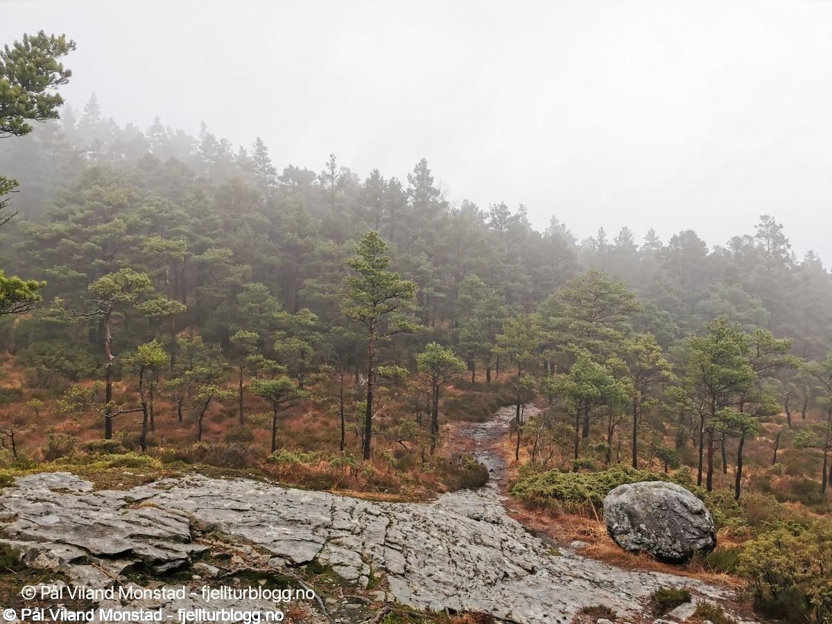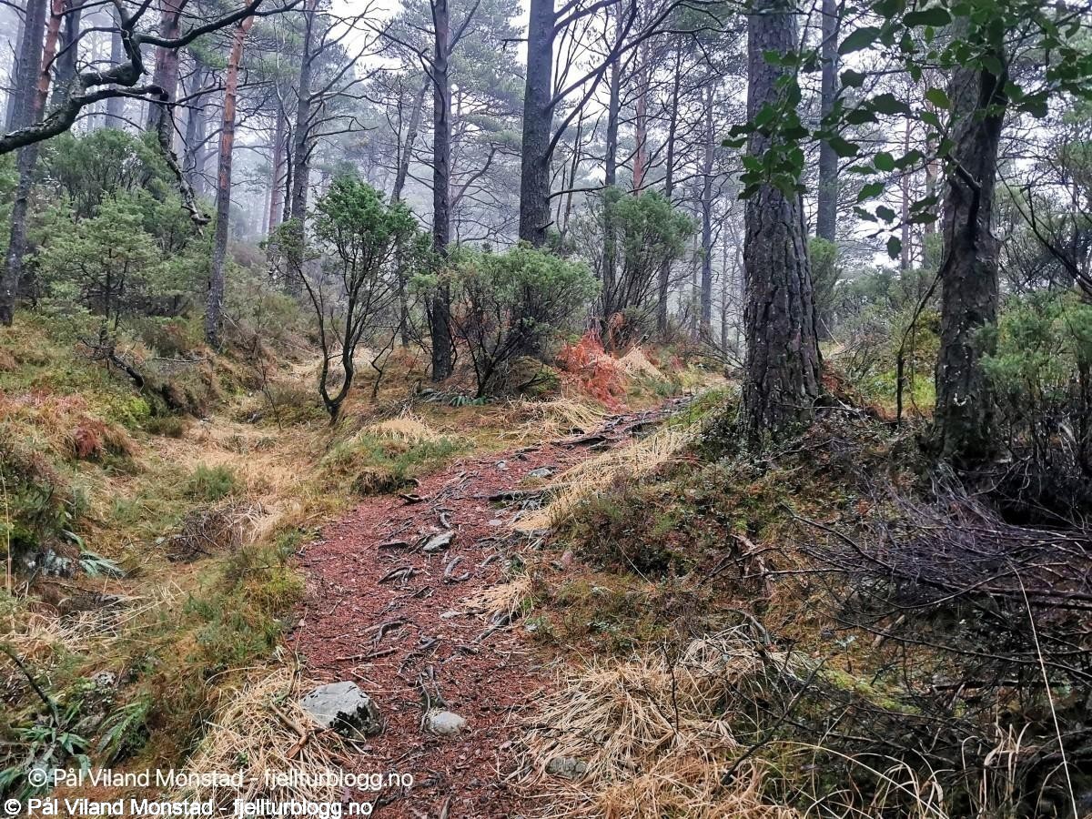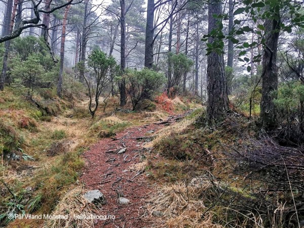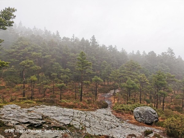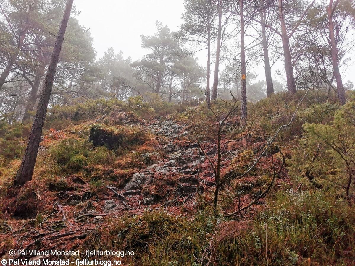 Turen gikk i fint skogsterreng, uten særlig bratte stigninger noe sted. Jevn stigning. Ikke så mye utsikt, siden det er mye skog. På dagens tur var det dessuten en del tåke som hindret sikten.