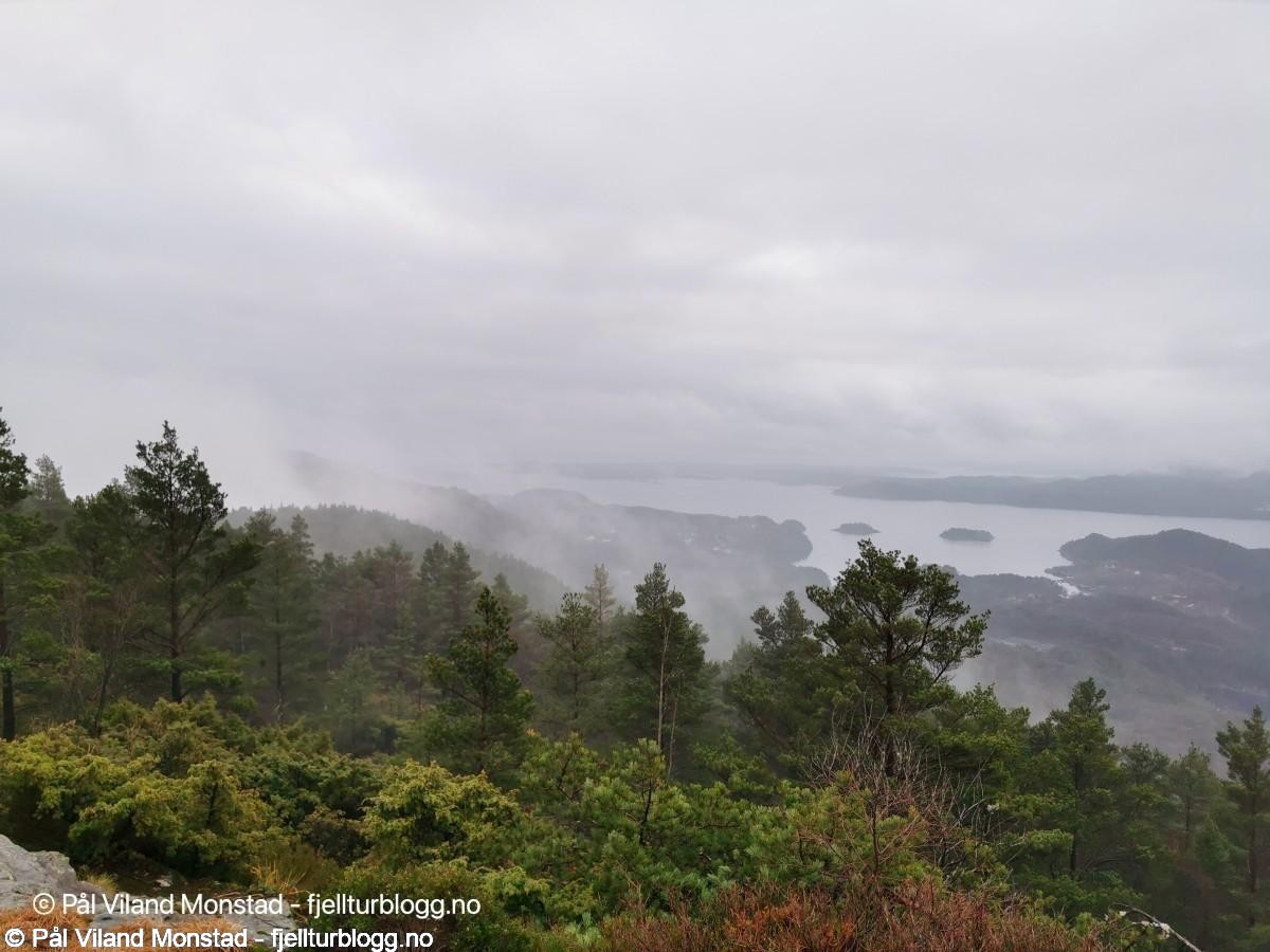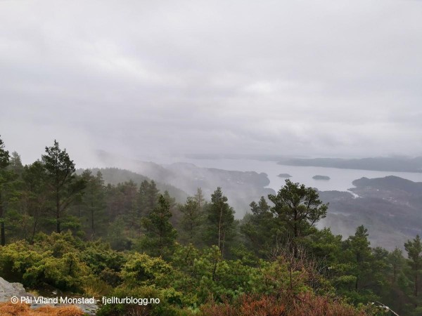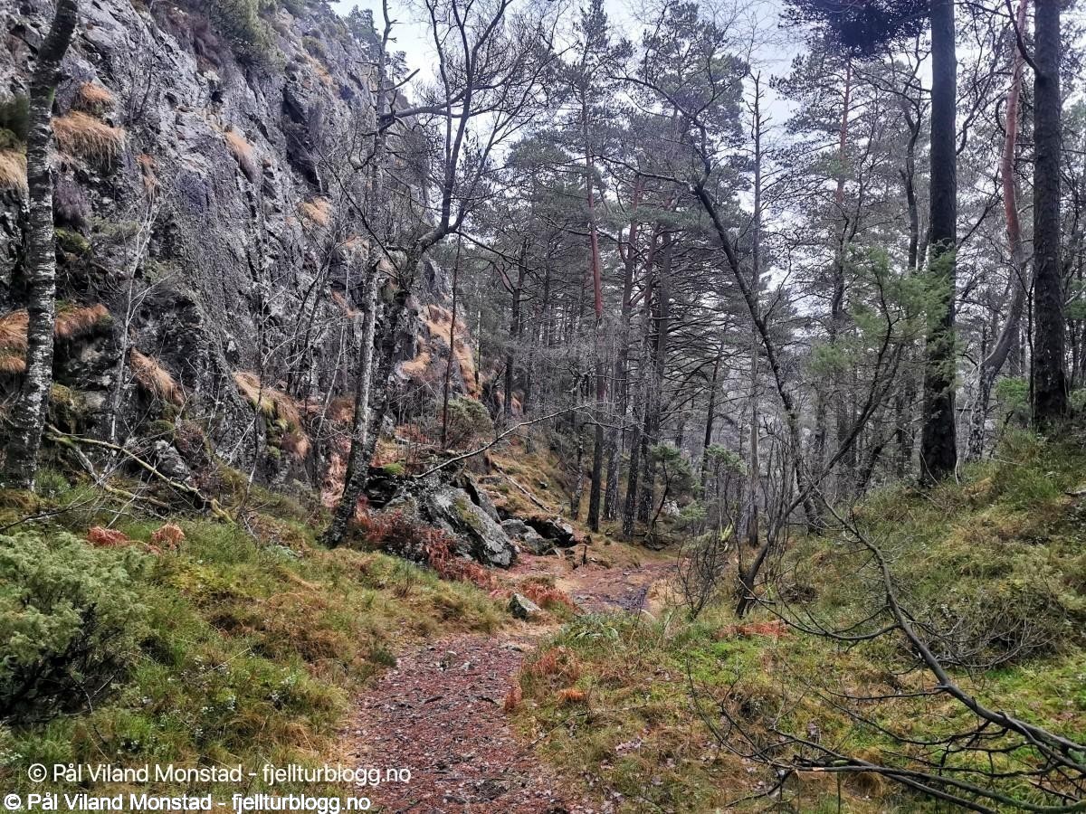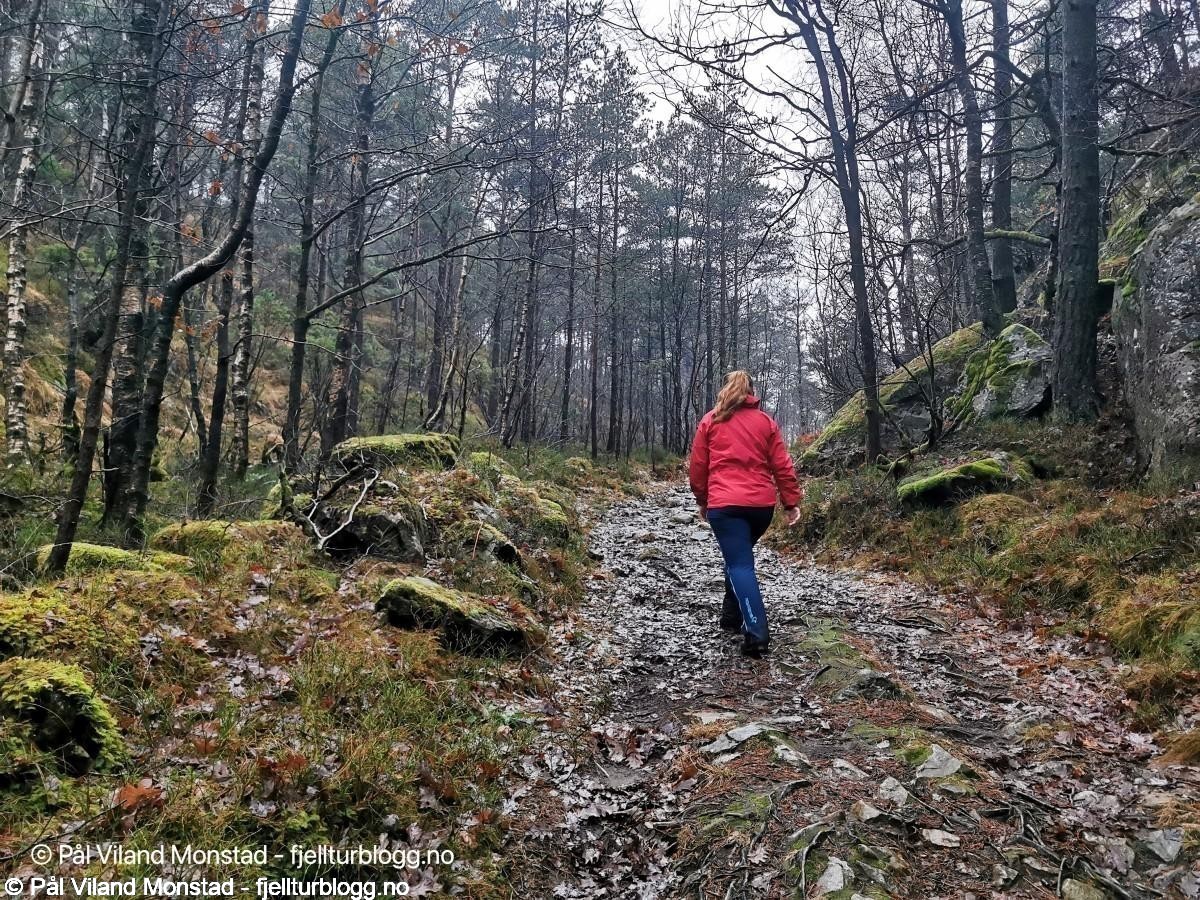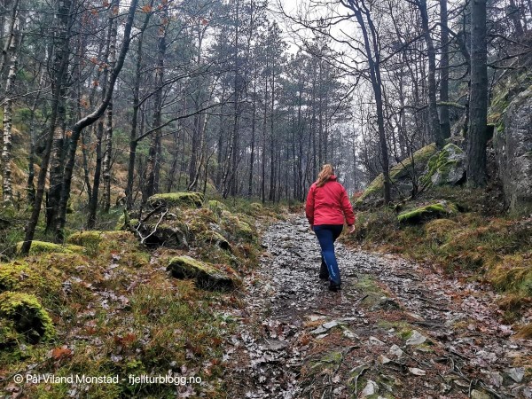 Turen gikk i fint skogsterreng, uten særlig bratte stigninger noe sted. Jevn stigning. Ikke så mye utsikt, siden det er mye skog. På dagens tur var det dessuten en del tåke som hindret sikten.