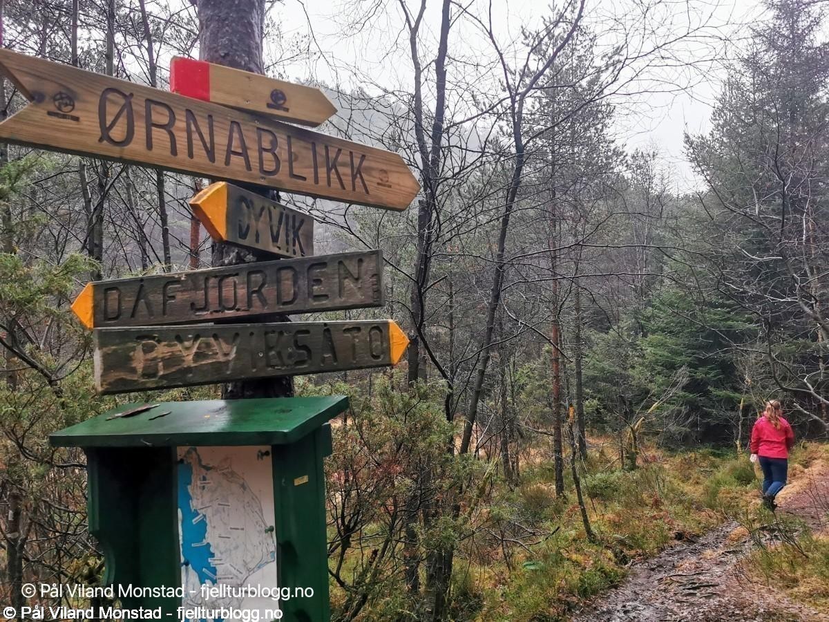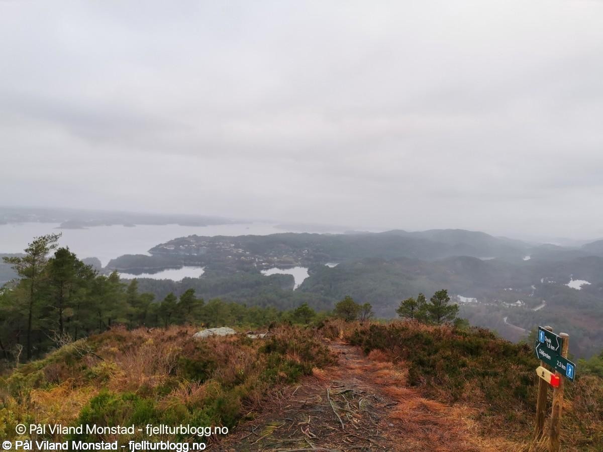 Bilen ble parkert i en lomme på veien mellom Sagvåg og Fitjar. Skilt rett over veien viste hvor stien startet. Det var i grunnen bare å følge merket sti fra start til mål, og tilbake igjen.