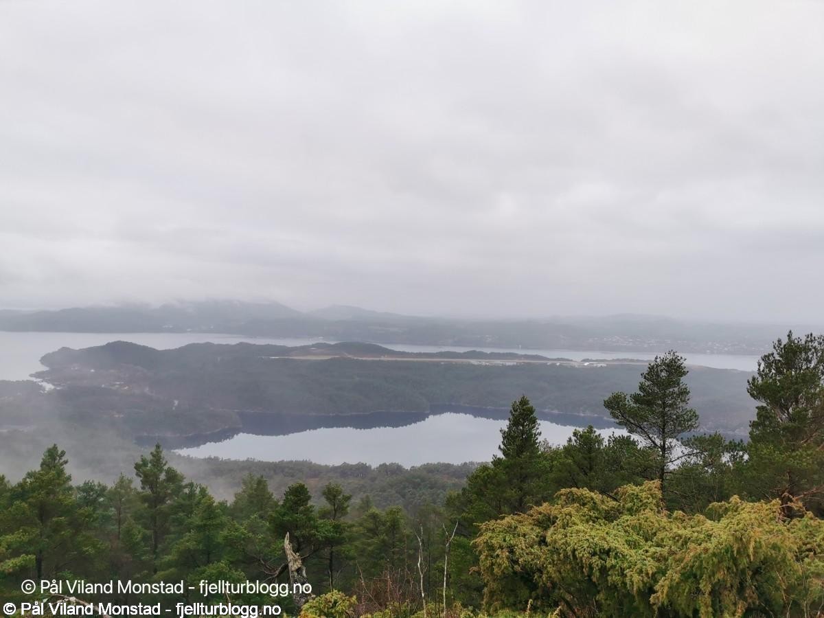 Fra toppen var det utsikt mot flyplassen på Sørstokken og mot brua over til Bømlo. Litt videre, ned i lia, skal det ligge flere hytter til utleie: Himmelhyttene. Det var skilting mot disse på hele turen, men vi tok ikke turen videre for å finne ut mer. Jeg sjekket himmelhyttene.com da jeg kom hjem. Spennende, sjekk selv!