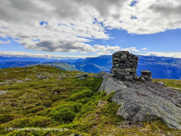 Toppen, 1006 moh, hadde en flott varde, og utsikt mot Bratlandsdalen og dalføret jeg hadde kjørt opp fra Nesflaten. Begge dalførene er omkranset av høye fjell, så noen dalbunn var umulig å få øye på.