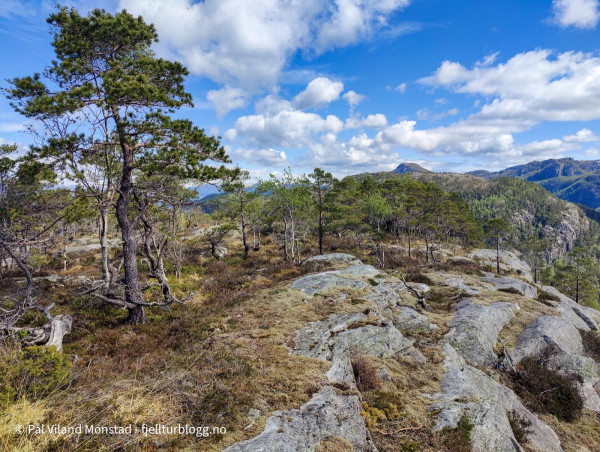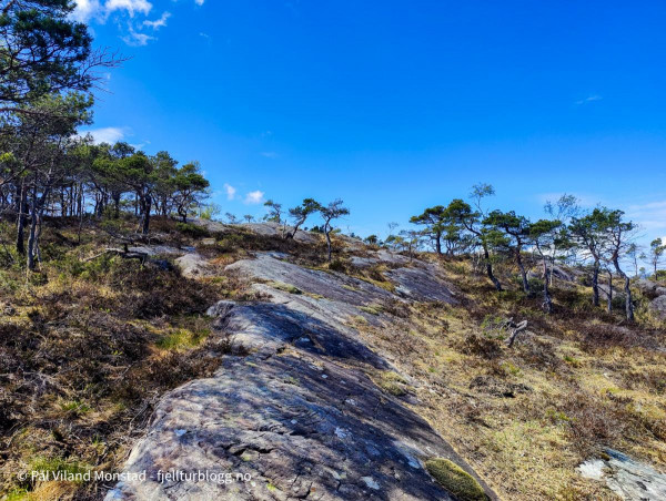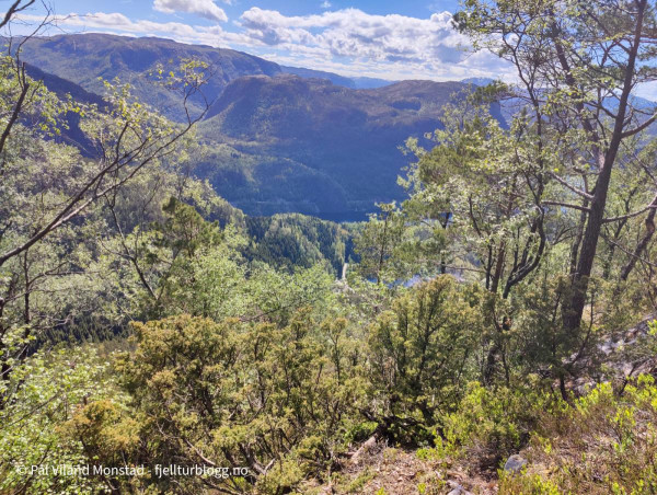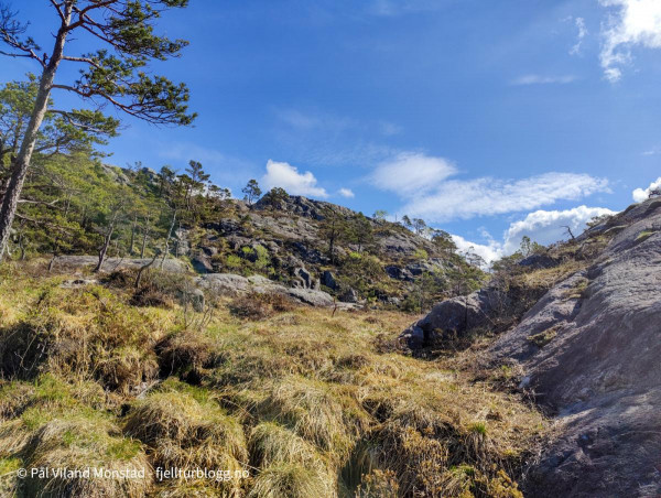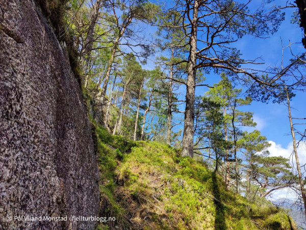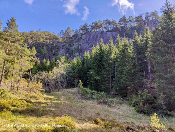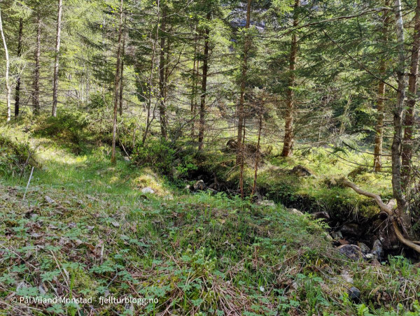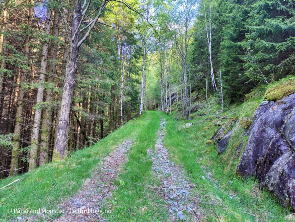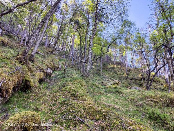 Turen startet opp fin skogsvei. Lite stigning, og lett å gå i det varme været. Tipper det var rundt 15 grader ved avmarsj. Det tok ikke lange stykket oppover Hamradalen før det flatet ut. Veien fortsatte innover, selv om den ikke var tegnet inn på kartet. Jeg fulgte den til endes, og gikk deretter til høyre, i ytterkanten av granfelet langs en loddrett bergvegg. Granskogen var kjapt unnagjort, og det ble grei li videre oppover. Tildels svært bratt og småkupert. Ved tregrensa flatet det ut. Her dreie jeg i nordøstlig og senere nordlig retning mot toppen. Det var lett å gå oppover bergryggen.