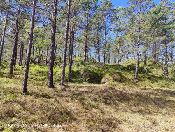Etter matpause ved varden på toppunket av Fuglanuten, 507 moh, tok jeg samme rute ned til der veien sluttet nede i dalbunnen. Her fant jeg en bekk, og drikkeflaskene som nå var tomme ble fylt opp igjen. Turen fortsatte mot neste topp på vestsiden av dalen. Også her gikk det bratt oppover, og terrenget var kupert og ikke helt enkelt å navigere i. Ved bekken fant jeg faktisk en rødmerket sti, men den forsvant etter kort tid. Diverse dyretråkk førte i noenlunde riktig retning. Begge toppturene egner seg dårlig uten kart. Det var lett å havne i svært bratt terreng med stup og skrenter.