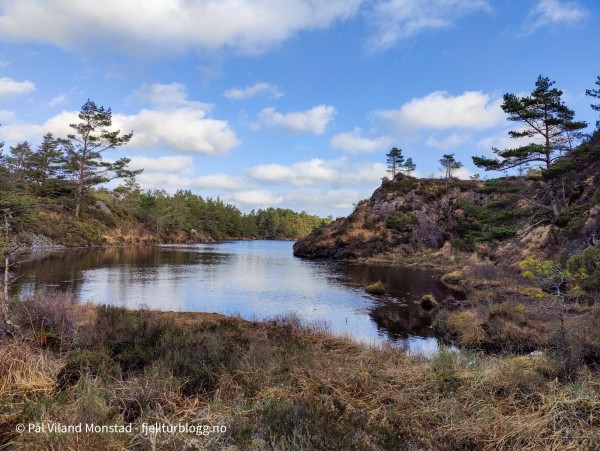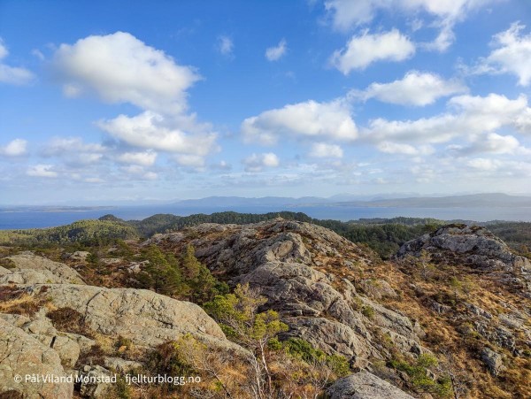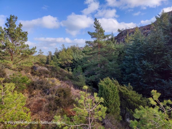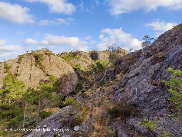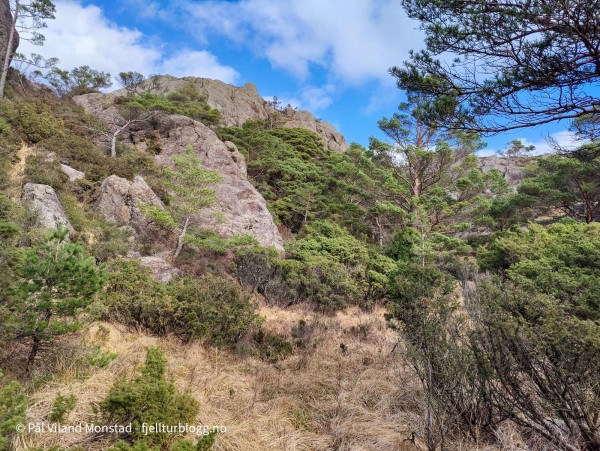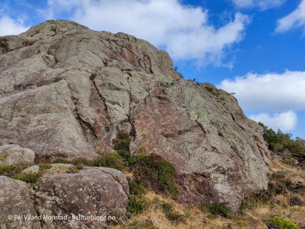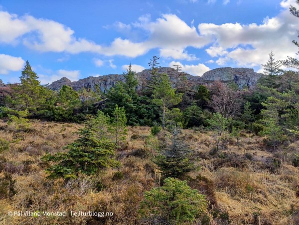 Etter å ha tatt turen til Bergesfjellet, sto nabotoppen for tur. Jeg hadde kjørt et kort stykke videre på fylkesvei 541, i retning Langevåg, før jeg tok av etter avkjøringen til skytebanen. Bilen ble parkert på en bit av gamleveien, og jeg la ut i myrterrenget i retning stien som var inntegnet på kartet. Etter noen hundre meter traff jeg den. Stituren ble kortvarig, for jeg tok ut i umerket terreng etter en stund siden stien så ut til å gå i feil retning. Jeg fortsatte inn et søkk. Det var et granfelt her, og jeg gikk langs kanten oppå en liten bergrygg for å unngå den tette granvegetasjonen. Etter hvert kom jeg til et tjern. Her tok jeg opp på høyre side, og videre opp et nytt søkk og langs et bekkefar. Det bar jevnt oppover, og etter hvert ble det mindre vegetasjon og lettere å gå. Det var svært kuppert terreng, og jeg gikk flere smådaler på vei mot målet.