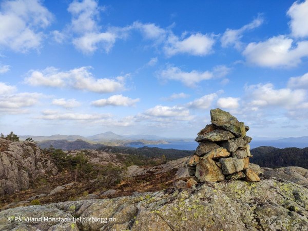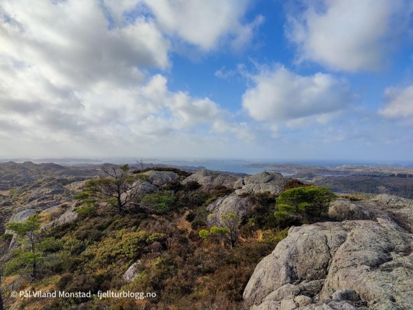 Vel oppe var jeg usikker på hva som var det høyeste punktet. Det kunne se ut til at det var høyest akkurat der jeg kom opp etter klyving, selv om ingen varde markerte toppen. Det var derimot flere varder bortover på knattene lenger øst. Jeg tok turen innom to av de, men de var tydelig lavere enn der jeg kom opp. Jeg tok en litt annen rute ned, men kom etter hvert inn på den ruta jeg hadde tatt opp.