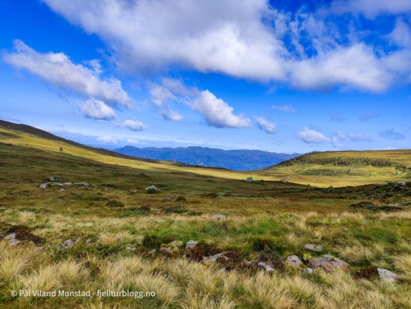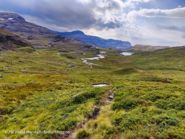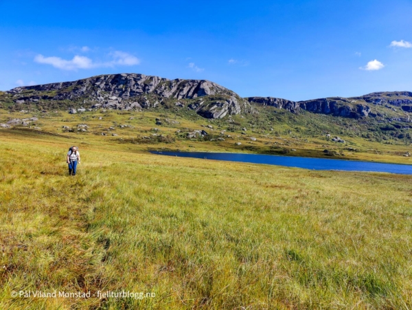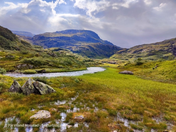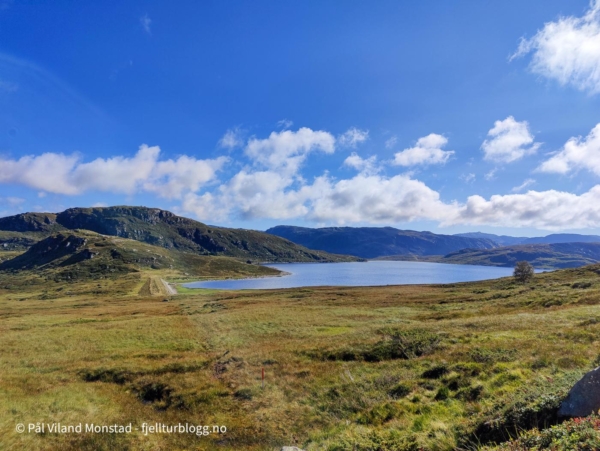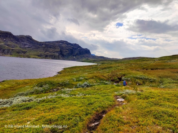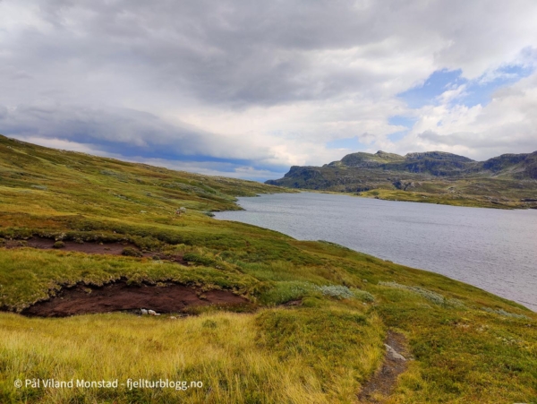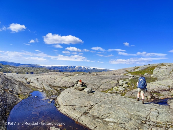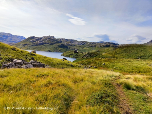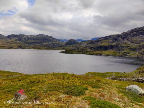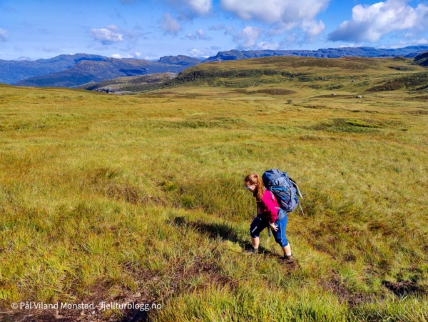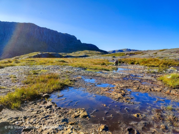 Fra hytta kunne vi se en varde på toppen i sørvest. Vi skulle med andre ord starte dagen med skikkelig stigning. Jeg har gått denne etappen før, se omtale her. Etter å ha passert elva ved utløpet av Blomstølsvatnet på bro, var det ganske kupert, før det ble mer jevn stigning oppover.