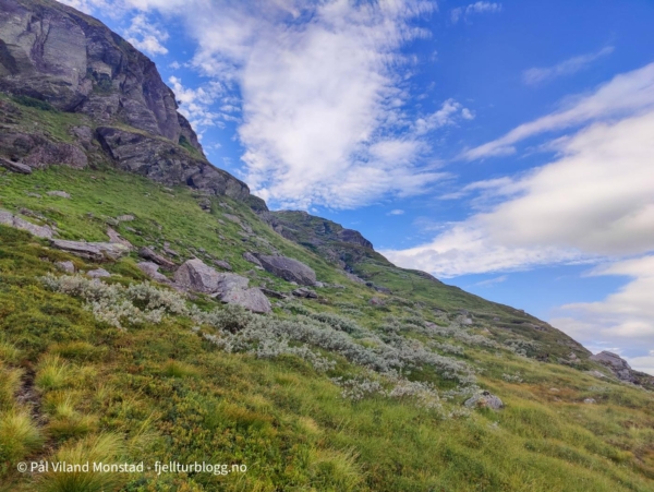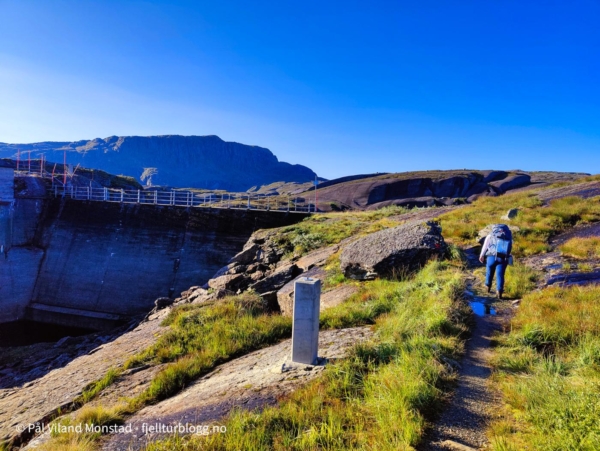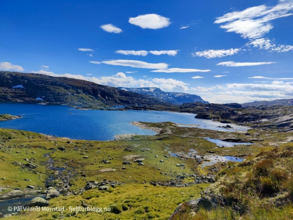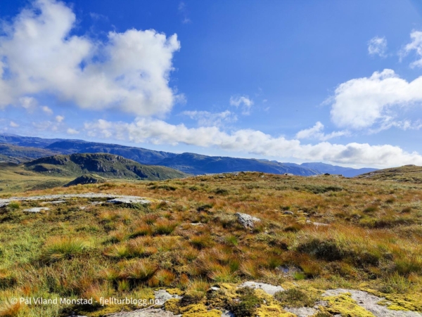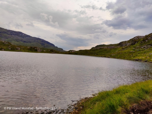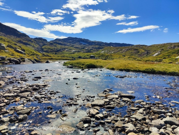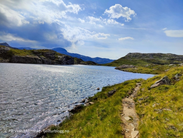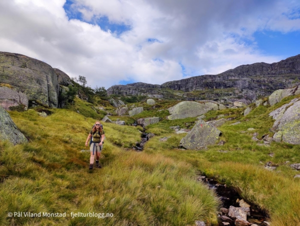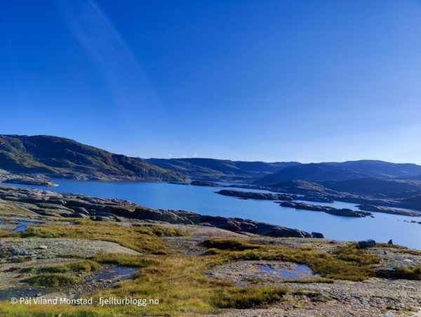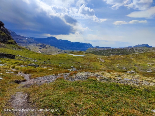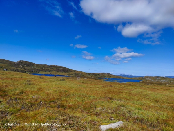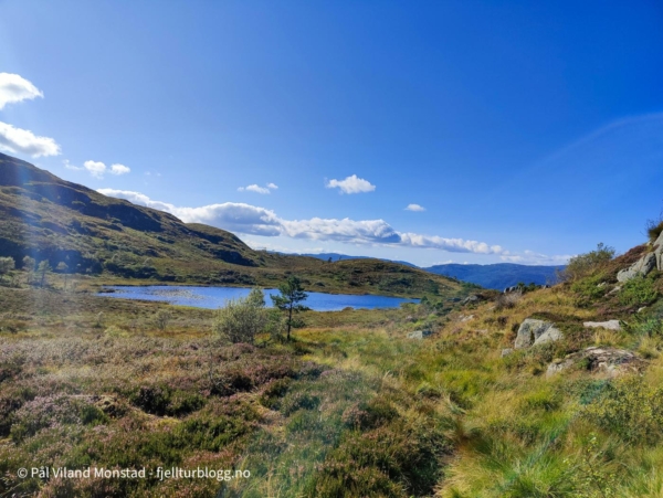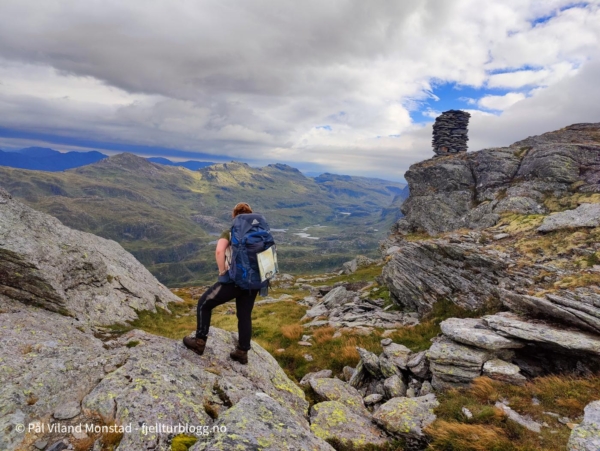 Fra hytta kunne vi se en varde på toppen i sørvest. Vi skulle med andre ord starte dagen med skikkelig stigning. Jeg har gått denne etappen før, se omtale her. Etter å ha passert elva ved utløpet av Blomstølsvatnet på bro, var det ganske kupert, før det ble mer jevn stigning oppover.
