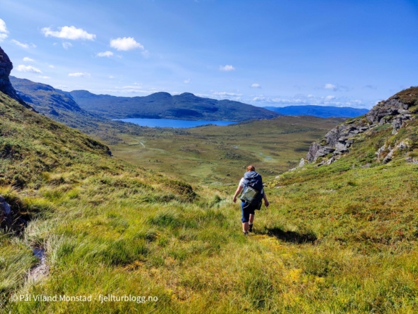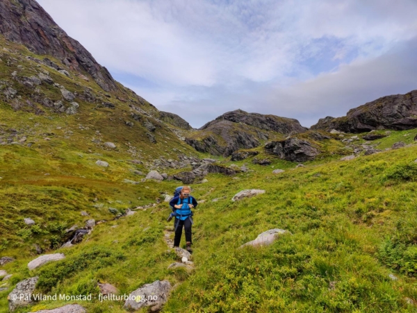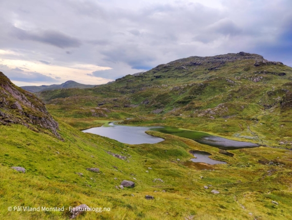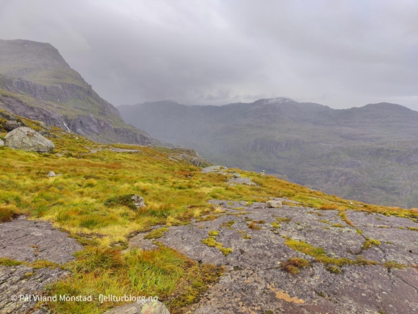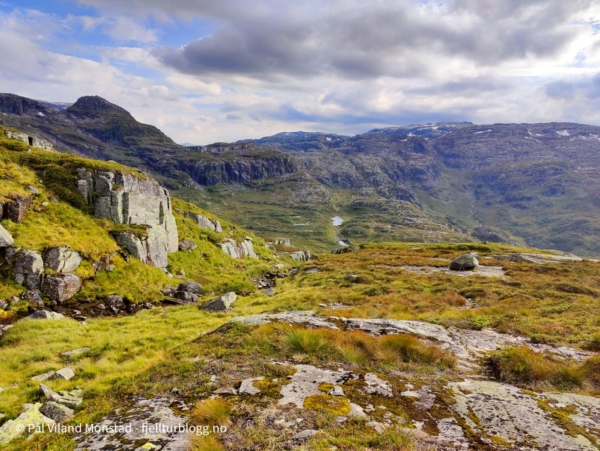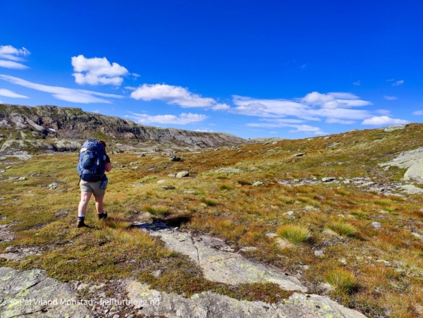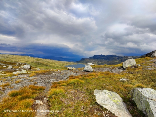 Vi våknet til regn, så turen startet i antrekk tilpasset værforholdene. Jeg har gått fra Simlebu til Langfoss tidligere, så noe av terrenget vestover var kjent fra før. Les om tidligere tur her. Vi hadde ikke gått lange stykket før regnet sluttet og vi kunne kle oss om. Turen vestover var kupert, med en rekke mindre opp- og nedstigninger. Det var mye fast mark og fjell under beina, så det var rimelig lettgått, og fantastisk flott landskap og utsikt.