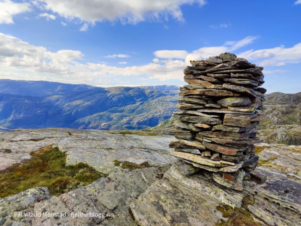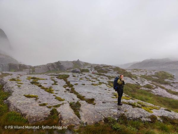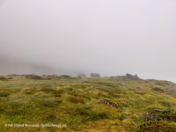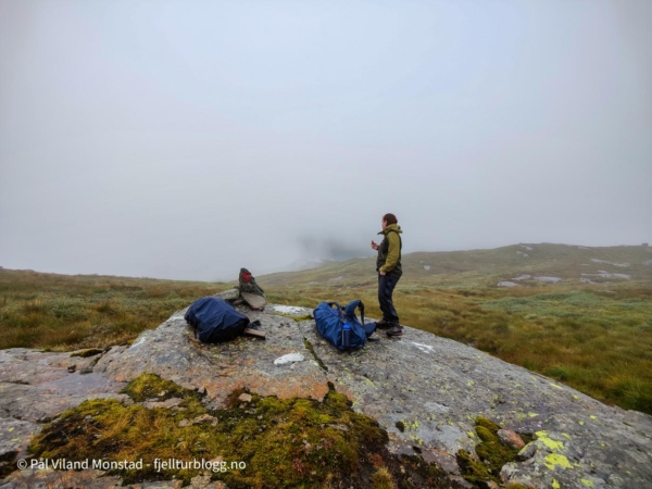 Vi inntok lunsj rett etter varden på toppen, og heldigvis for det. Ikke lange stykket videre innover det ganske flate topplatået, satte regnet og tåka inn. Utrolig, for det var det samme som skjedde sist jeg gikk her.