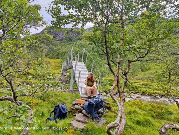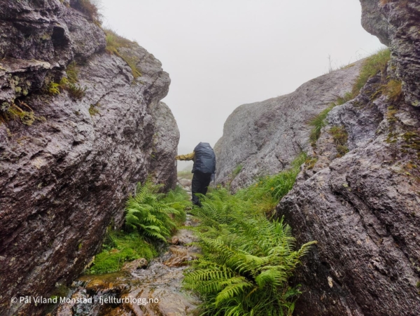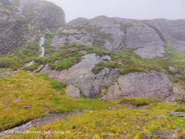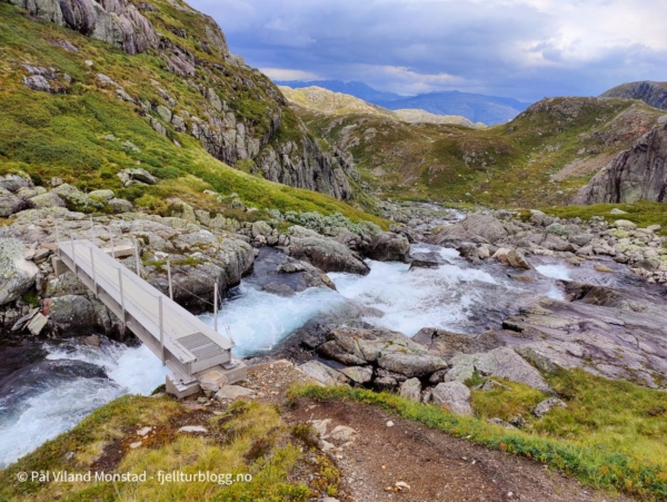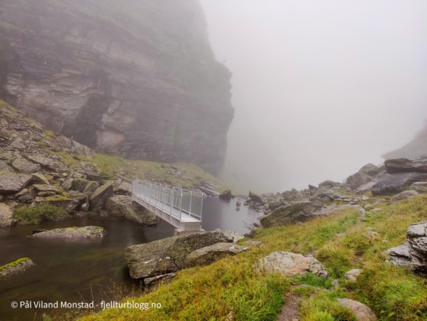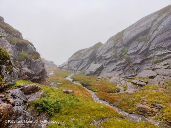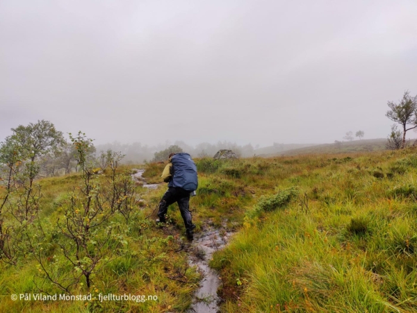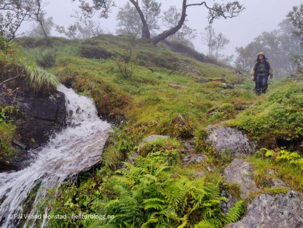 Økt vannføring var det! Det sildret og rant over alt, og fra fjellsidene og ned var det fosser vi ikke hadde sett dagen før. Fra stikrysset og ned i dalen var det bratt, men langt fra så bratt som gamlestien lenger nord. Alt regnet gjorde stien glatt og sørpete, så det var bare å bruke tid på å komme ned uten å gå på trynet. Vel nede var det et kort stykke til broa som førte oss trygt til vestsiden av elva.