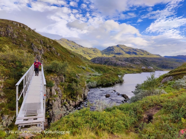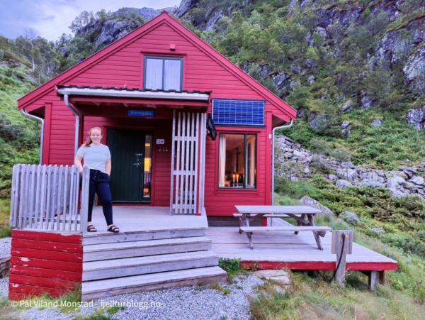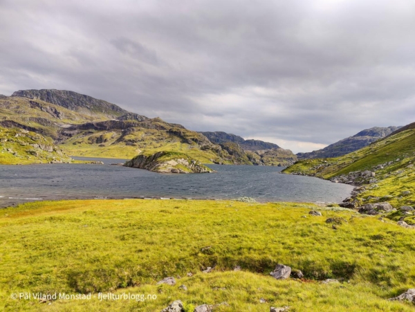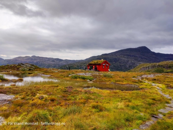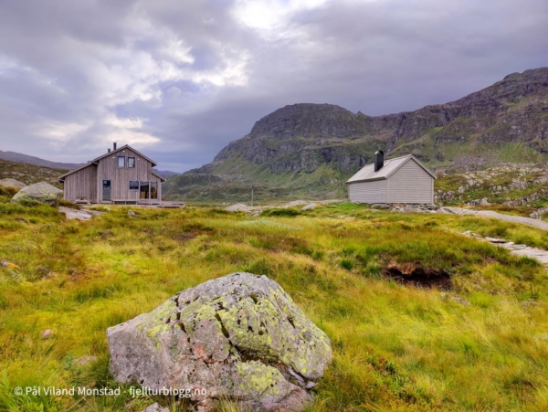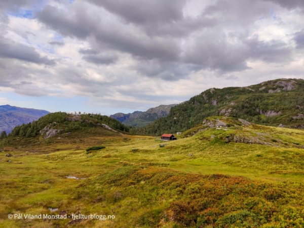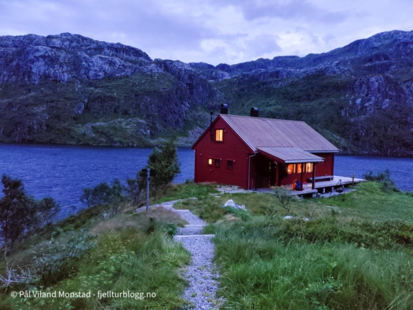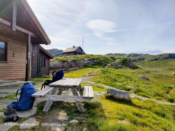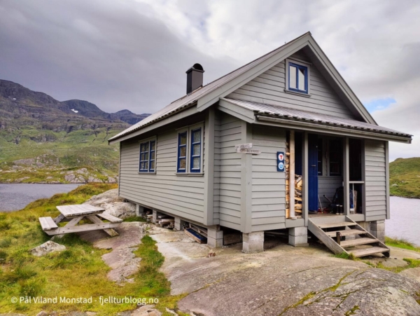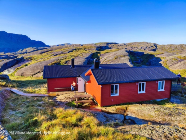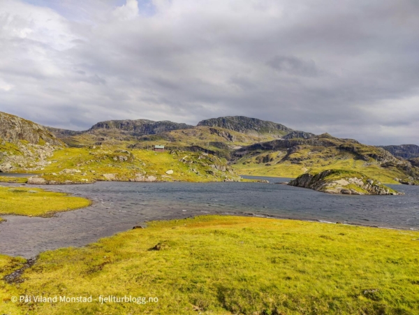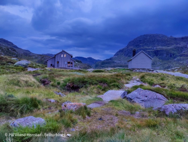 Det var ny stigning opp til øverst i Austmannadalen og ned Vinjakvelvane. Ikke lange stykket senere var vi framme ved den flotte hytta ved Sandvatnet. Planen var opprinnelig å overnatte her, men det ville bli en svært kort tur videre til Blomstølen dagen etter. Beina og kondisen tilsa at ferden skulle fortsette.