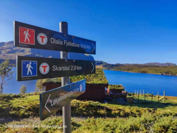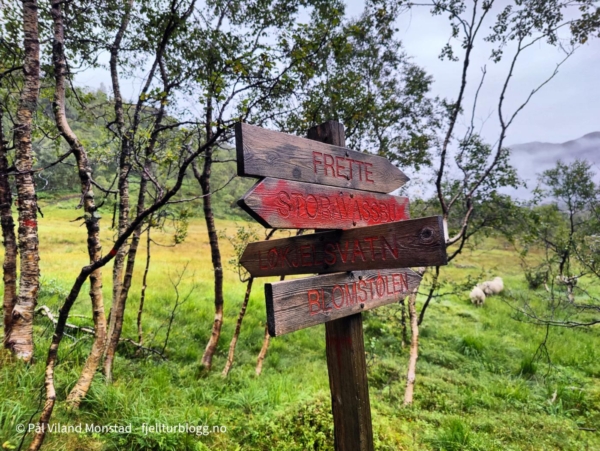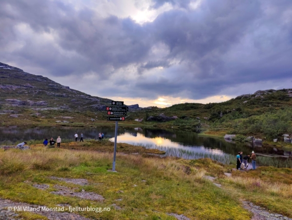Haugesund turistforening opererer med svært misvisende avstandsangivelser på skiltene sine på denne delen av Gullruta. Flere kilometer kortere enn det faktisk er. I følge skiltet ved Simlebu skulle det være 12 kilometer til Sandvass. Vi målte 14. Samme misforholdet hadde vi opplevd dagen før. At det er direkte feil tror jeg det er, siden begge våre klokker, og franskmennenes, var rimelig samstemte. Senere på turen var det også samsvar mellom skilt og klokker. Ikke det at det gjør noe, men når det står oppgitt avstand bør den være riktig. Hvis ikke kan man like godt ta bort den type skilt, siden det neppe er andre måter å følge med på avstand enn via GPS-målinger, som da viser noe helt annet.