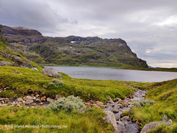 Ved utløpet av Vaulo gikk ferden over solid bro. Vi hadde kraftig østavind i ryggen, og det blåste friskt langs nordsiden av vannet. Et spesielt landskap, der det er massive og høye fjell på sørsiden av vannet, mens det er slake åssider på nordsiden. Som så ofte med stier gjennom vegetasjon, var det ganske vått og sørpete på dette strekket.