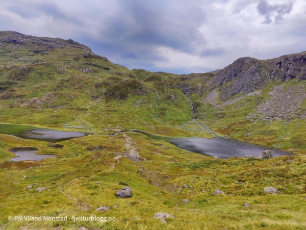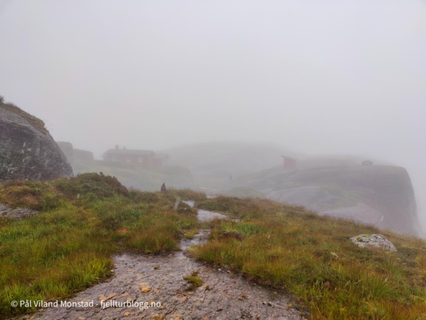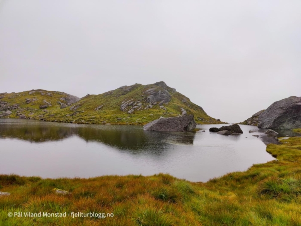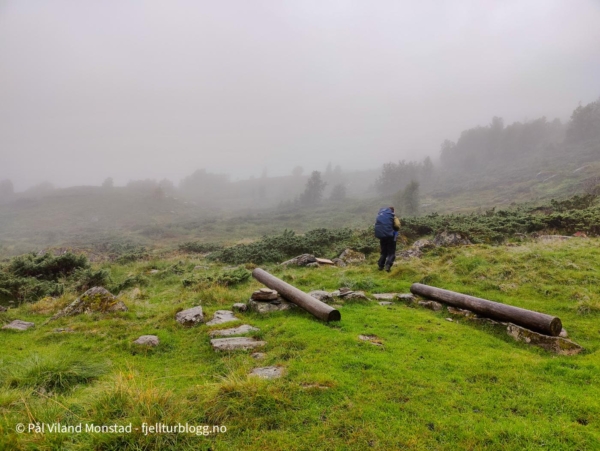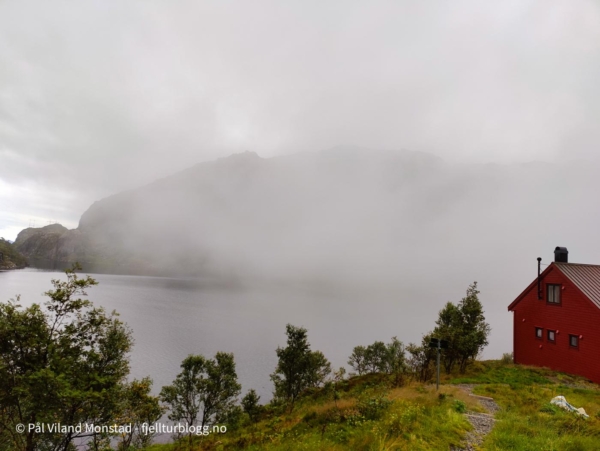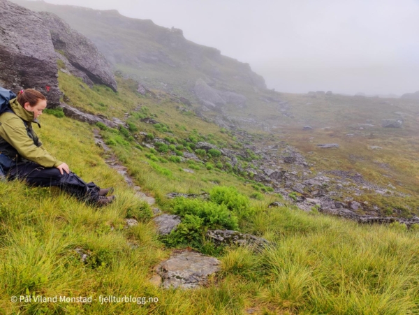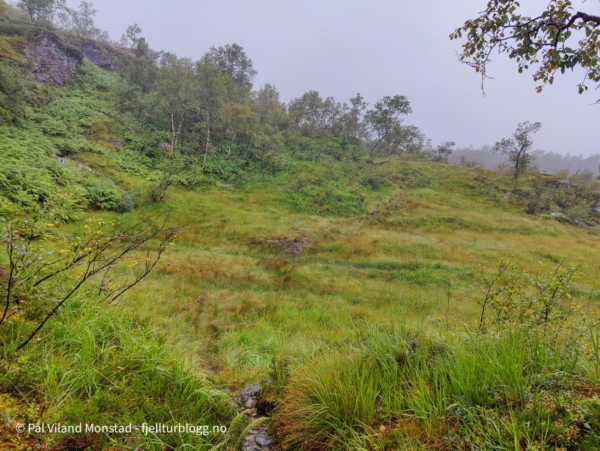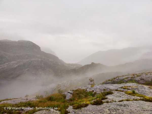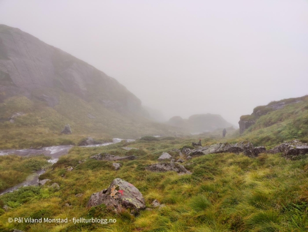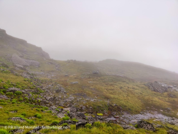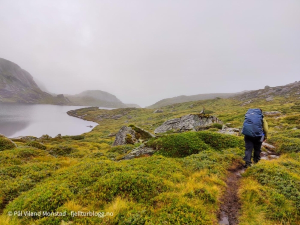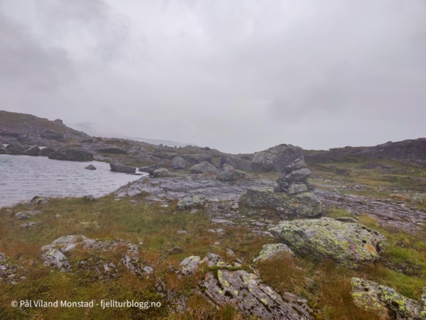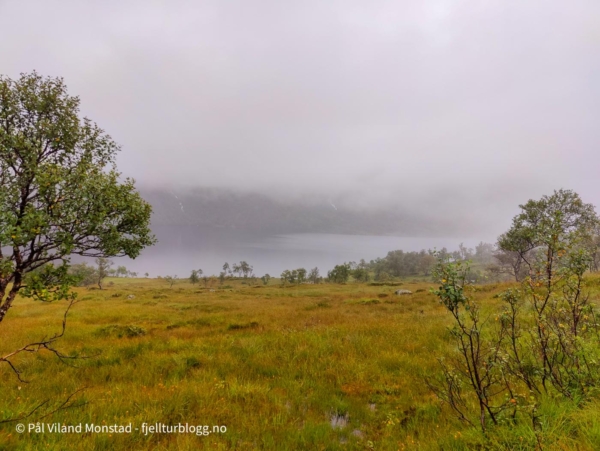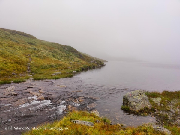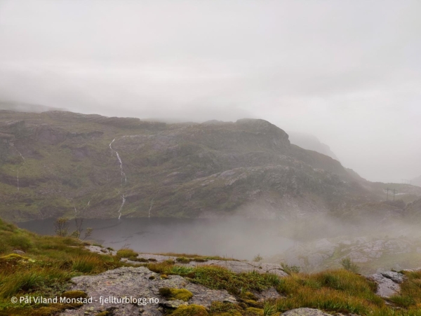 Gode nødlinger gjorde ferden innover og etter hvert ned til Ingebjørgsvatna lettgått. Våte, og delvis glatte sva nedover gjorde at vi brukte noe mer tid enn vi ville gjort på tørt underlag. Sikten var elendig, så noe utsikt var det ikke før vi kom ut mot kanten og kunne se til Hellaugvatnet. Ferden fortsatte på sti som ikke var merka sist jeg var her. Mye lettere å ta seg til Storavassbu i den nye traseen, enn å gå bratt ned på sørsiden av fossen, og deretter langs Litlavatnet.