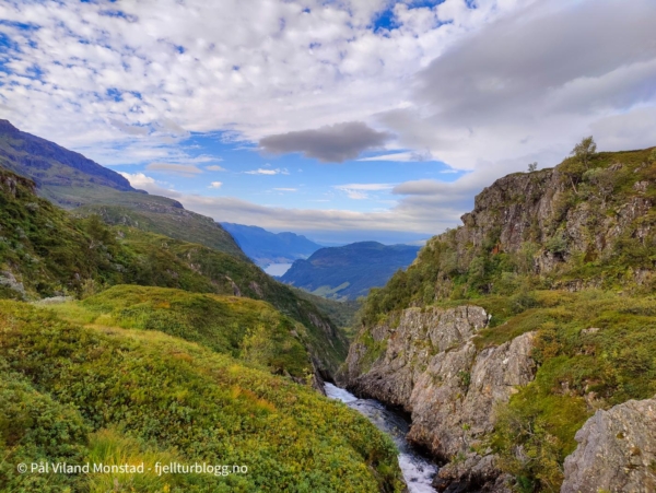 Ned Blomstølsskard var det bratt, før det var ny stigning opp til øverst i Langfossdalen. Her var det stikryss med mulighet for å korte turen inn, og gå bratt ned langs Langfoss til E134.