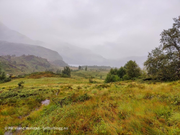 Fra Frettestølen og vestover gikk det mye lettere, selv om det også her var en del myr, men uten særlig stigning. Vi passerte en flokk kviger som søkte ly inne i bjørkeskogen. De gadd ikke å sjekke ut fremmedfolk i regnet. Like greit. Flåtevatnet så vi lite til i tåka, men antakelig veldig fint. Ved utløpet av vannet kom vi oss over på bro, og vi fortsatte forbi Flåtestølen og Håheimstølen. Regnet gikk etter hvert over til yr, men tåka letta ikke.