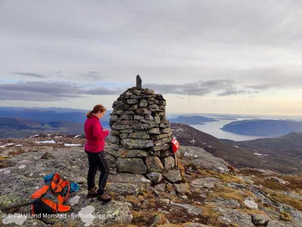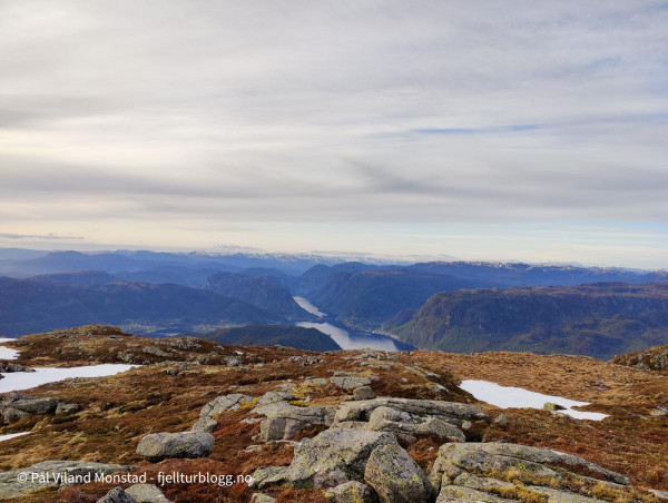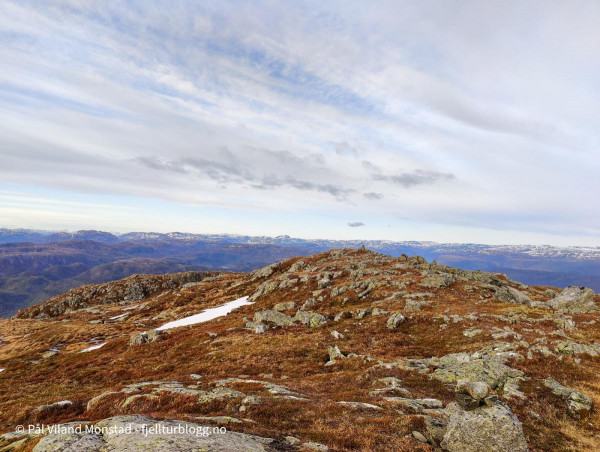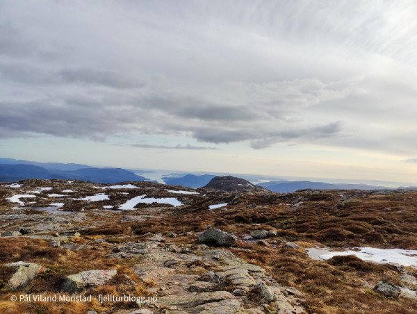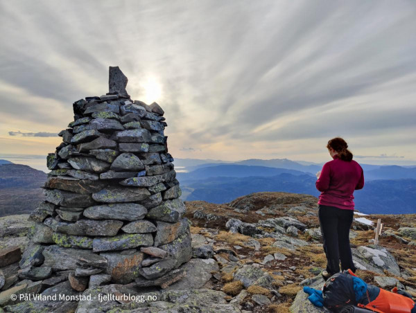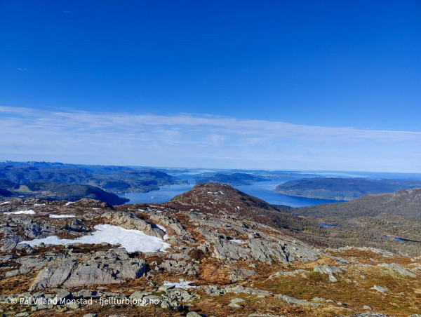 På Herefjellet 694 moh var det ingen tydelig varde. Vi skrev oss inn i boka litt under toppen, og fortsatte opp til noen småvarder som helt tydelig sto på det høyeste punktet. Fin utsikt mot Ombo og videre utover Boknafjorden. I nord kunne vi se Grytenuten. Lenger øst Hustveitsåta.