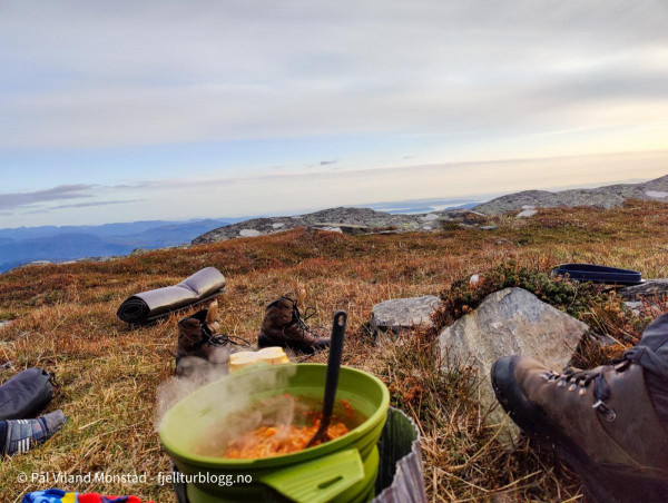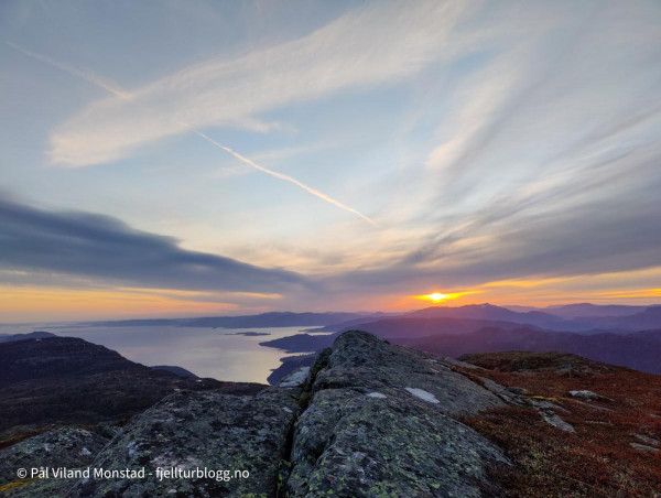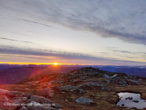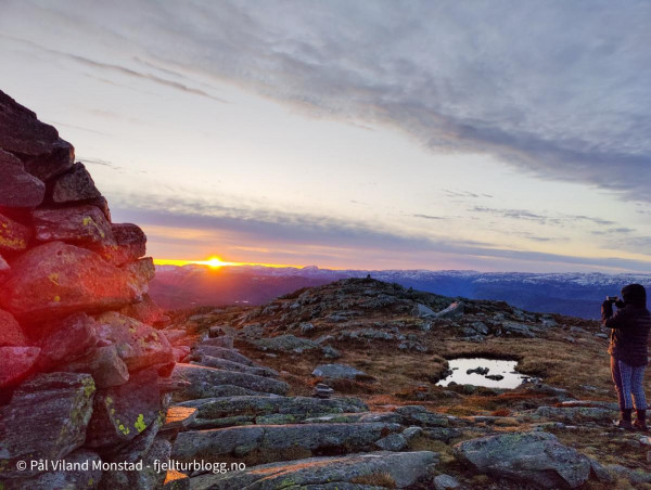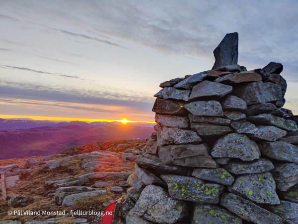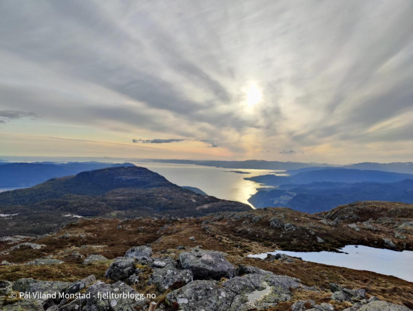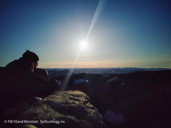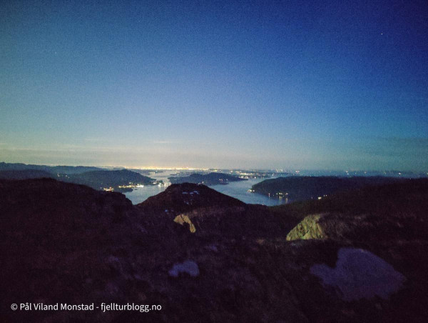 Middag ble laget og inntatt, og sengene klargjort. Litt småkald trekk fra nordvest, men vi fant ganske bra le på ei hylle rett under varden på sørsiden. Rundt klokken ett var det ut av grevlingen for å kikke på utsikten, som var aldeles formidabel fra denne toppen. I nord kunne vi se ned til Erfjord. I vest mot Tysvær/Kårstø og Bokn. Og hele Boknafjorden med alle øyene. I sørvest lyste Stavanger opp nattehimmelen. Slettes ikke helt mørk på denne måneopplyste natta, men utrolig flott!
