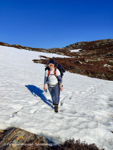 Etter en kort pause tok vi samme vei tilbake til sekkene. En kort sjokolade- og vannpause i det fine været, og turen fortsatte ned grusveien til bilen. En flott tur som kan deles i to for de som vil ha en litt kortere tur. Ikke noe problem å ta alt på en dag, men dette er en tur som absolutt egner seg for topp-overnatting.
