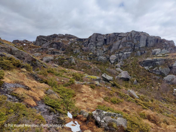 Jeg tok av fra gamleveien mellom Etne og Skånevik, til Øvstebø. Etter å ha spurt en kar i veikanten fant jeg parkeringsplassen beregnet for turgåere. Bare plass til en bil, men det var ikke noe problem siden jeg var den eneste som hadde tenkt å parkere denne ettermiddagen. Rett ved startet turen gjennom grind og opp en svært bratt vei. Veien hadde asfalt/oljegrus, så det var greit å gå. Hele veien passerte jeg underholdene skilt og rekvisiter. De har nok hatt det moro, de som har stått for dette. Garantert motiverende å ha med smårollinger på tur, siden det var overraskelser med korte intervaller!