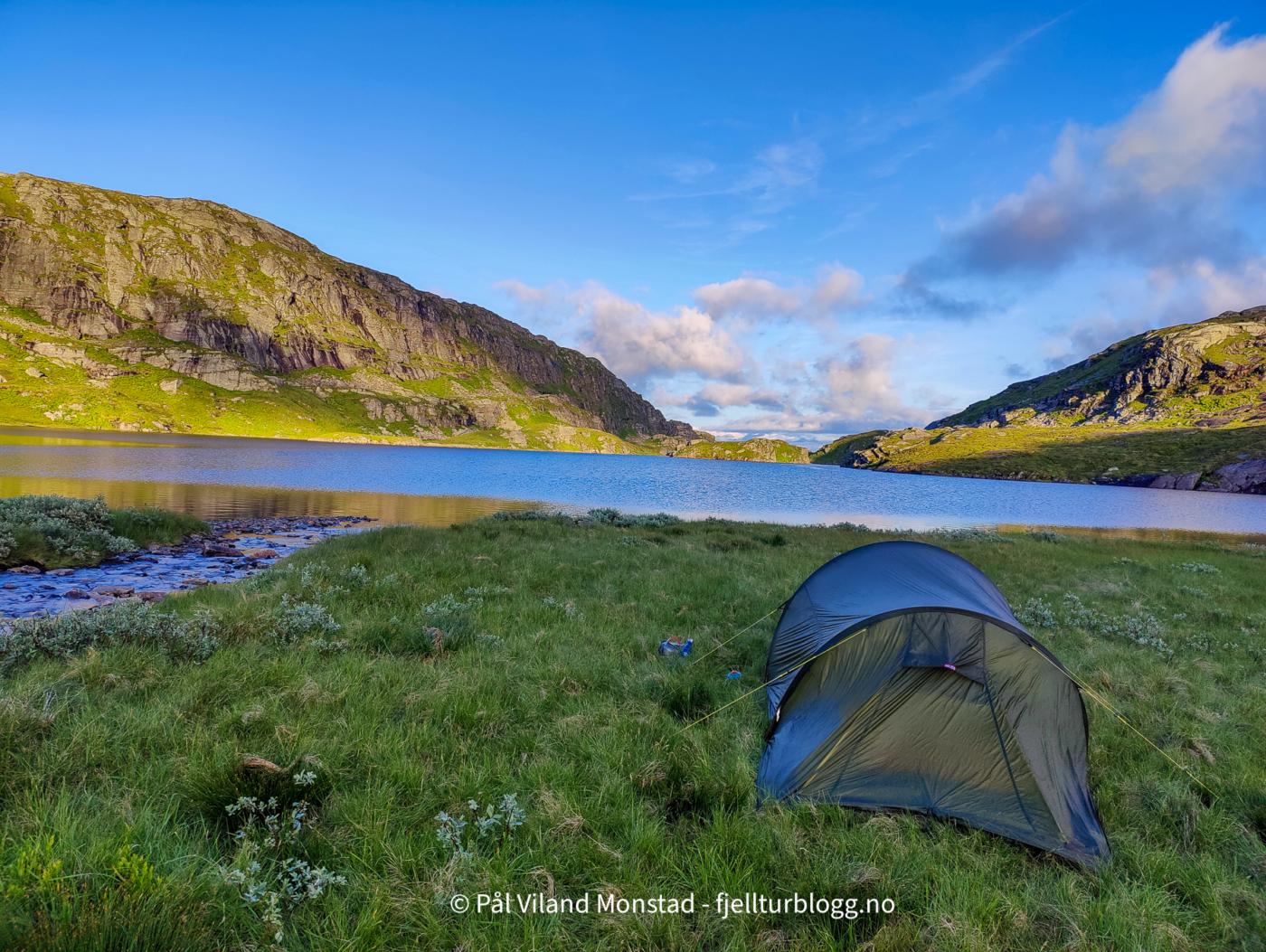 Turen fortsatte forbi den lille gjeterhytta og ned til innløpsosen i Svandalsvatnet. Her fant jeg en fin flate å slå opp teltet. Fiskestang hadde jeg ikke med, så fisken som vaka hele kvelden hadde lite å frykte.