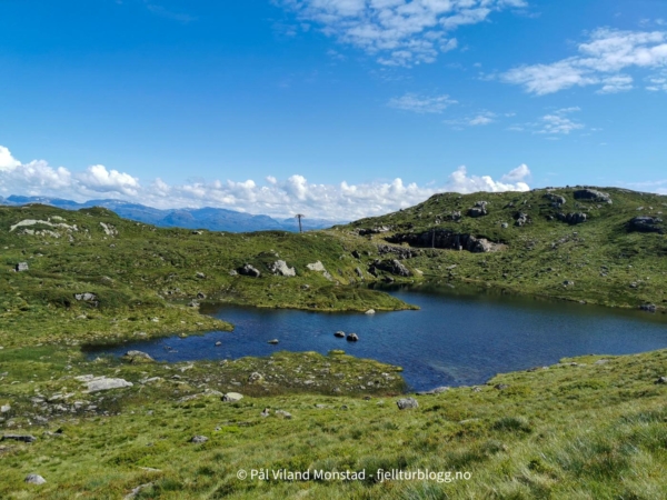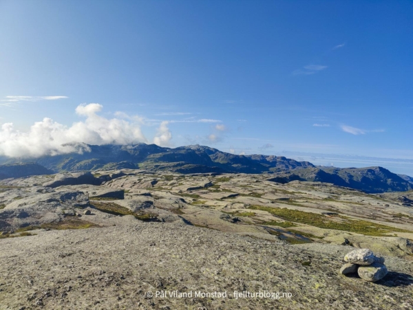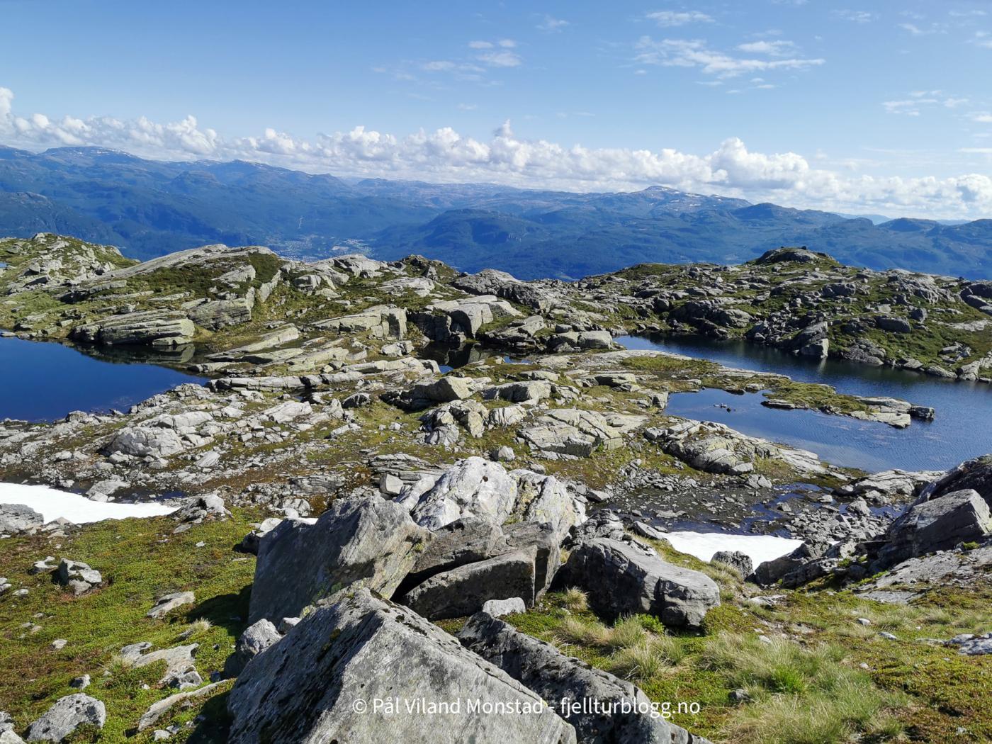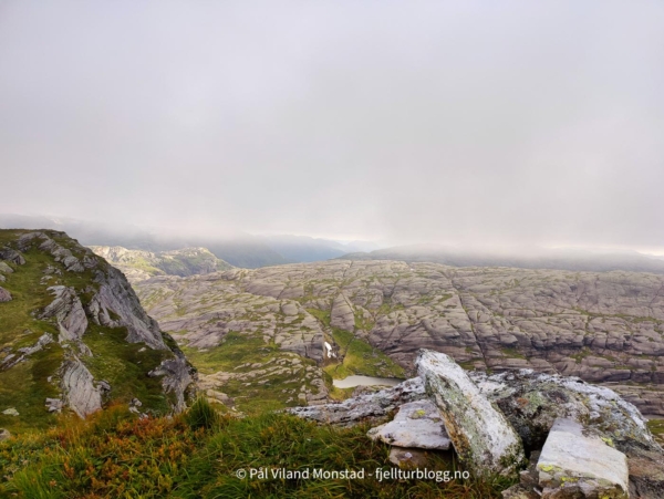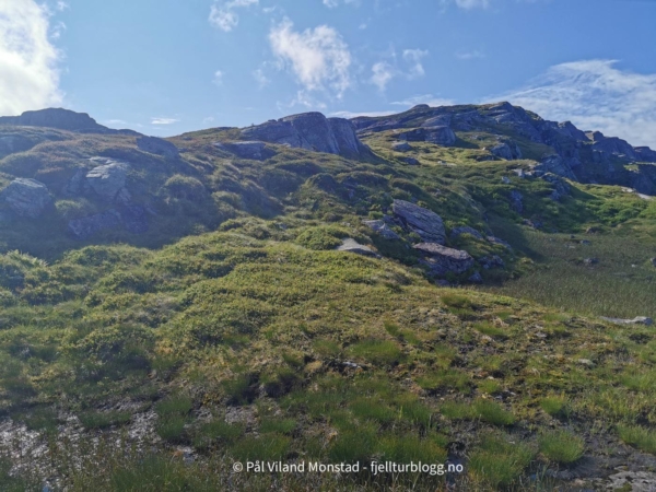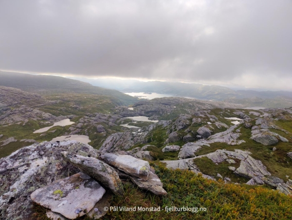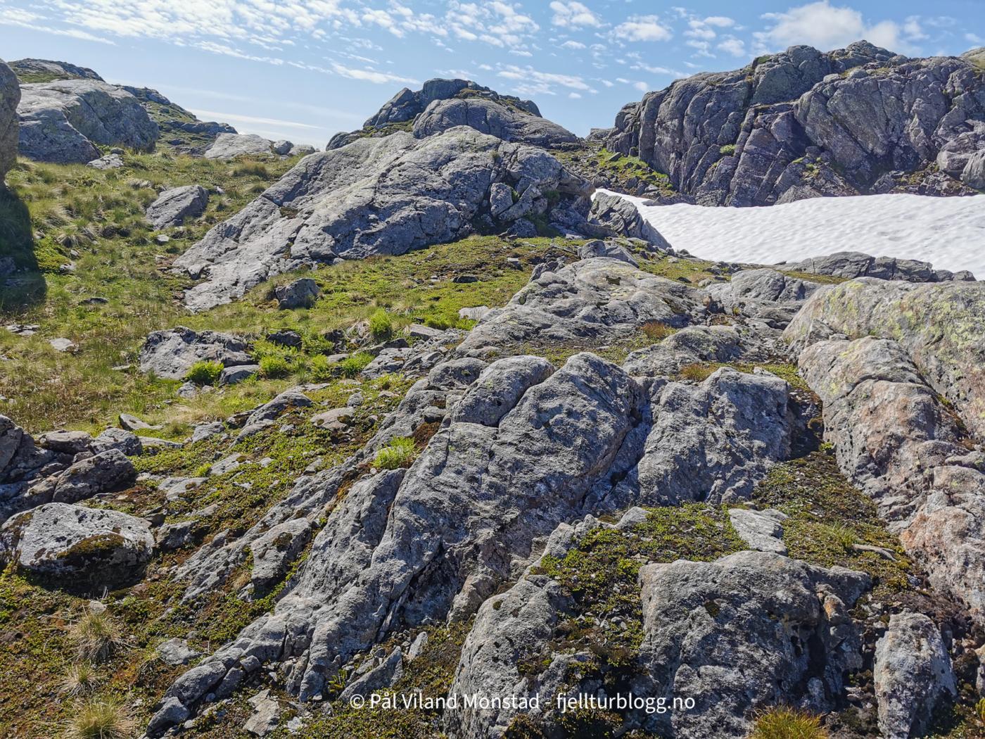 Dagen etter satte jeg kursen videre langs stien i nordlig retning. Rett etter skaret sør for vann 808 tok jeg opp et skar i sørvestlig retning. Ikke særlig bratt, og lett å gå oppover de blankskurte bergene i retning Krokavassnuten, som ligger i Etne kommune. I det hele tatt andre fjellformasjoner enn på østsiden av dalen. Det var flere småvann og kløfter som skulle passeres, så noen strak rute mot toppen ble det ikke.