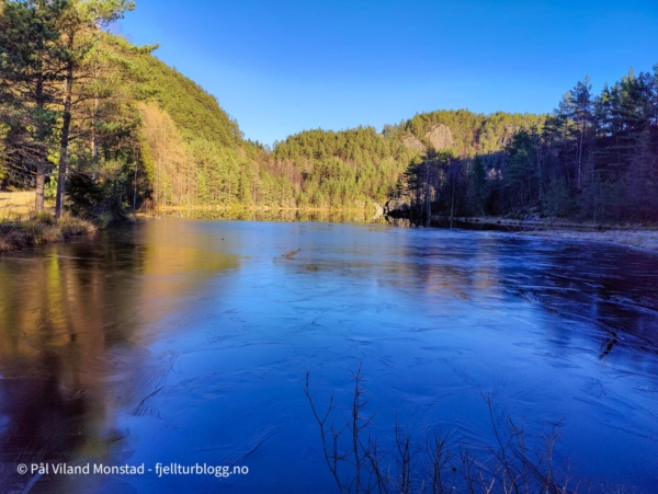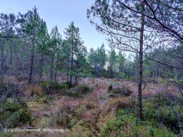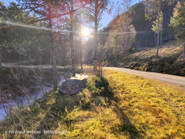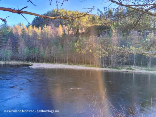 Etter å ha besøkt Rødsnuten og Selsnuten, sto siste tur for dagen på programmet. Jeg kjørte i retning Jelsa, men tok av en sidevei mot Sandvik. Ved Sandviktjørna parkerte jeg bilen, og turen kunne starte på traktorvei ved utløpet av tjørna. Det gikk slakt oppover, og idet veien gikk nedover mot vannet igjen, tok jeg bratt opp et skar med noe ur. Fra toppen av skaret flatet det ut, og jeg gikk ikke veldig langt før det ble svært bratt stigning. Her skal man ikke gå for langt, for det virket å være loddrette bergvegger lenger øst.