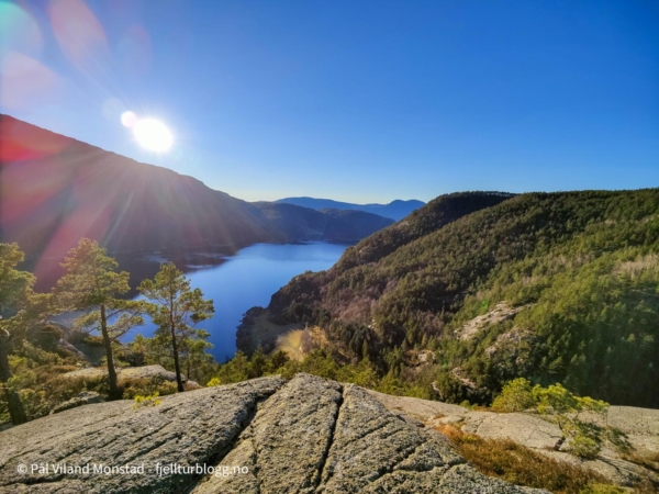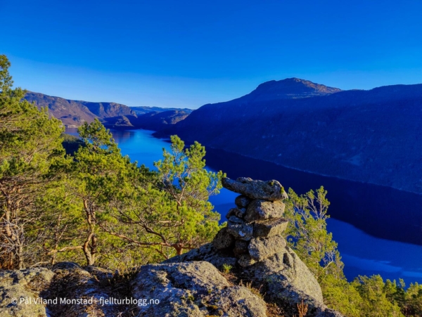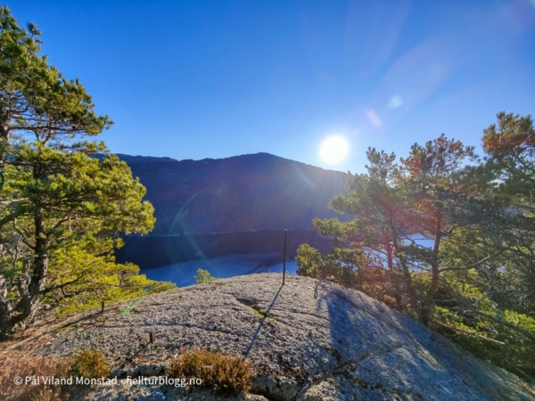 Jeg kom meg opp, og etter å ha sikksakket på noen hyller, kom jeg etter hvert over det bratte partiet. Det flatet ut, og jeg kom inn på en tydelig sti som førte meg sørover topp-platået. Helt ute på kanten sto en liten varde, med fin utsikt over Erfjorden. Stien fortsatte langs kanten av platået, før den etter hvert dreide til det høyeste punktet. Rett under toppen hadde noen satt opp et lite ly, i form av et seil fra seilbrett. Jeg skrev meg inn i boka så lå i kassen under seilet, og fortsatte opp til den fine utsiktstoppen.