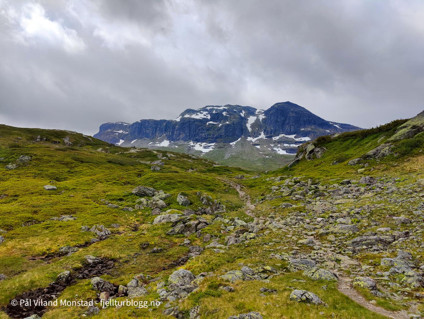 Den godt merka stien, både i form av synlighet i terrenget og rødmalte steiner, fulgte vestsiden av Kjelavatn, før den fortsatte i retning Vassdalen. Elva nederst i dalen ble passert på helårsbro. Oppover mot stidele mot Bjåi ble det varmt, ettersom skydekket sprakk opp og motbakken ble brattere. Videre innover dalen, sør for Vassdalstjørn var det lett å gå, før det på nytt gikk bratt oppover mot Turistskaret.