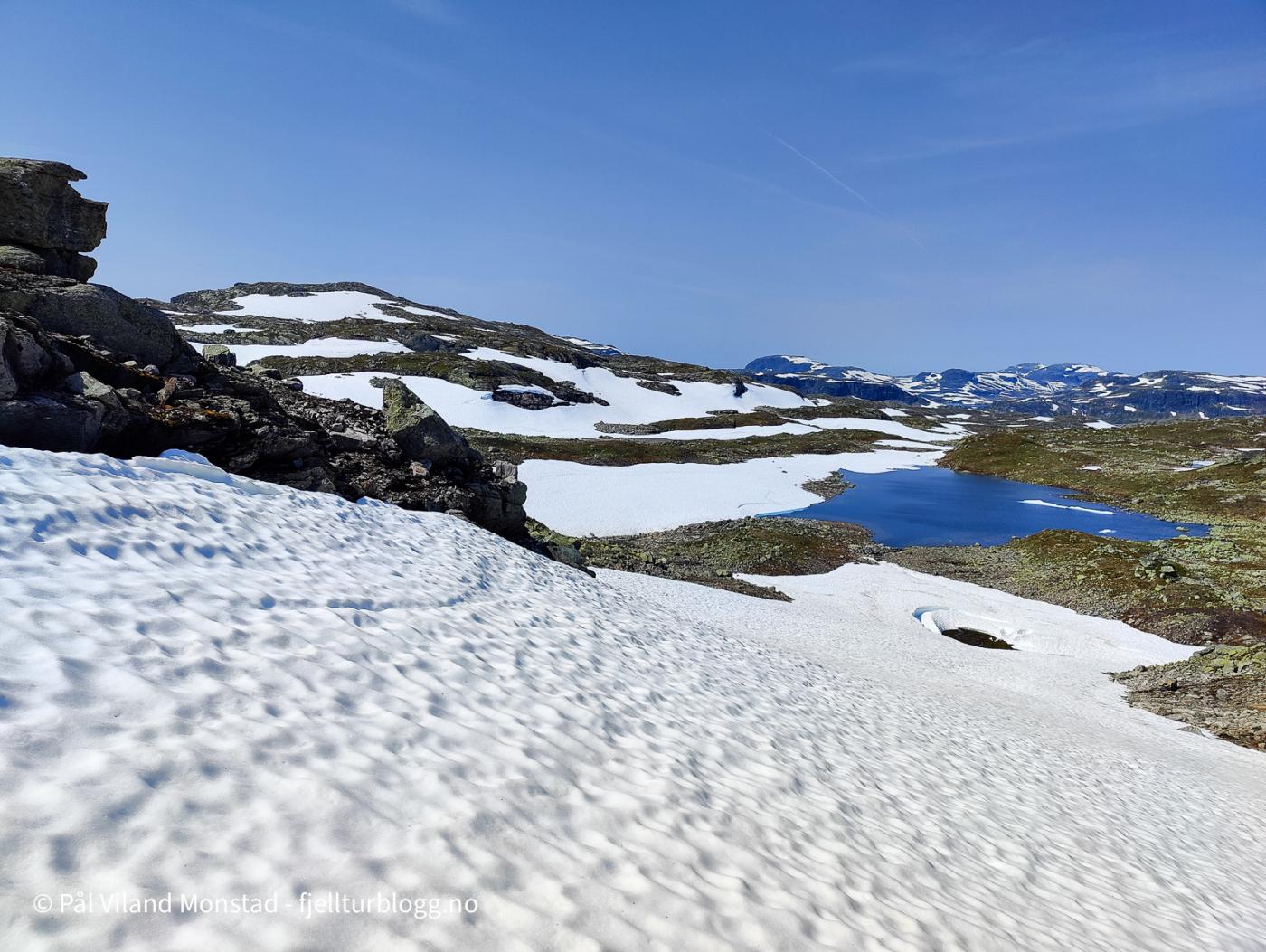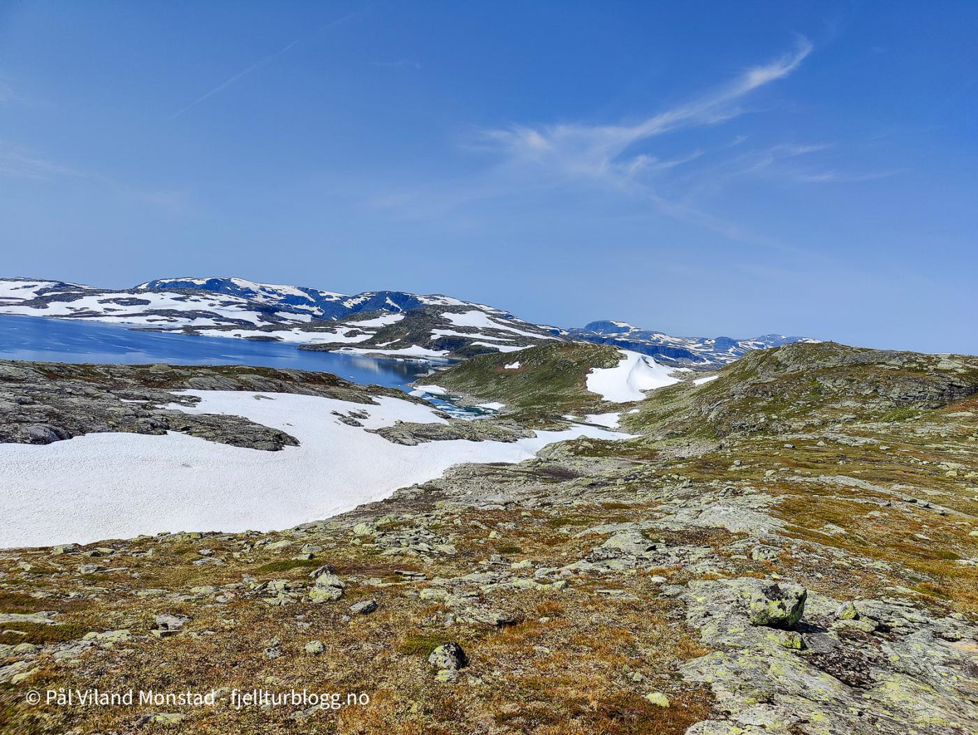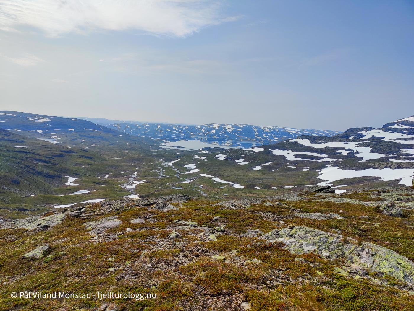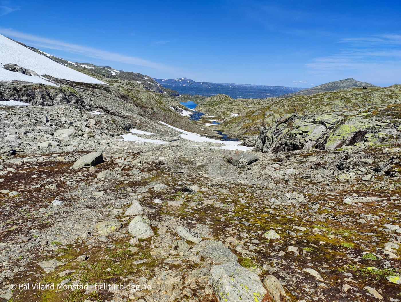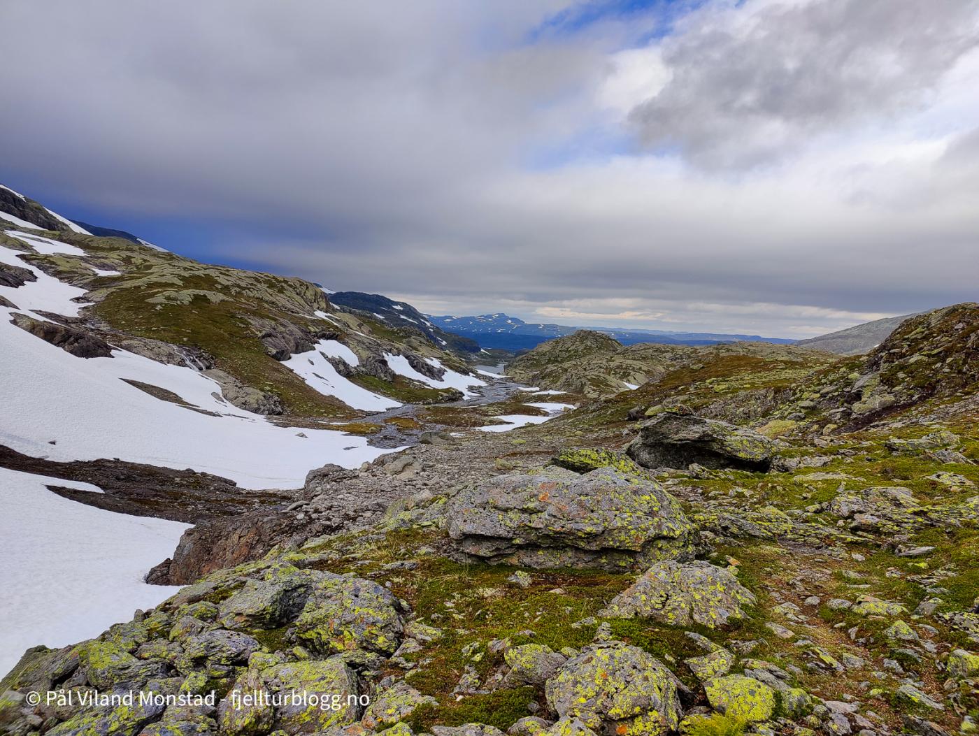 Ny stigning, og flere snøfonner, til jeg nådde høyeste punktet på stien mellom Haukeliseter og Holmavatnet, 1330 moh. Fra toppen av skaret var det storslagen utsikt nedover hele Vassdalen. Her var også siste punkt med mobildekning på turen.