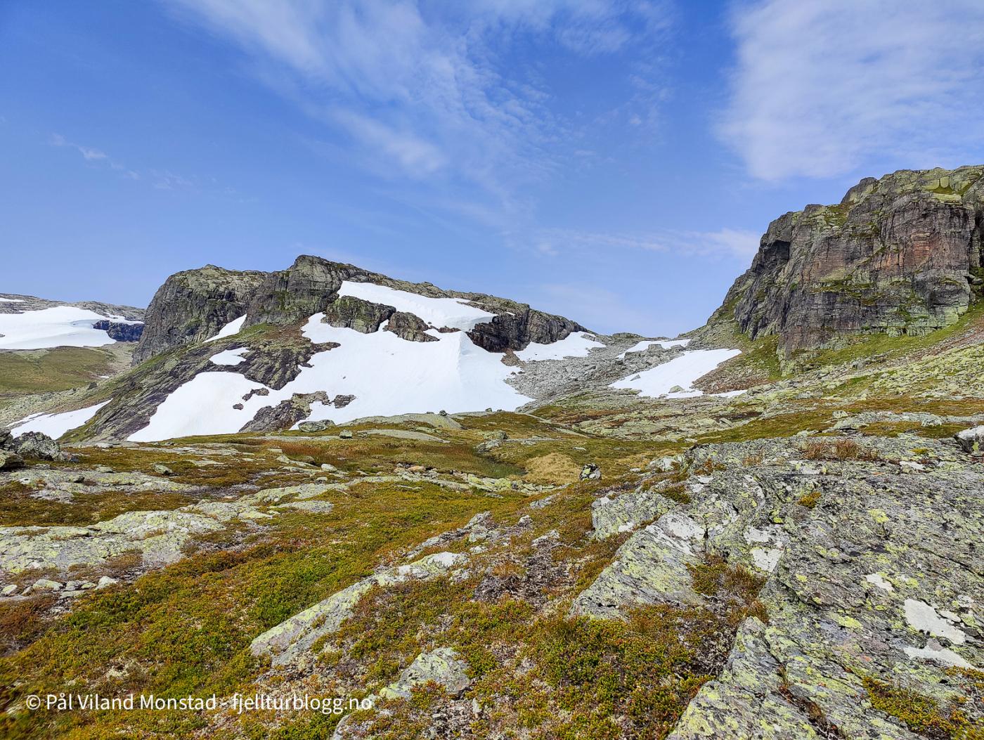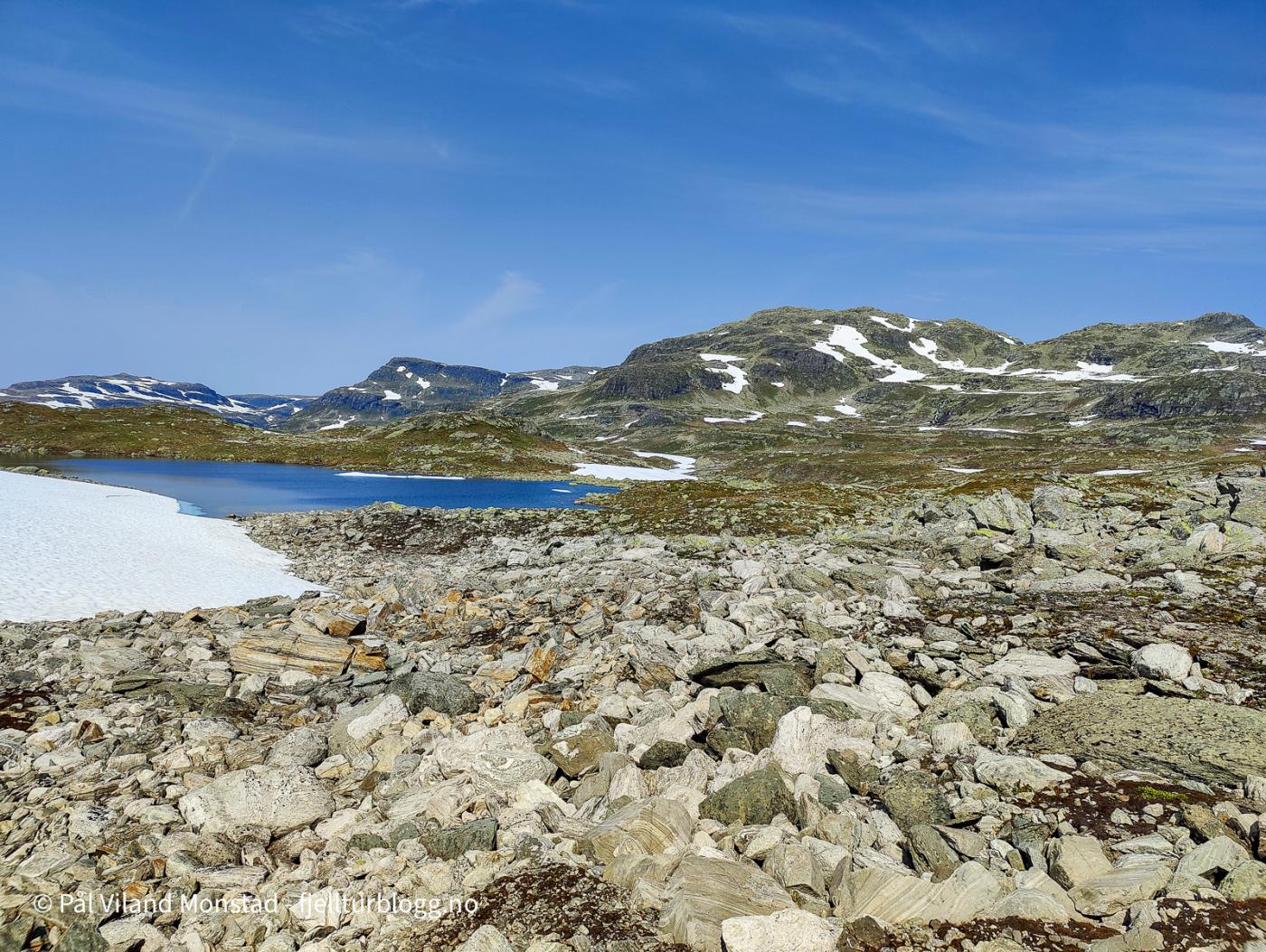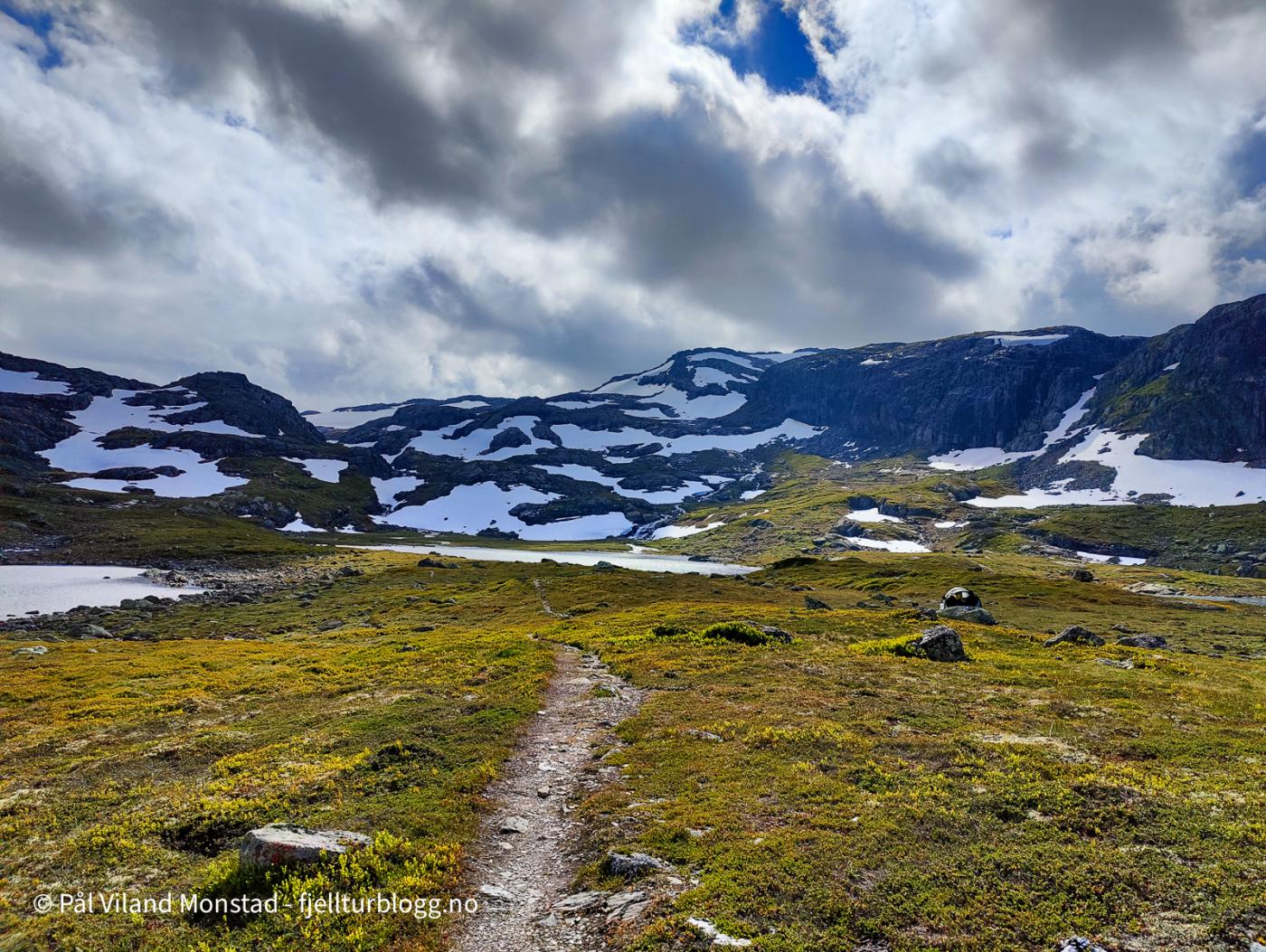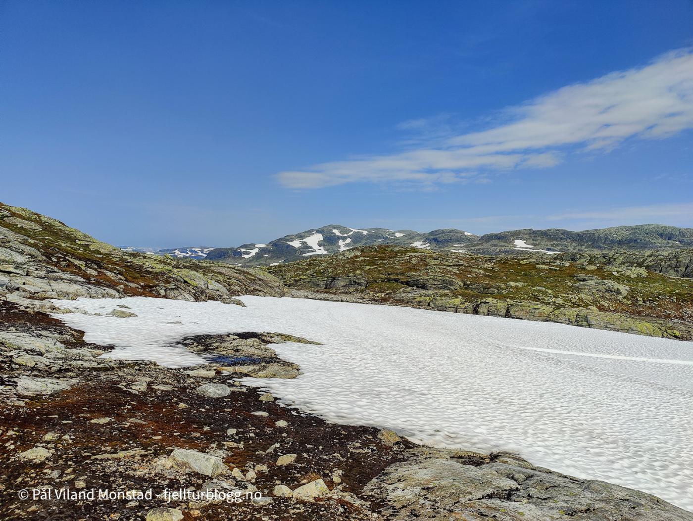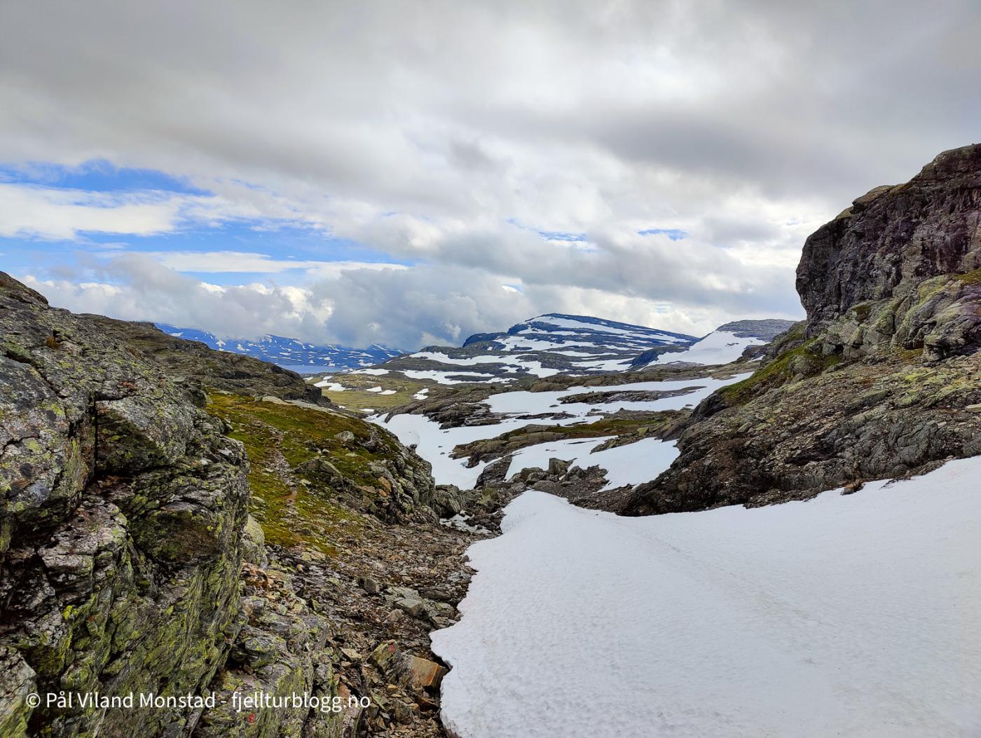 Ny stigning, og flere snøfonner, til jeg nådde høyeste punktet på stien mellom Haukeliseter og Holmavatnet, 1330 moh. Fra toppen av skaret var det storslagen utsikt nedover hele Vassdalen. Her var også siste punkt med mobildekning på turen.