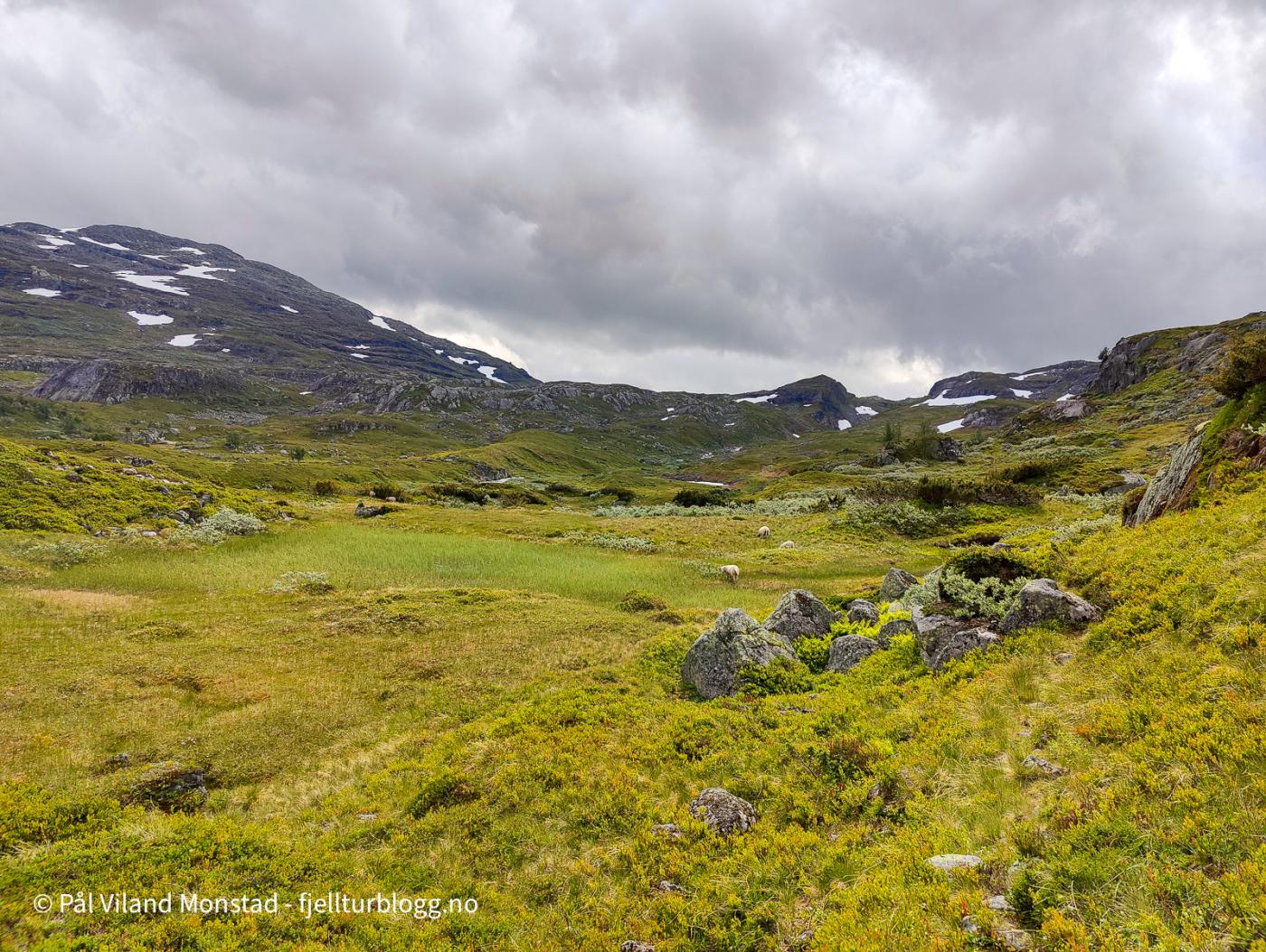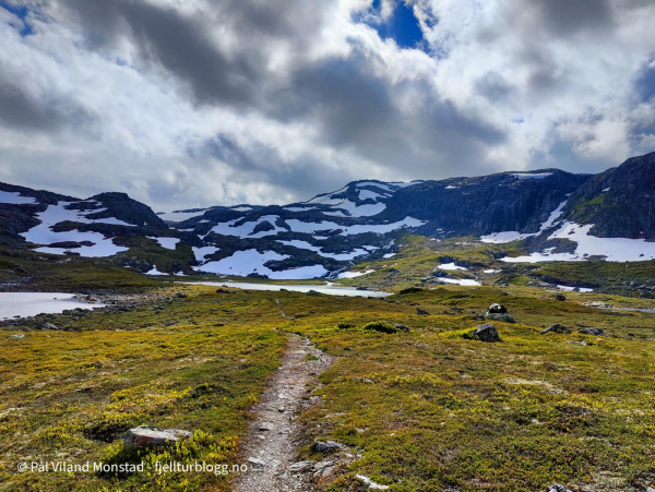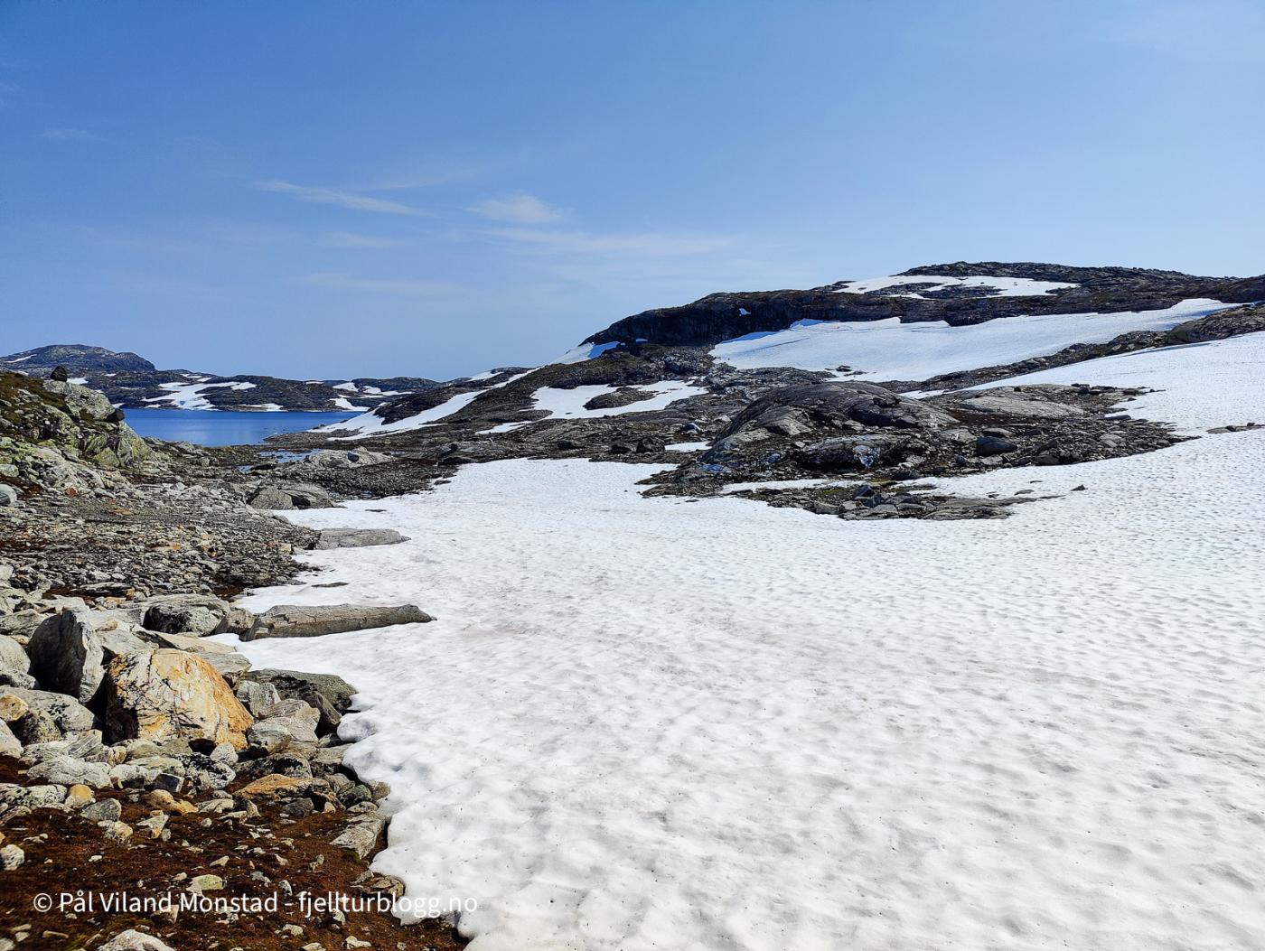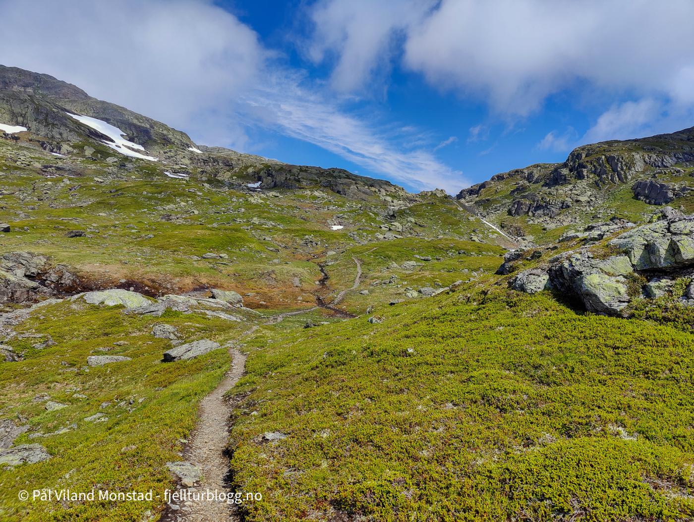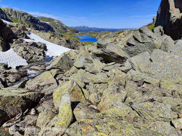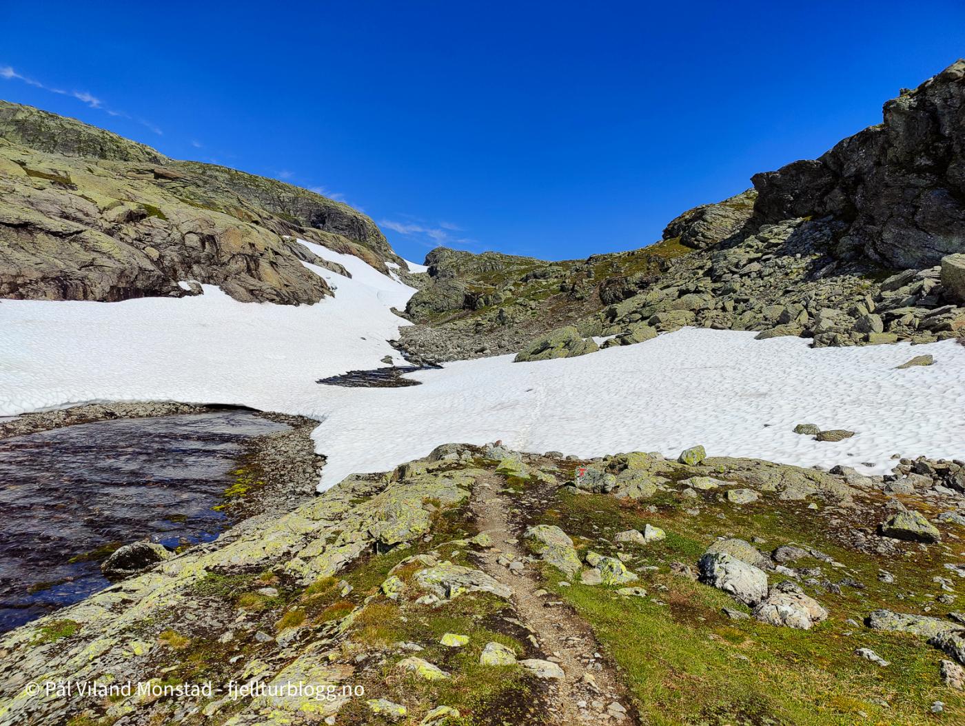 Ny stigning, og flere snøfonner, til jeg nådde høyeste punktet på stien mellom Haukeliseter og Holmavatnet, 1330 moh. Fra toppen av skaret var det storslagen utsikt nedover hele Vassdalen. Her var også siste punkt med mobildekning på turen.