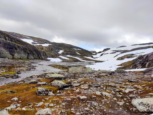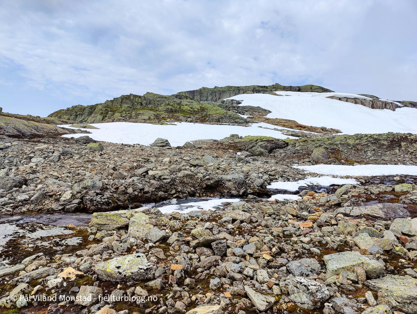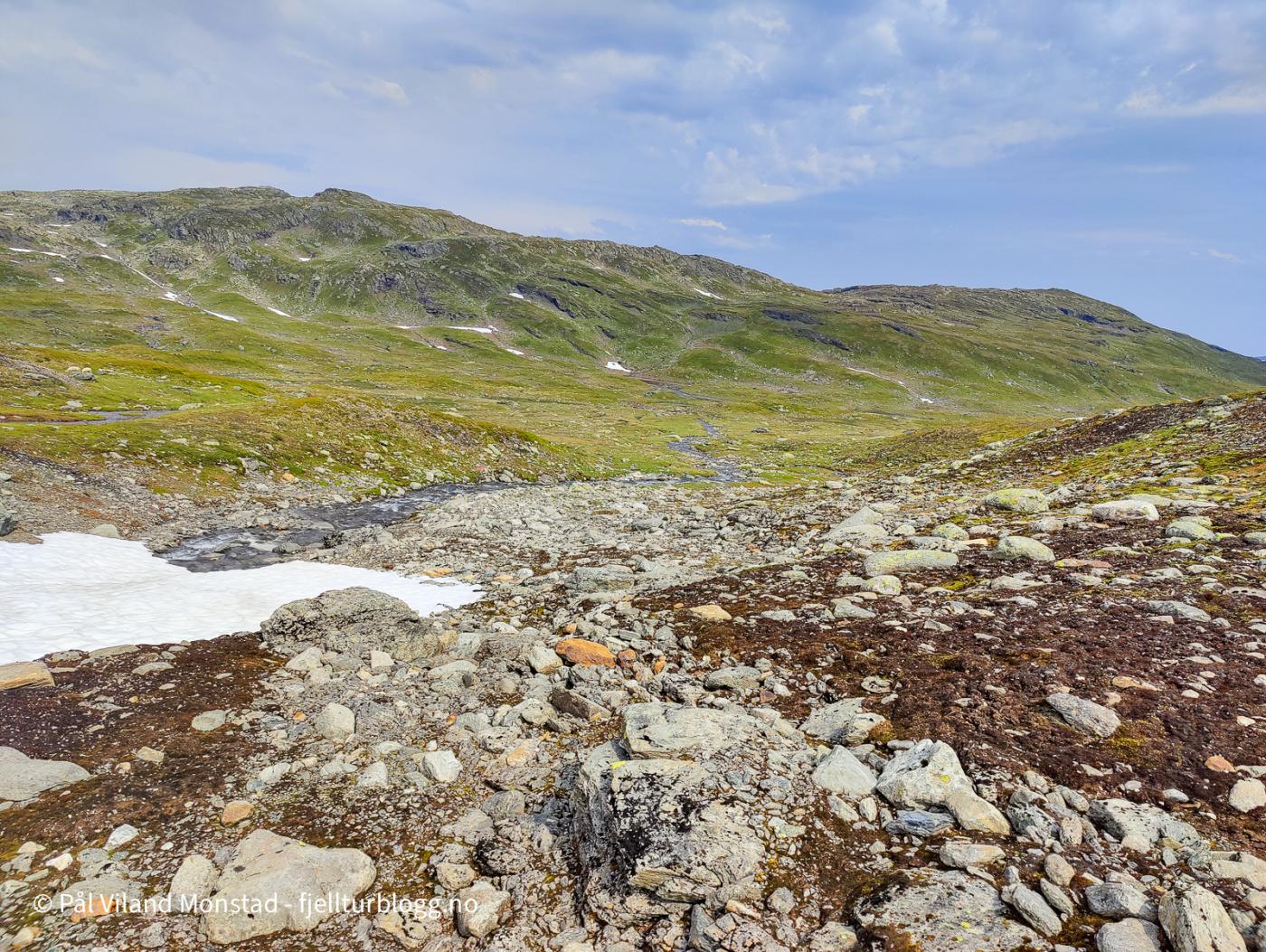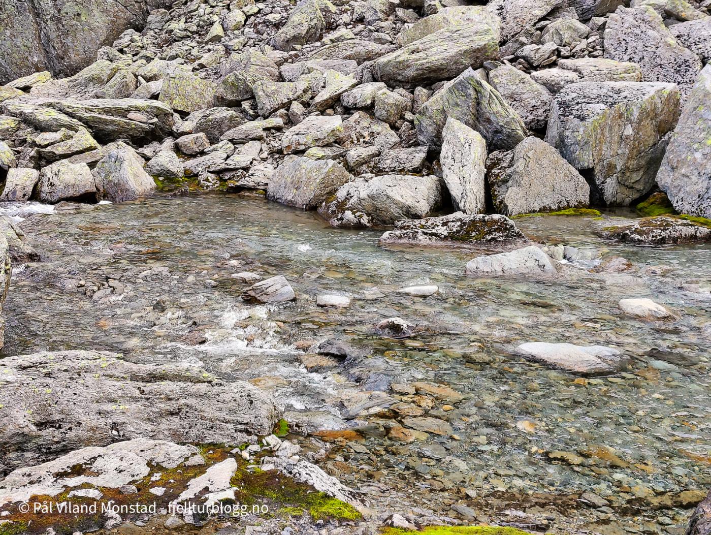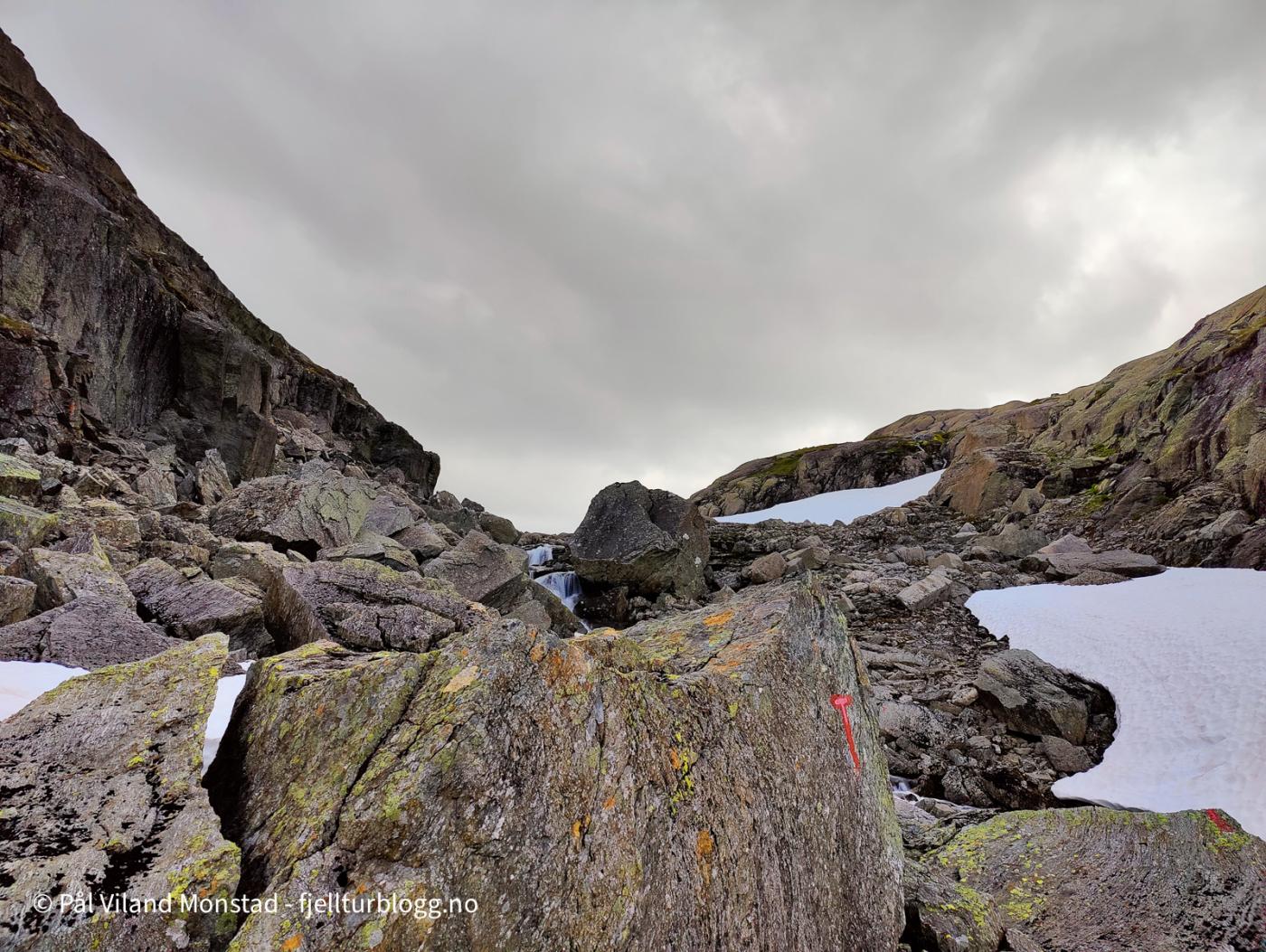 Oppe i det etter hvert bratte og smale skaret var det stor ur, og da mener jeg stor! Ganske krevende med tung sekk på ryggen. Midtveis i ura måtte i tillegg elva vades. Rødmerkingen viste at man burde krysse elva på nedsiden av en svær stein. Her gikk elva stri, så jeg fortsatte heller til oppsiden av steinen på leiting etter en bedre plass å krysse vannmassene. Der var det flatere, og lettere å se hvor man kunne sette beina i elva. Medbrakt regnbukse ble teipa stramt rundt fjellskoene. Jeg kommer alltid tørrskodd over elver med denne metoden, selv om vannet når knehøyde. Vel over elva var det et nytt parti med ur, før det flatet ut. Elva måtte krysses enda en gang lenger inne, men her var det flatt og mye lettere å komme over. Det gikk derfor greit uten regnbuksemetoden.