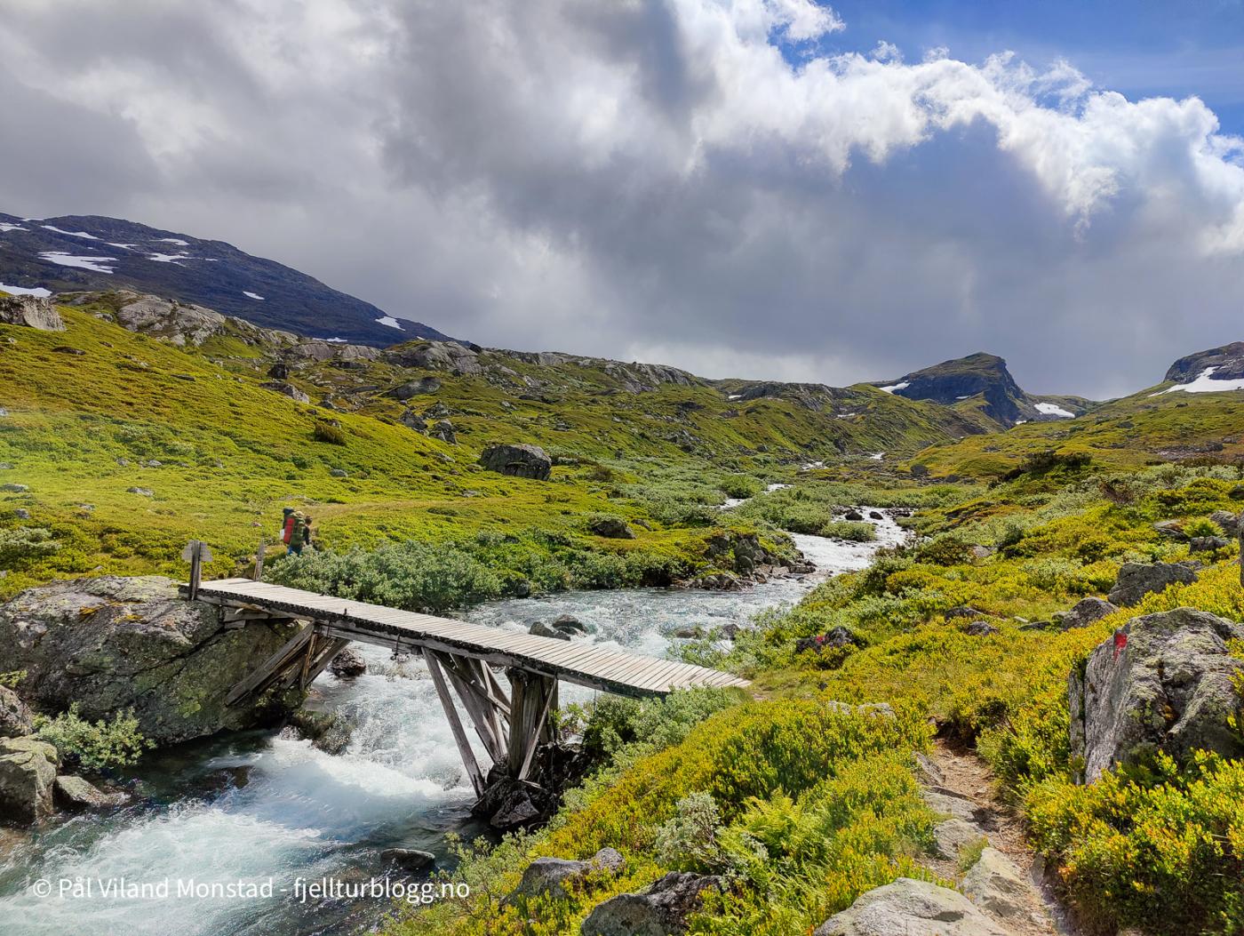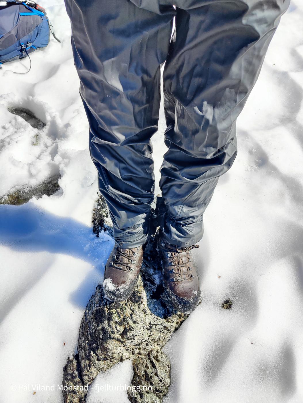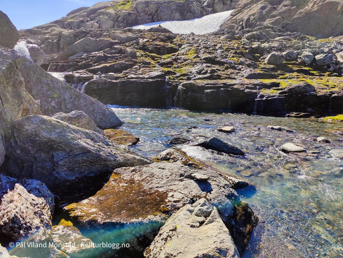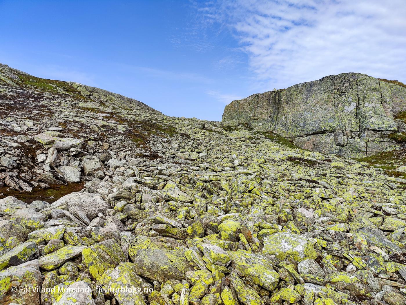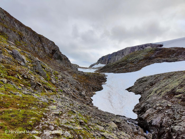 Oppe i det etter hvert bratte og smale skaret var det stor ur, og da mener jeg stor! Ganske krevende med tung sekk på ryggen. Midtveis i ura måtte i tillegg elva vades. Rødmerkingen viste at man burde krysse elva på nedsiden av en svær stein. Her gikk elva stri, så jeg fortsatte heller til oppsiden av steinen på leiting etter en bedre plass å krysse vannmassene. Der var det flatere, og lettere å se hvor man kunne sette beina i elva. Medbrakt regnbukse ble teipa stramt rundt fjellskoene. Jeg kommer alltid tørrskodd over elver med denne metoden, selv om vannet når knehøyde. Vel over elva var det et nytt parti med ur, før det flatet ut. Elva måtte krysses enda en gang lenger inne, men her var det flatt og mye lettere å komme over. Det gikk derfor greit uten regnbuksemetoden.