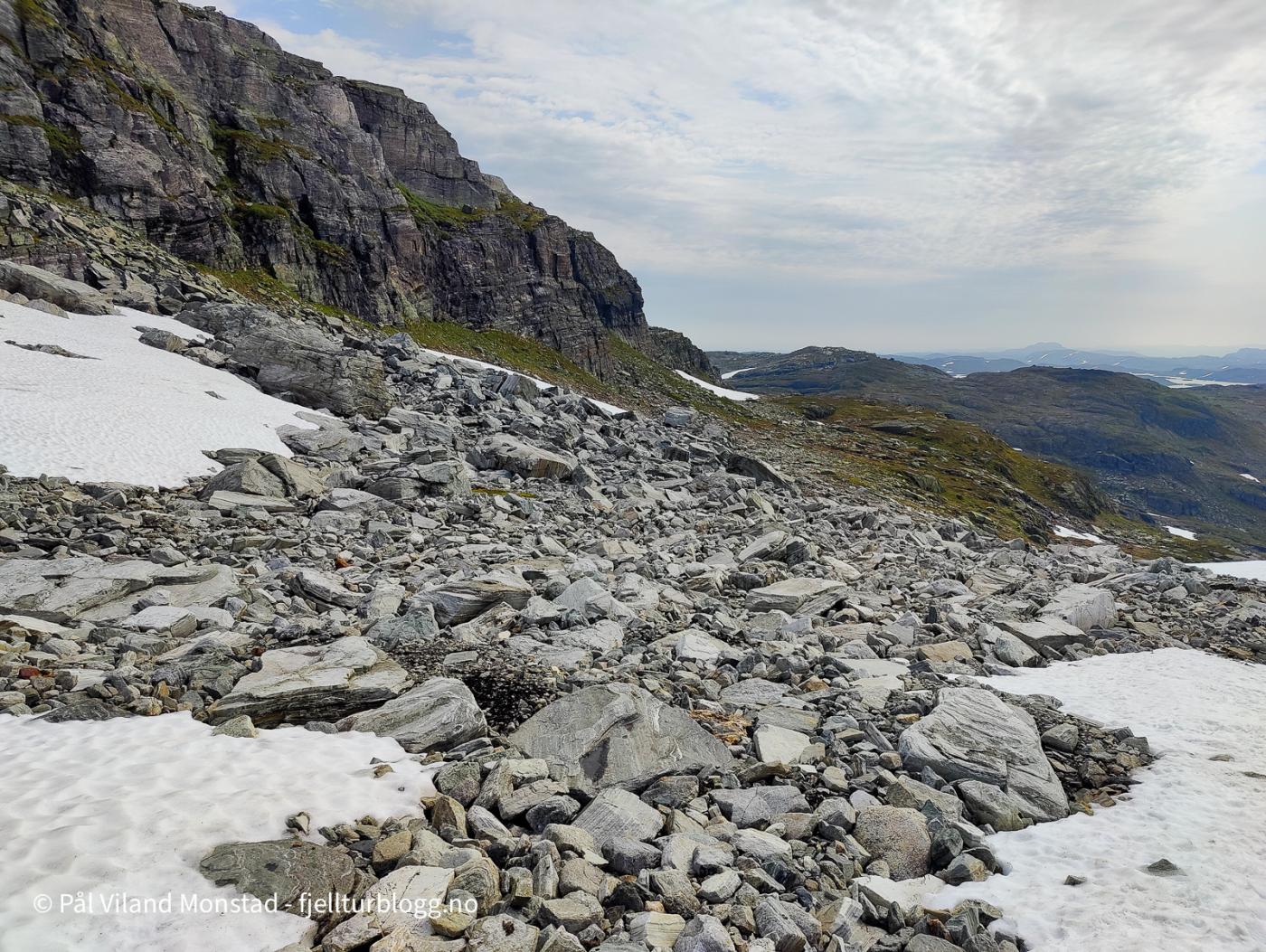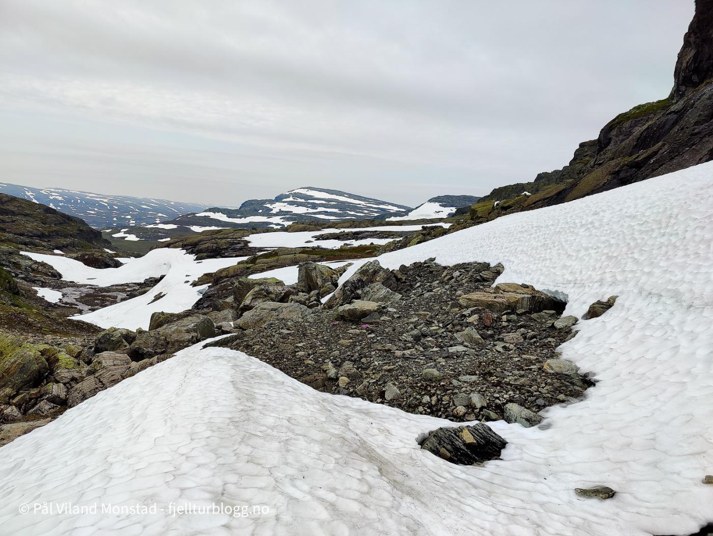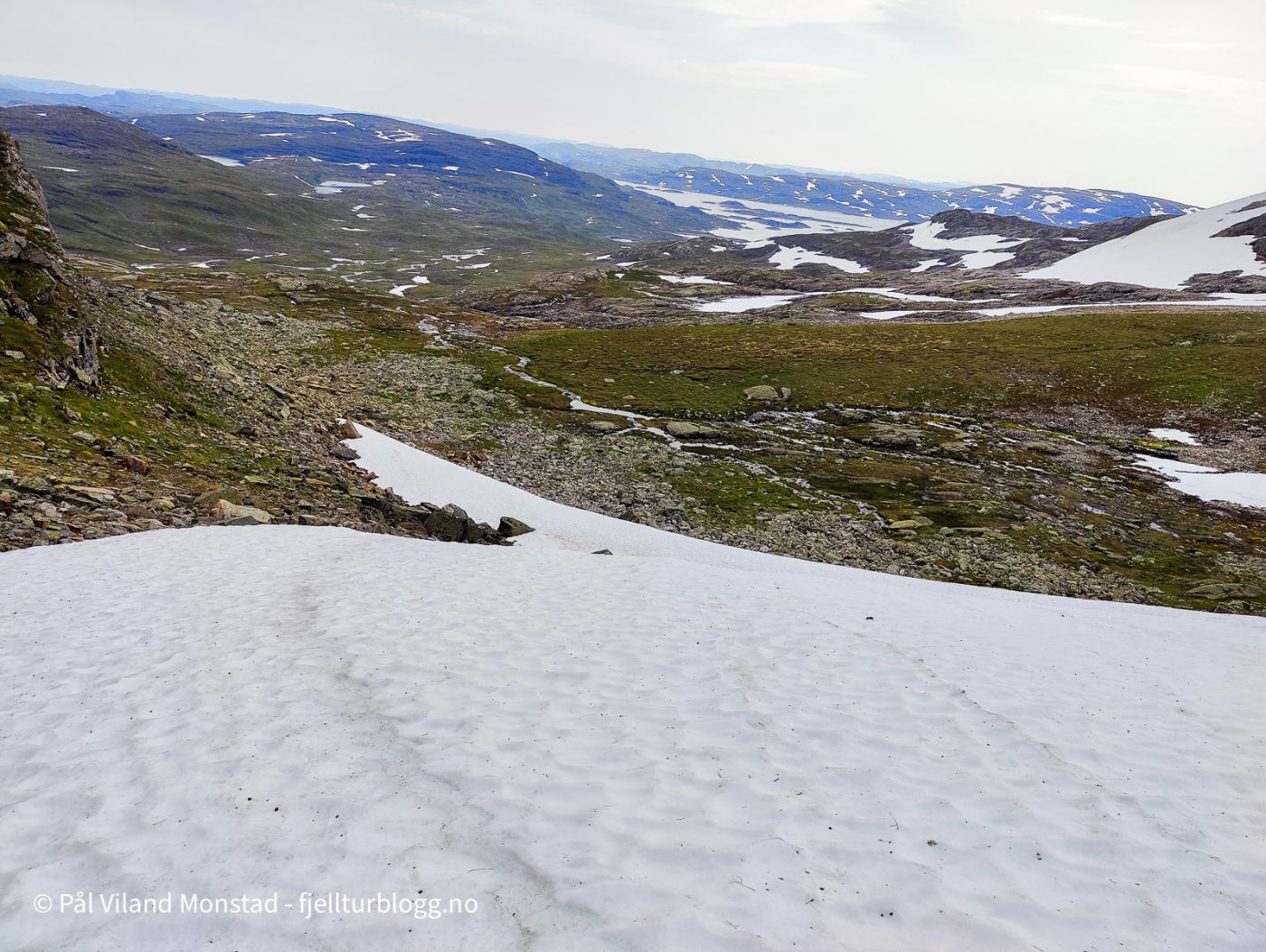 Dagen før hadde jeg passert et par halvstore varder på toppen av skaret, nordvest for topp 1412. Jeg regnet med at dette kanskje indikerte at det kunne være ei rute ned dette skaret. I alle fall valge jeg denne ruta. Ingen flere varder å se, men de kan ha vært skjult av den store fonna. Ganske bratt på snø øverst, men det ble slakere lenger nede, der fonn gikk over til ur. Jeg fulgte noen slake sva og flater i nordvestlig retning, hvor jeg også muligens kom inn på en dårlig nødla rute, før jeg dreide østover ned langs en bekk, til jeg kom ned på den flate dalbunnen hvor jeg også lett fant stien som førte i retning hytta ved Holmavatnet.