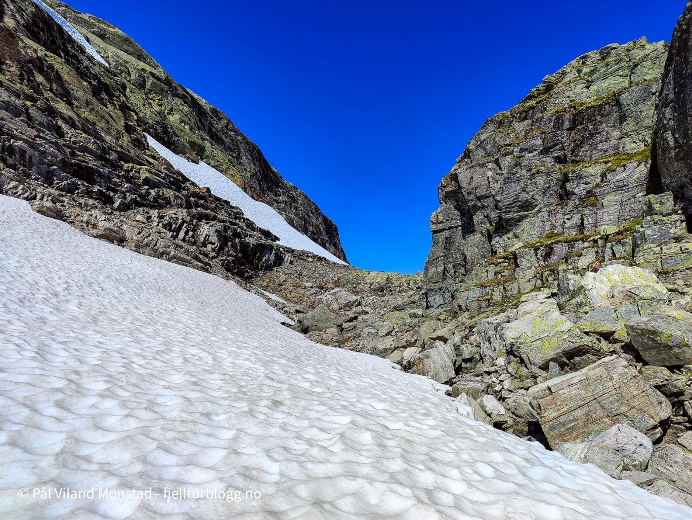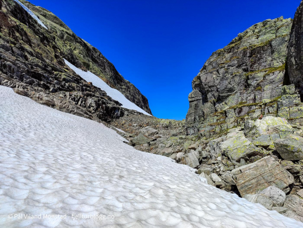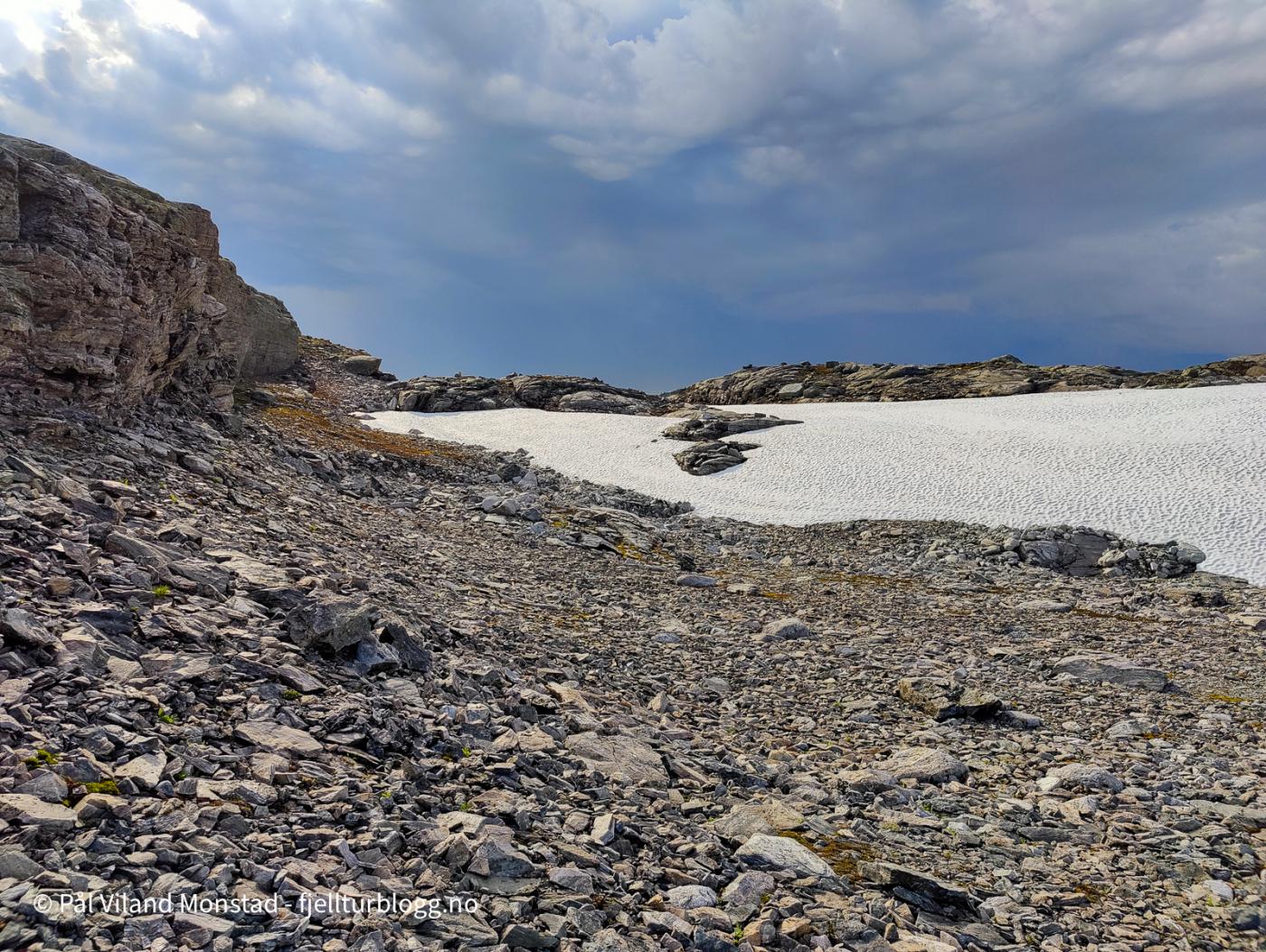 Dagen før hadde jeg passert et par halvstore varder på toppen av skaret, nordvest for topp 1412. Jeg regnet med at dette kanskje indikerte at det kunne være ei rute ned dette skaret. I alle fall valge jeg denne ruta. Ingen flere varder å se, men de kan ha vært skjult av den store fonna. Ganske bratt på snø øverst, men det ble slakere lenger nede, der fonn gikk over til ur. Jeg fulgte noen slake sva og flater i nordvestlig retning, hvor jeg også muligens kom inn på en dårlig nødla rute, før jeg dreide østover ned langs en bekk, til jeg kom ned på den flate dalbunnen hvor jeg også lett fant stien som førte i retning hytta ved Holmavatnet.