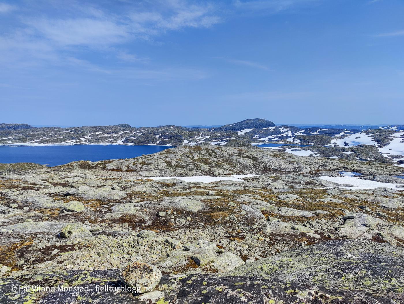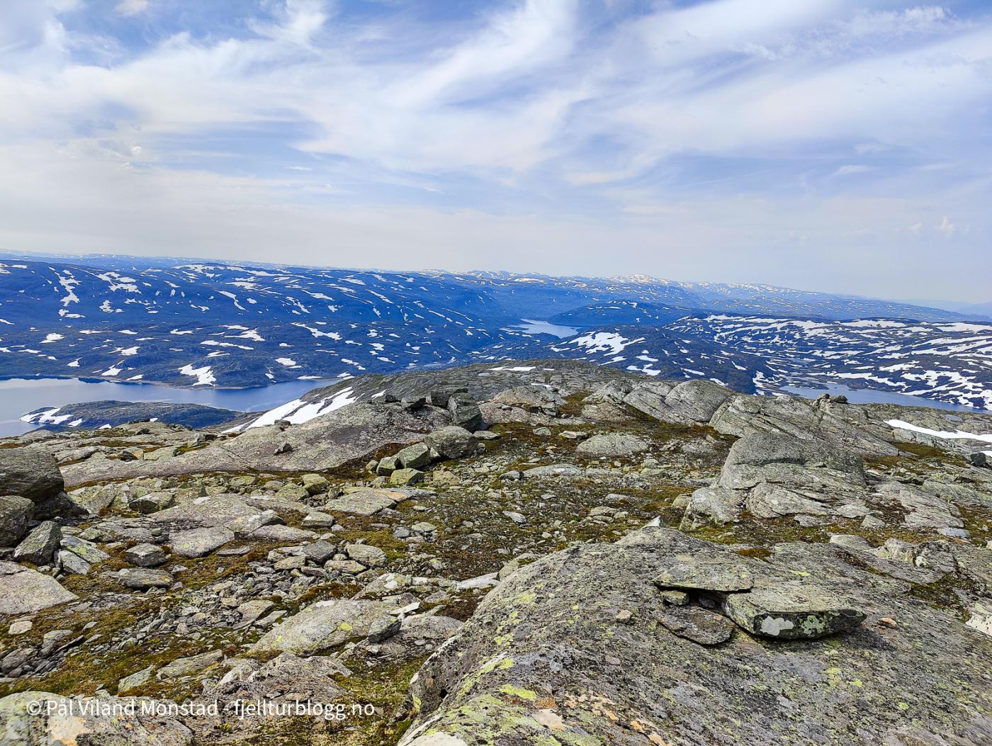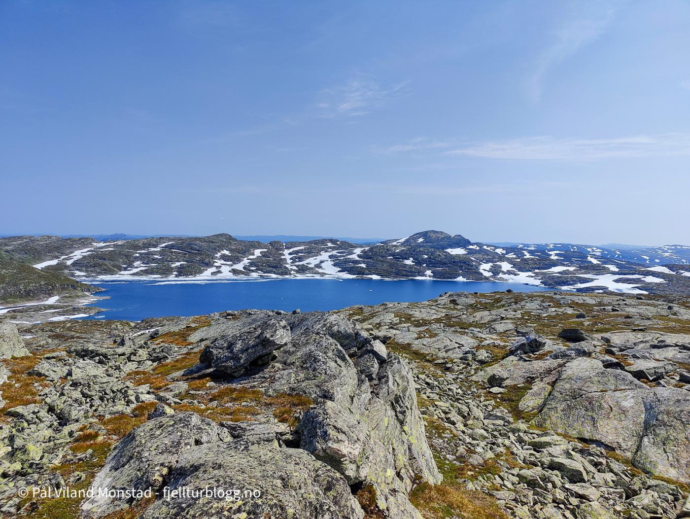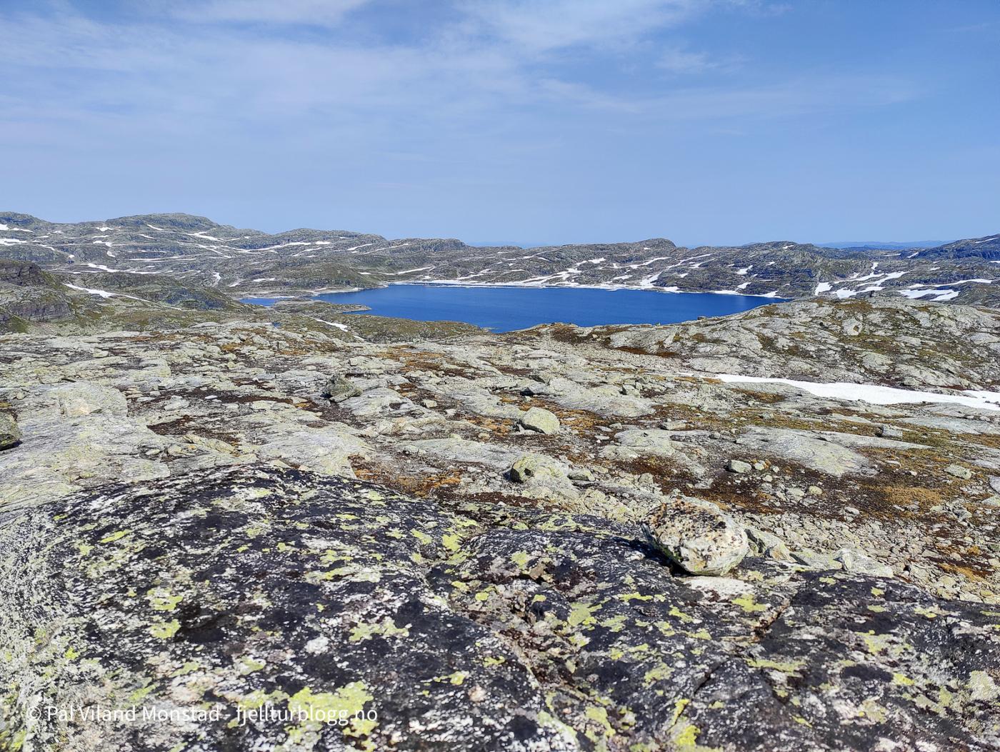 Oppholdet ved varden på toppen, 1504 moh, ble heller kortvarig. Særdeles kraftig vind gjorde det vanskelig å holde kamera i ro. Utsikten var derimot flott mot Holmavatnet og områdene rundt. Jeg tok stort sett samme vei tilbake til teltet. Etter å ha unnagjort lunsj, pakket teltet som nå var blitt tørt, satte jeg kursen ned mot Fitjaflatane, hvor Stavanger turistforening har hytte.