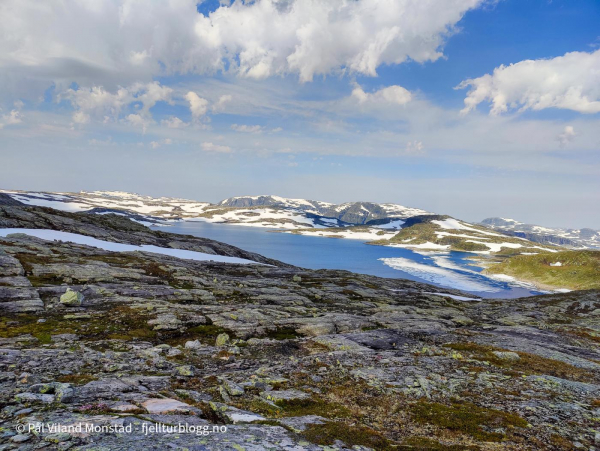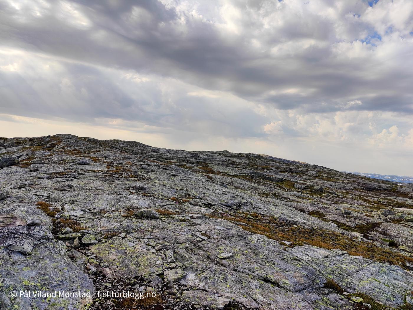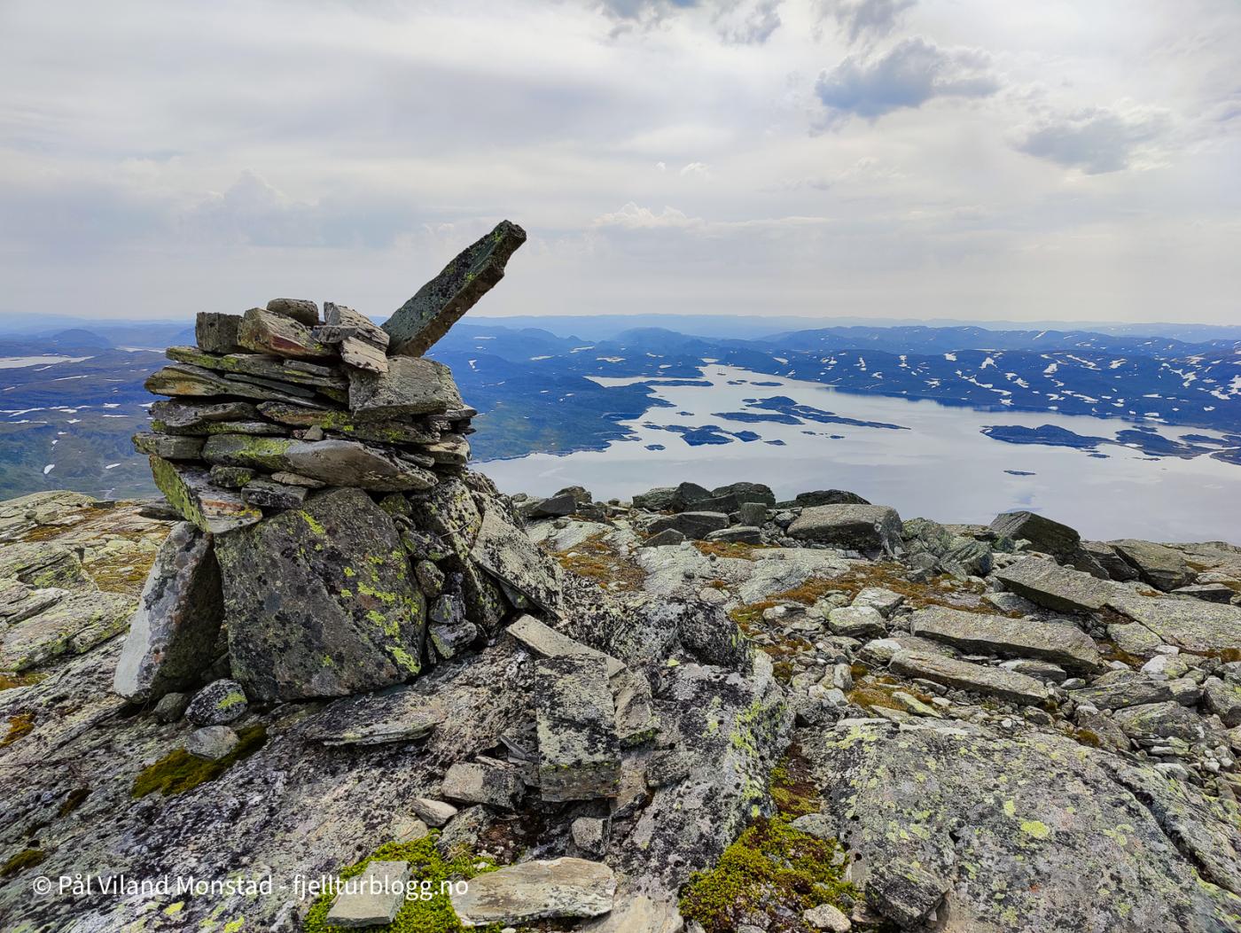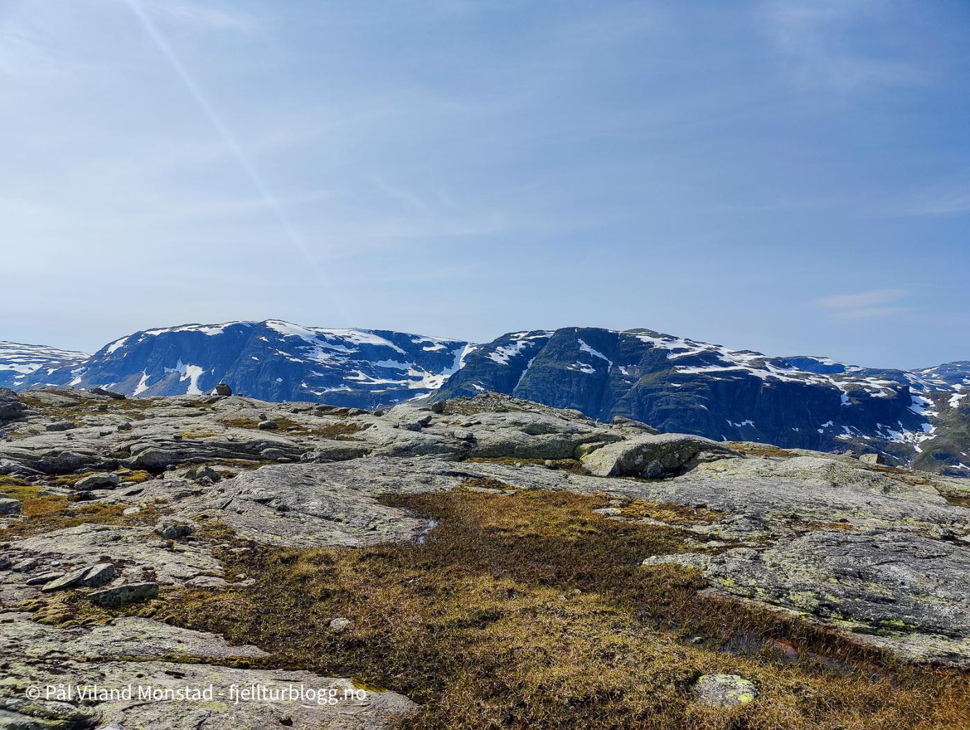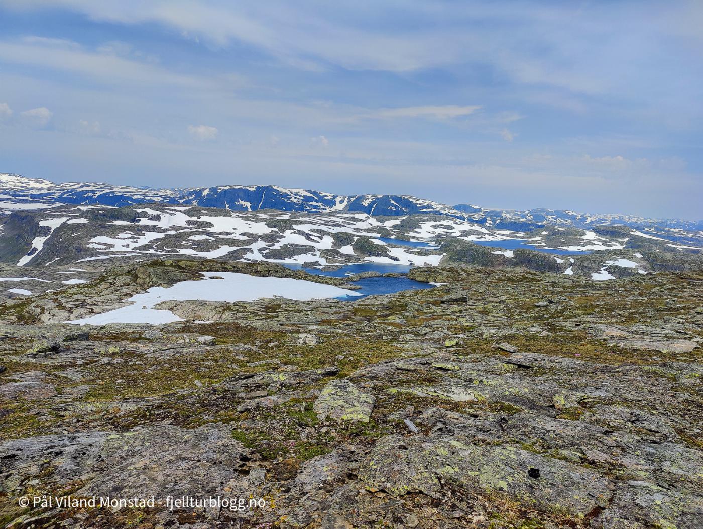 Oppholdet ved varden på toppen, 1504 moh, ble heller kortvarig. Særdeles kraftig vind gjorde det vanskelig å holde kamera i ro. Utsikten var derimot flott mot Holmavatnet og områdene rundt. Jeg tok stort sett samme vei tilbake til teltet. Etter å ha unnagjort lunsj, pakket teltet som nå var blitt tørt, satte jeg kursen ned mot Fitjaflatane, hvor Stavanger turistforening har hytte.