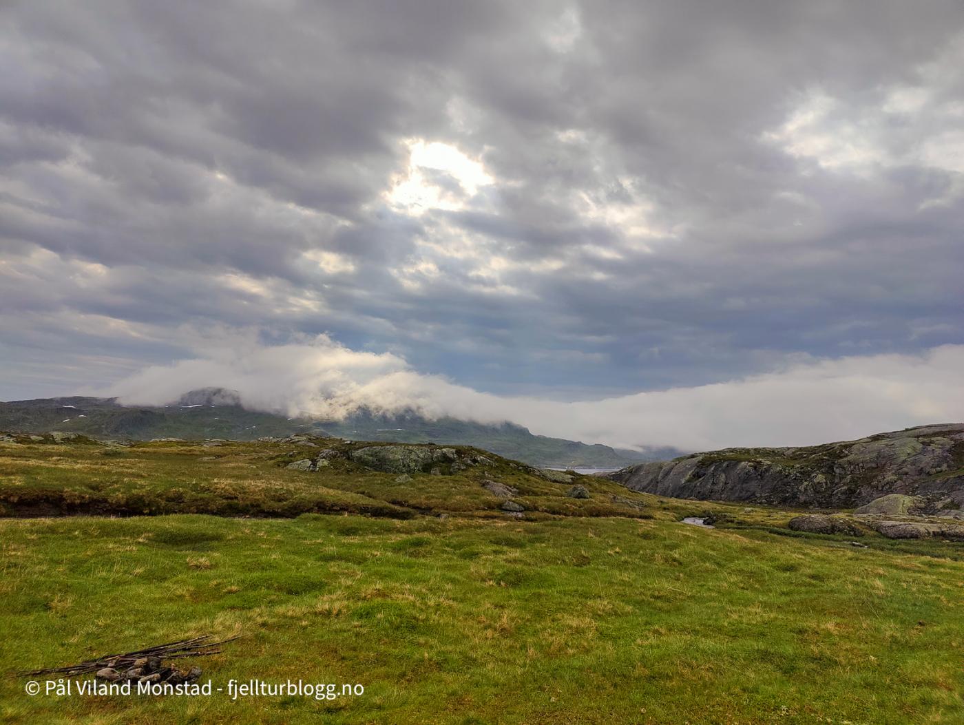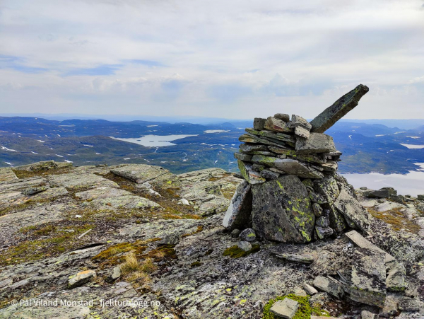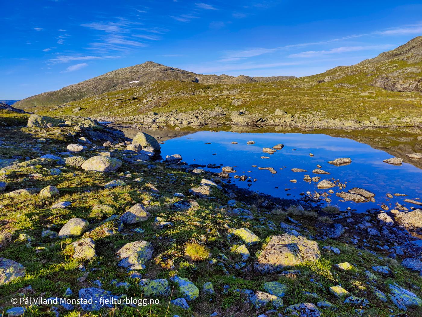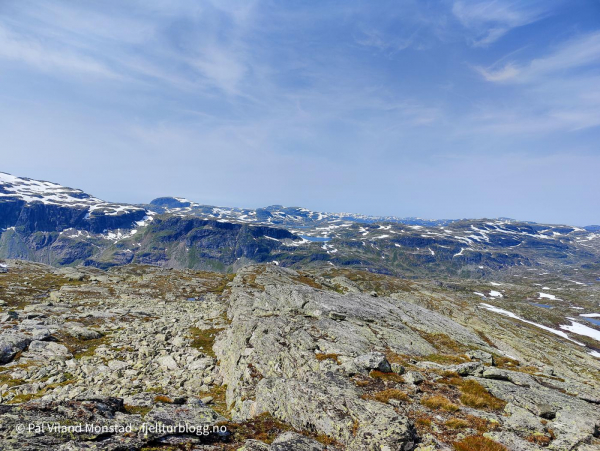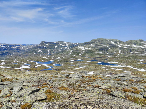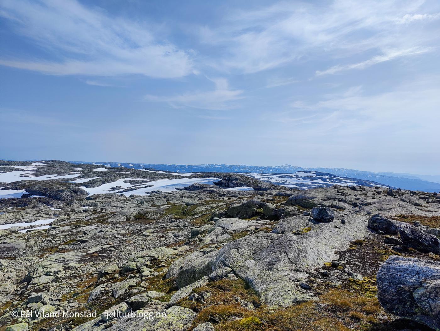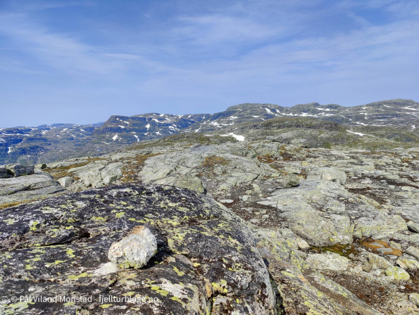 Oppholdet ved varden på toppen, 1504 moh, ble heller kortvarig. Særdeles kraftig vind gjorde det vanskelig å holde kamera i ro. Utsikten var derimot flott mot Holmavatnet og områdene rundt. Jeg tok stort sett samme vei tilbake til teltet. Etter å ha unnagjort lunsj, pakket teltet som nå var blitt tørt, satte jeg kursen ned mot Fitjaflatane, hvor Stavanger turistforening har hytte.