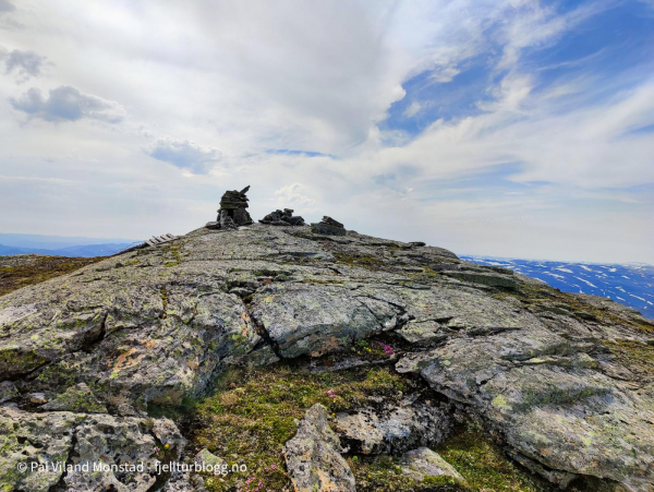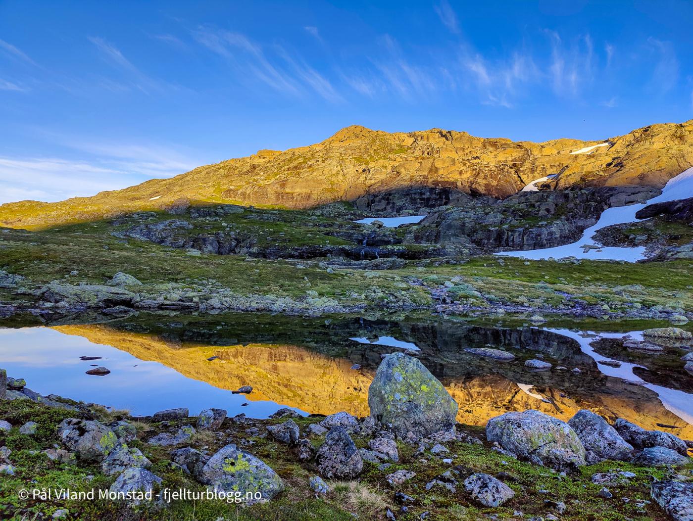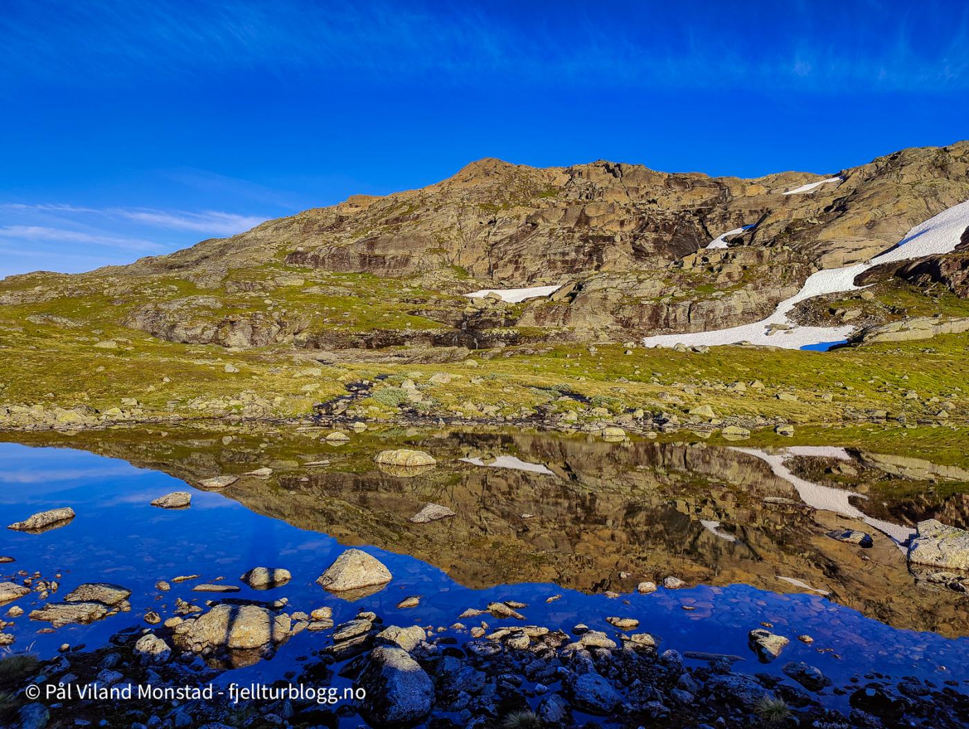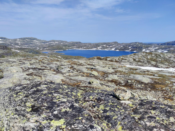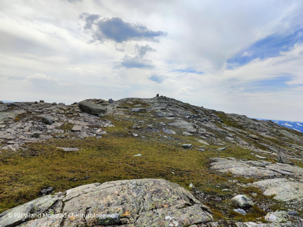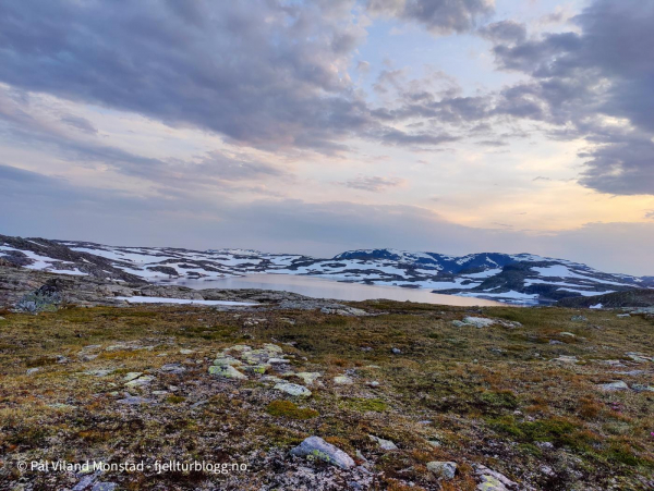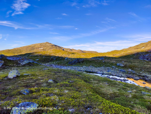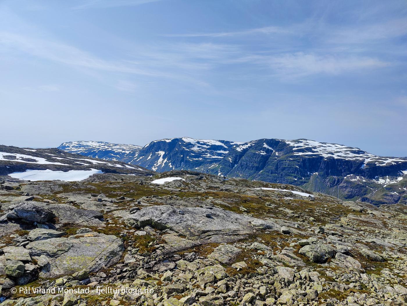 Oppholdet ved varden på toppen, 1504 moh, ble heller kortvarig. Særdeles kraftig vind gjorde det vanskelig å holde kamera i ro. Utsikten var derimot flott mot Holmavatnet og områdene rundt. Jeg tok stort sett samme vei tilbake til teltet. Etter å ha unnagjort lunsj, pakket teltet som nå var blitt tørt, satte jeg kursen ned mot Fitjaflatane, hvor Stavanger turistforening har hytte.