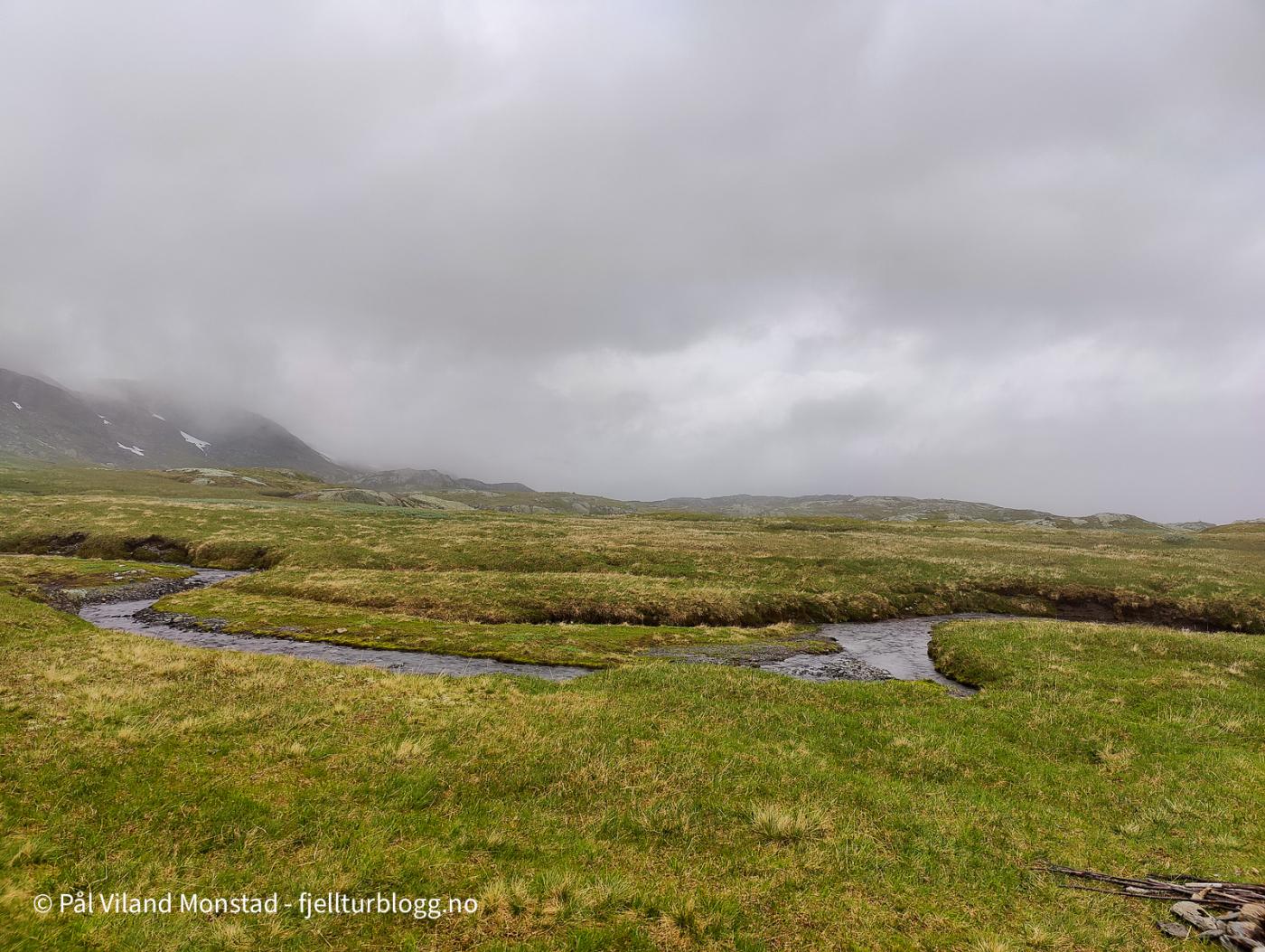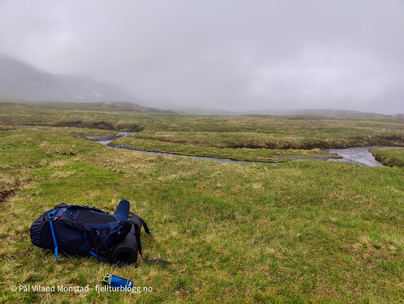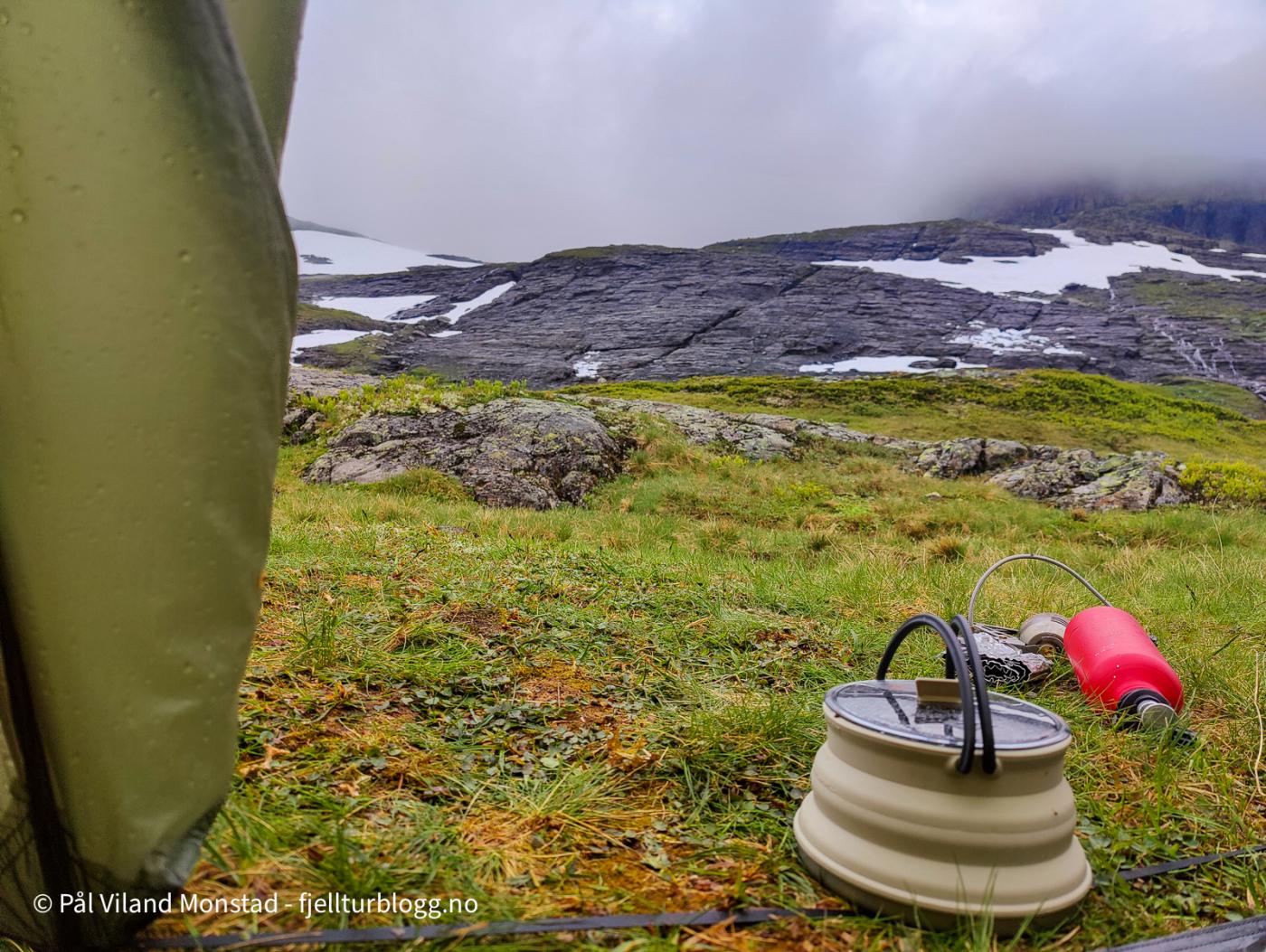 Jeg hadde ikke sovet særlig lenge, for rundt klokka 23 våkna jeg av regn på teltduken. Regnet kom og gikk gjennom hele natta, med ganske kraftige byger. Særlig på morgenkvisten regna det godt, og jeg så for meg en regntung dag tilbake mot Turistskaret.