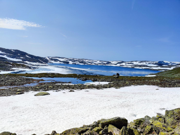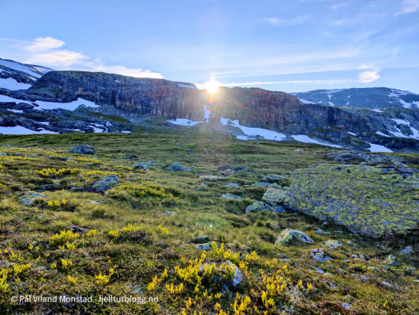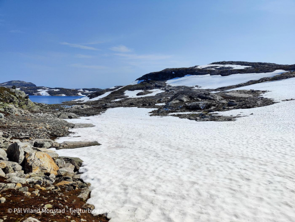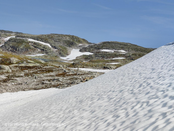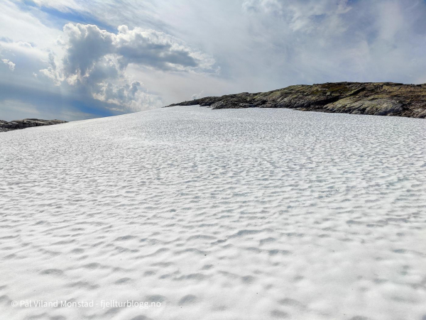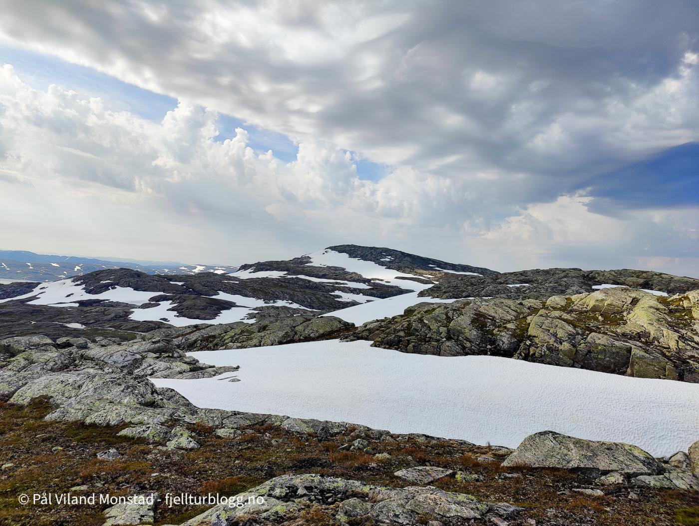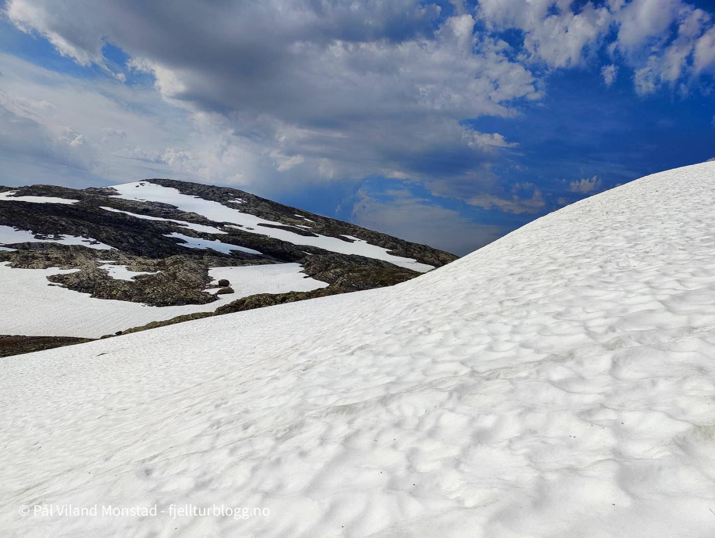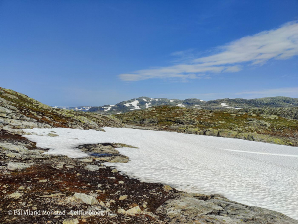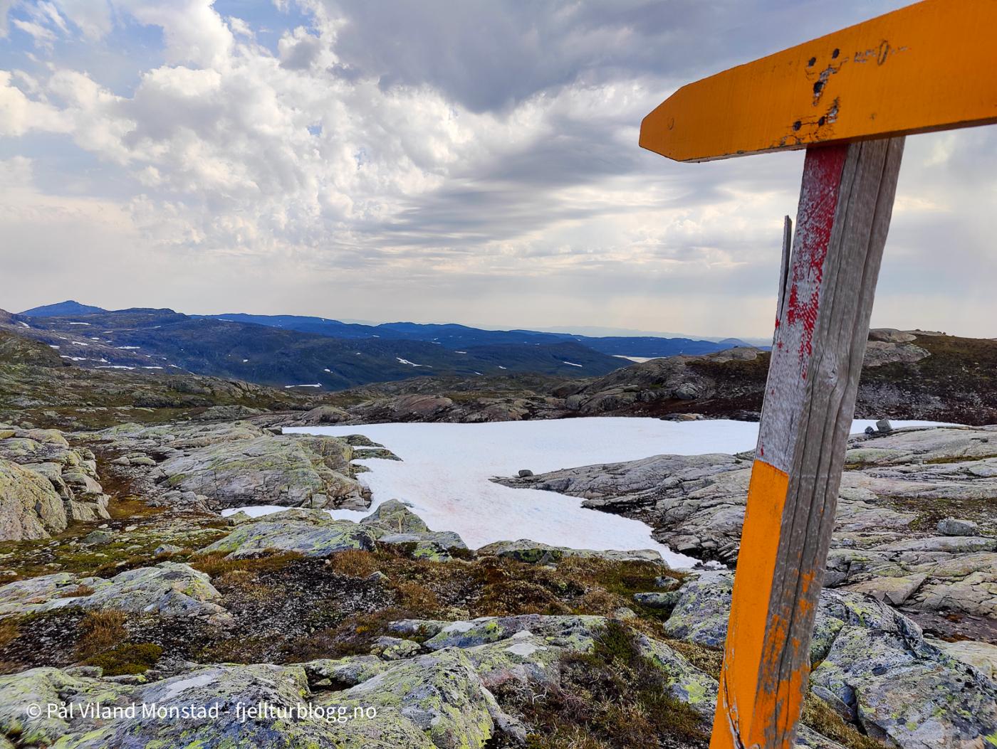 I løpet av natta hadde det kommet noe regn, og på morgenkvisten var det fortsatt noen truende skyer. Heldigvis var det høyt skydekke, og tegn på at det var i ferd med å sprekke opp. Når kaffe og frokost var unnagjort ble sekken klargjort for en ny topptur, Fitjanuten 1504 moh. Toppen lå i luftlinje ca 2,5 kilometer sør for teltplassen, så det var bare å legge i vei. Etter å ha krysset et lkite skar, bar det over lettgått snaufjell. Kartet viste at det skulle være et dalfør på veien, men også her lurte kartet meg aldri så lite. Dalføret var mye større enn jeg hadde trodd, og det ble ellers visse utfordringer med bratte snøfonner og tversgående skar. Jeg kom meg både ned i dalbunnet og opp mot toppen på andre siden. Nede i dalbunnen traff jeg forresten på en påle med gul pil pekende i begge retninger. Jeg kunne se flere slike staker lenger sørøst. Hva dette er for en trase er ikke godt å si, men ut fra plasseringene kunne det se ut til å være en vinterrute mer enn en sommerrute. Mulig det er en rute til Djupetjørnane og lukehuset Røldal/Suldal kraft har der. Fra dalbunnen og opp var det ganske slakt og lettgått. Sva og snøfonner om hverandre, men aldri direkte bratt.