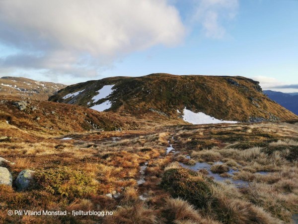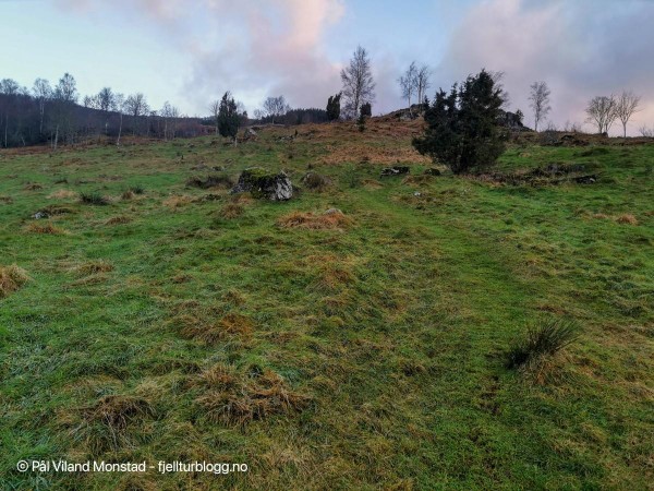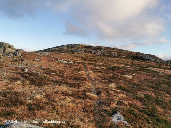Turen østover mot målet var småkupert, i form av flere daler og småtopper. Likevel lettgått på vekselvis grasmark, berg og lav lyng. Det var dessuten et virvar av dyretråkk og stier, der i alle fall en del så ut til å ha retning målet.